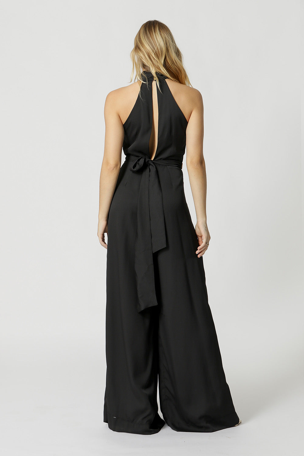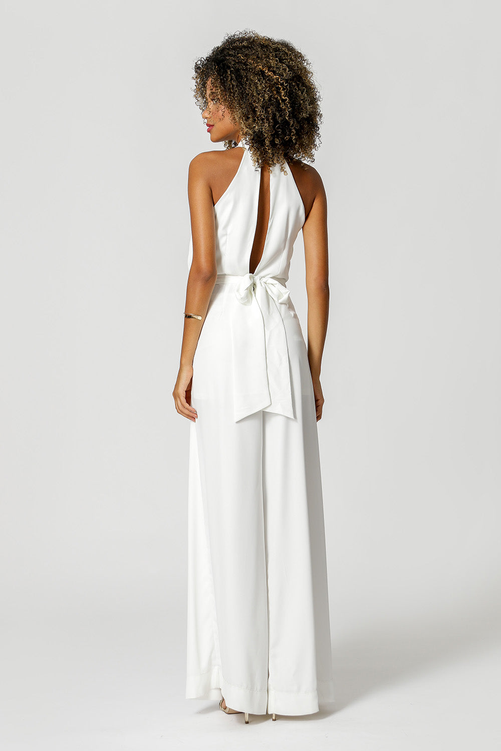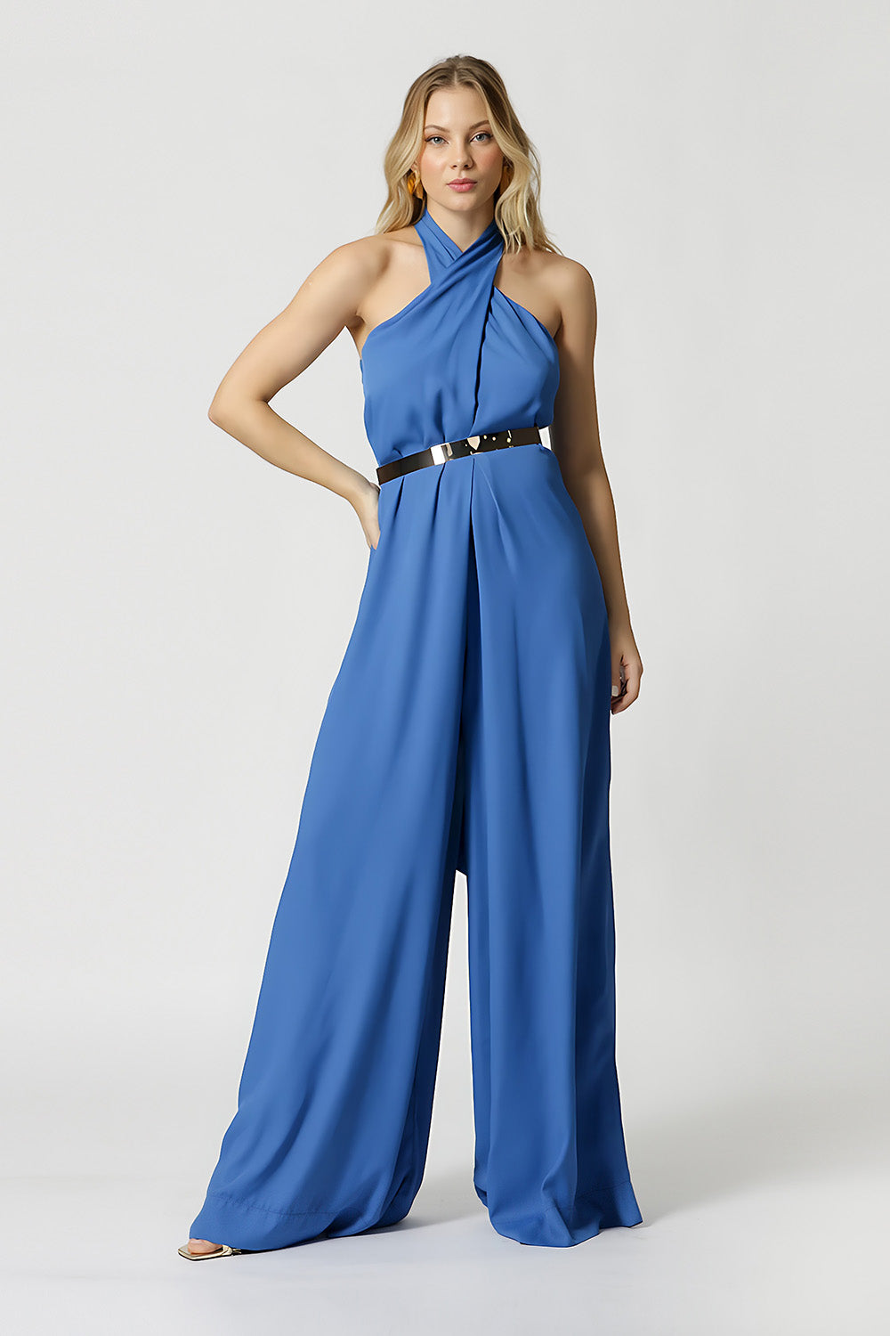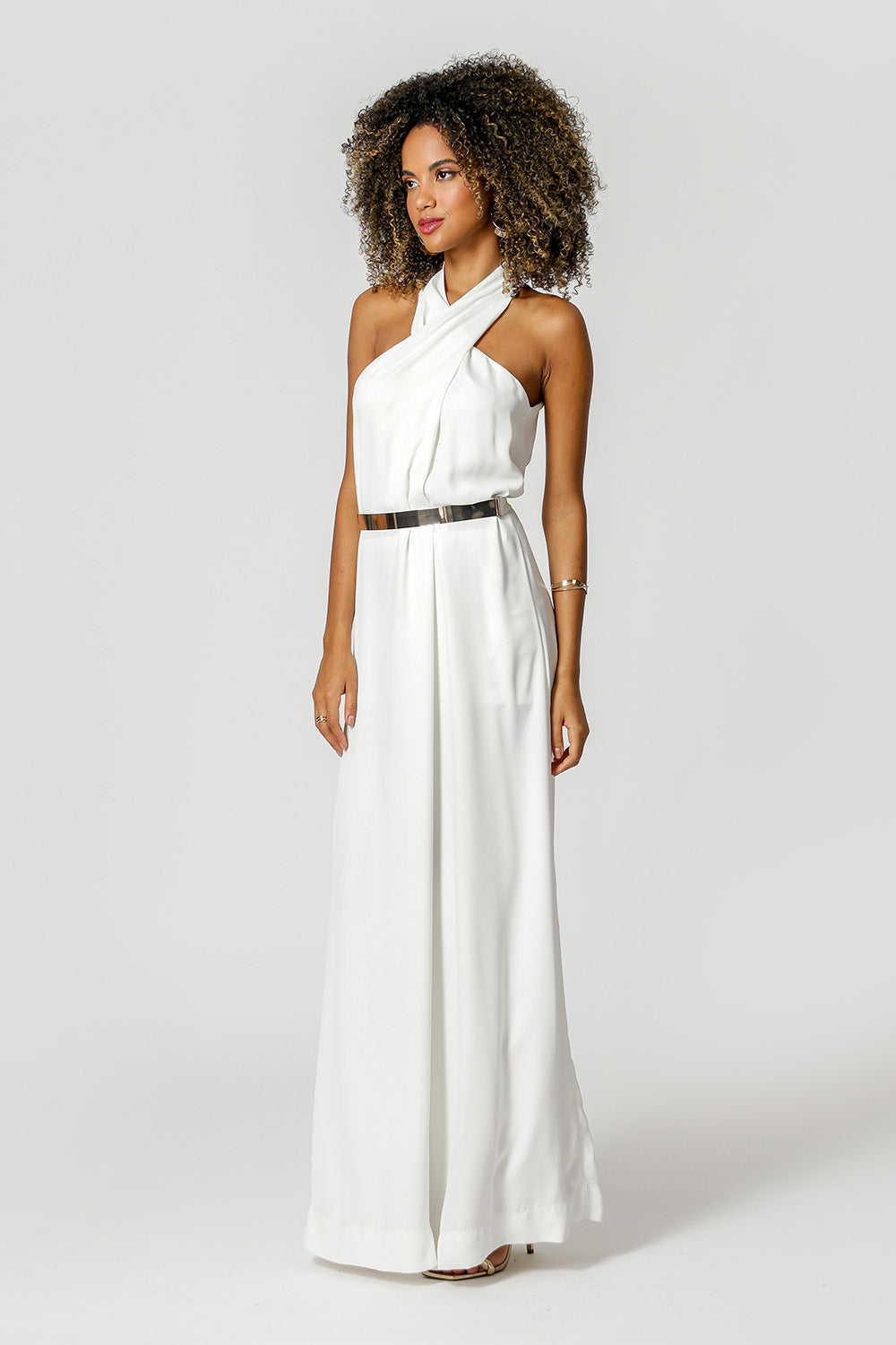 Macacão longo com decote transpassado e detalhe de faixa na cintura do próprio tecido junto com metal preso. Confeccionado em tecido crepe fluído. Um modelo super elegante, sofisticado e ideal para usar no mood night aposte.