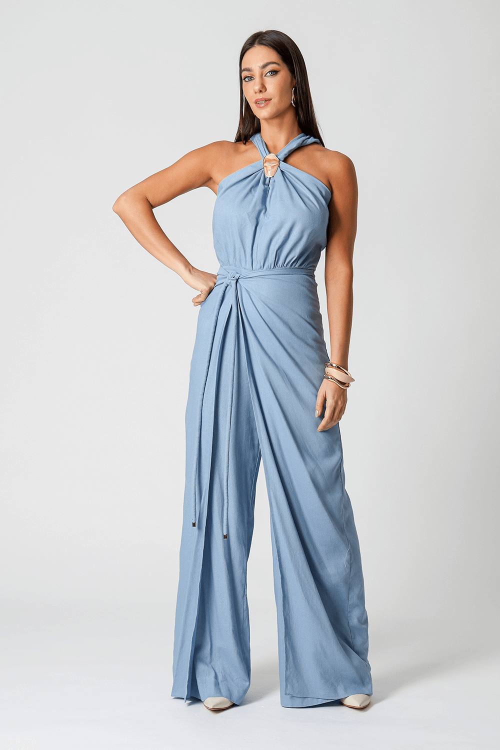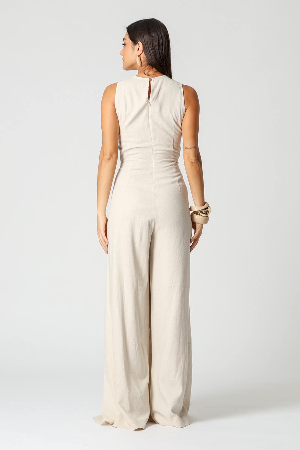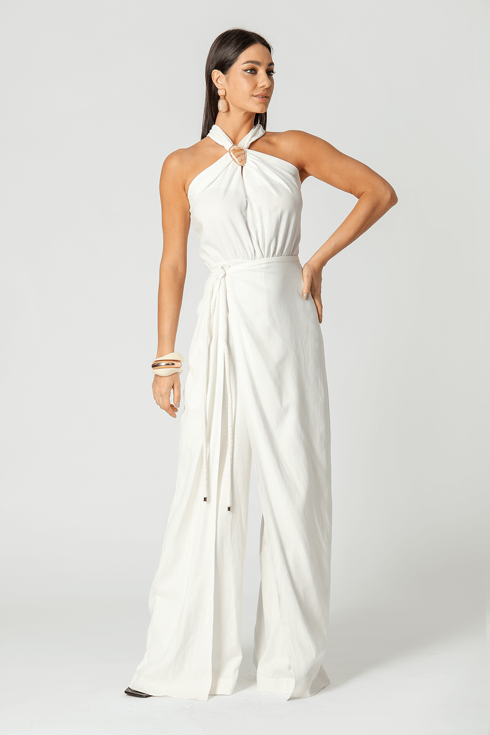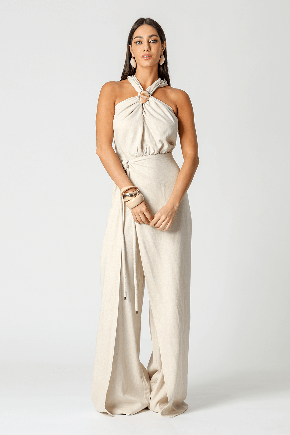 Macacão pantalona em linho viscose com transpasse frontal e amarração com ponteiras. Possui decote cruzado adornado com aviamento marmorizado e detalhe dourado, garantindo um visual moderno e elegante. Caimento leve e sofisticado.