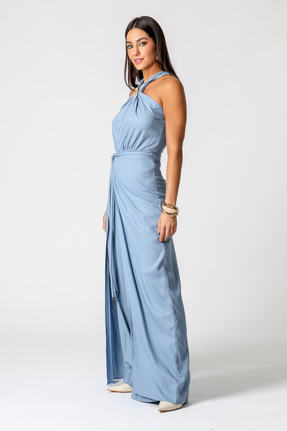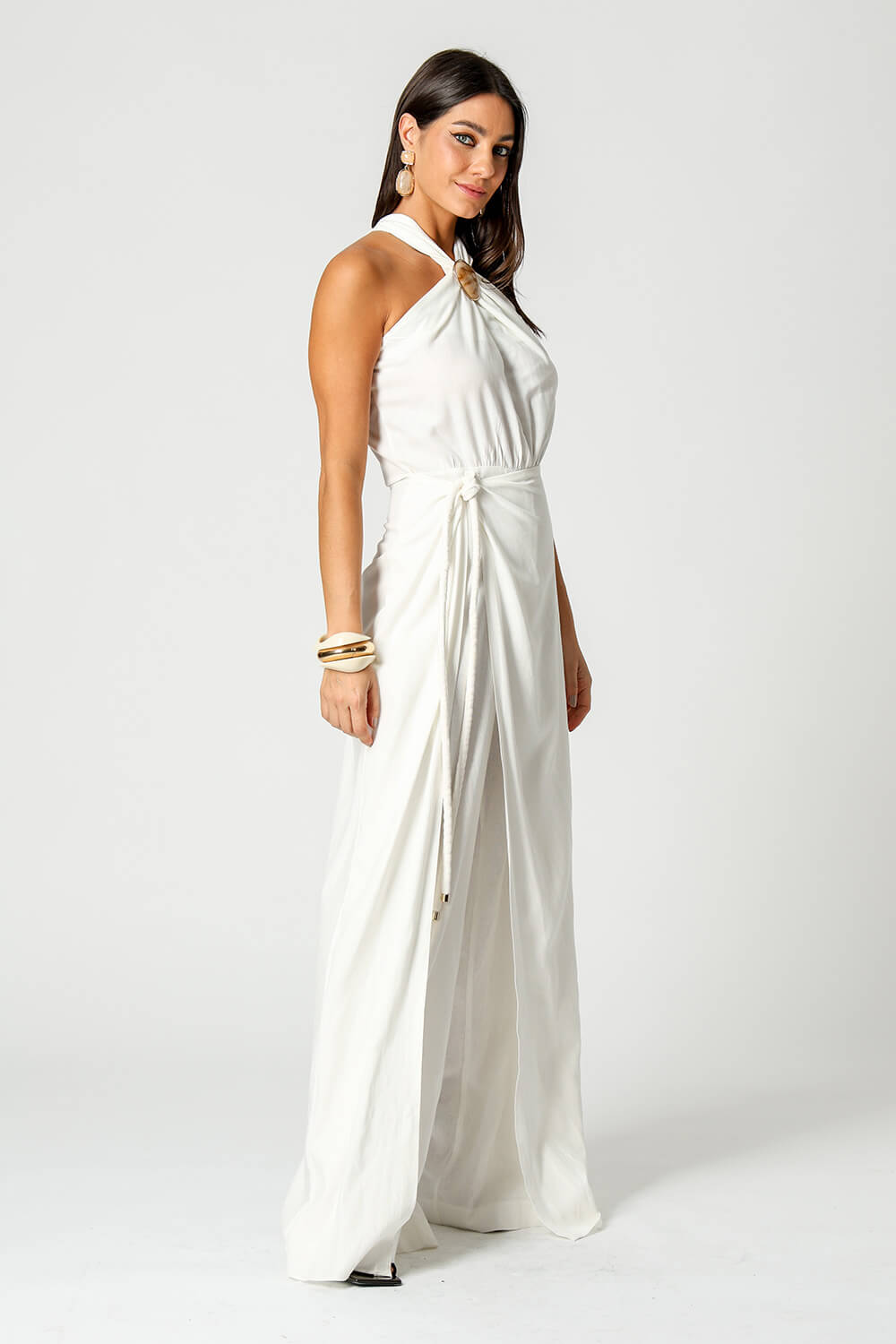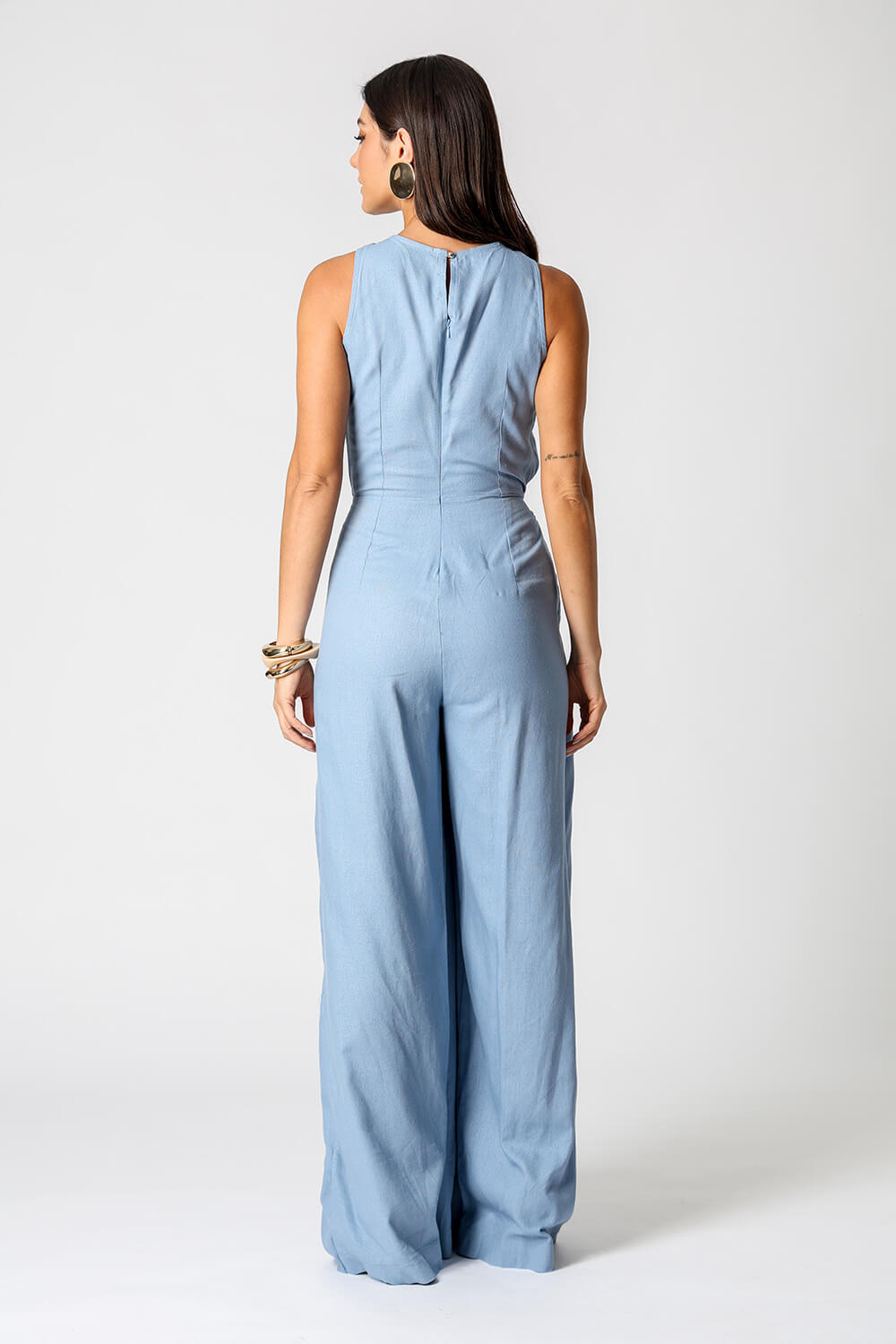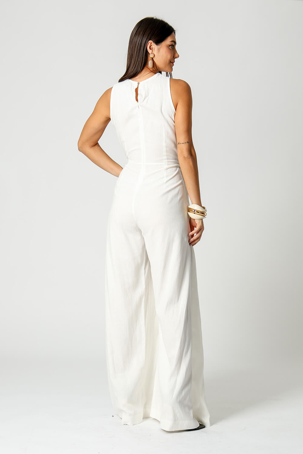 Macacão pantalona em linho viscose com transpasse frontal e amarração com ponteiras. Possui decote cruzado adornado com aviamento marmorizado e detalhe dourado, garantindo um visual moderno e elegante. Caimento leve e sofisticado.