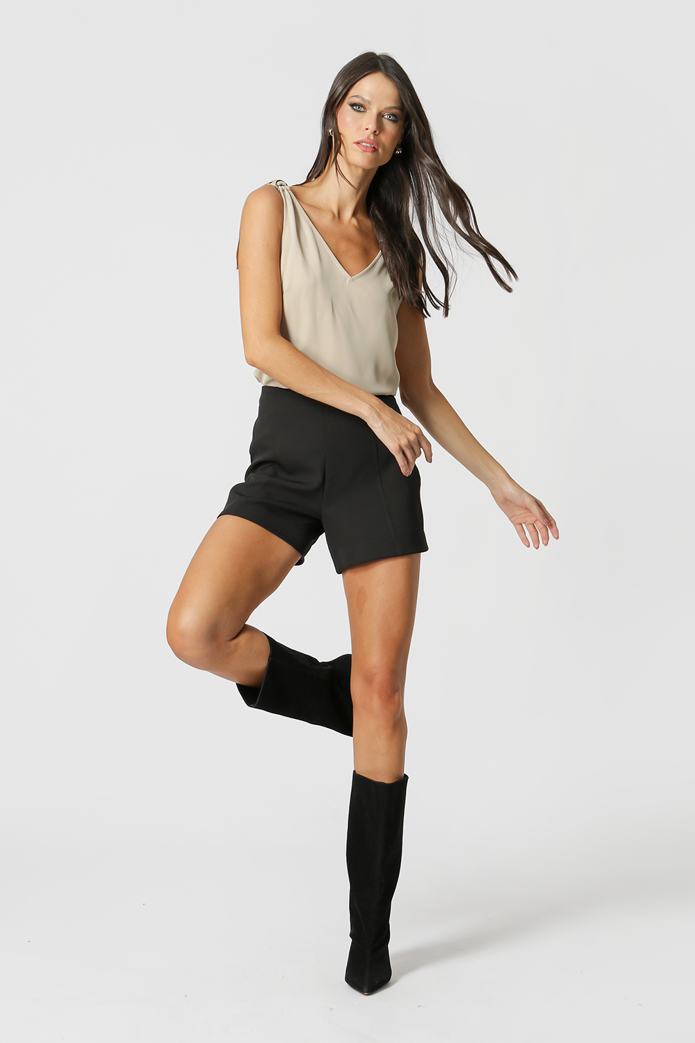 Regata com modelagem soltinha, decote em V e detalhe nos ombros com argolas. É a combinação perfeita entre estilo e conforto. Incrível para combinar com looks do dia a dia.