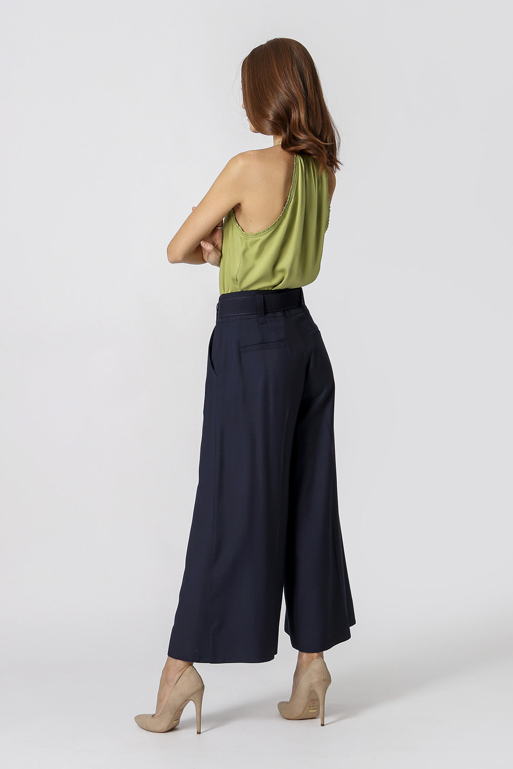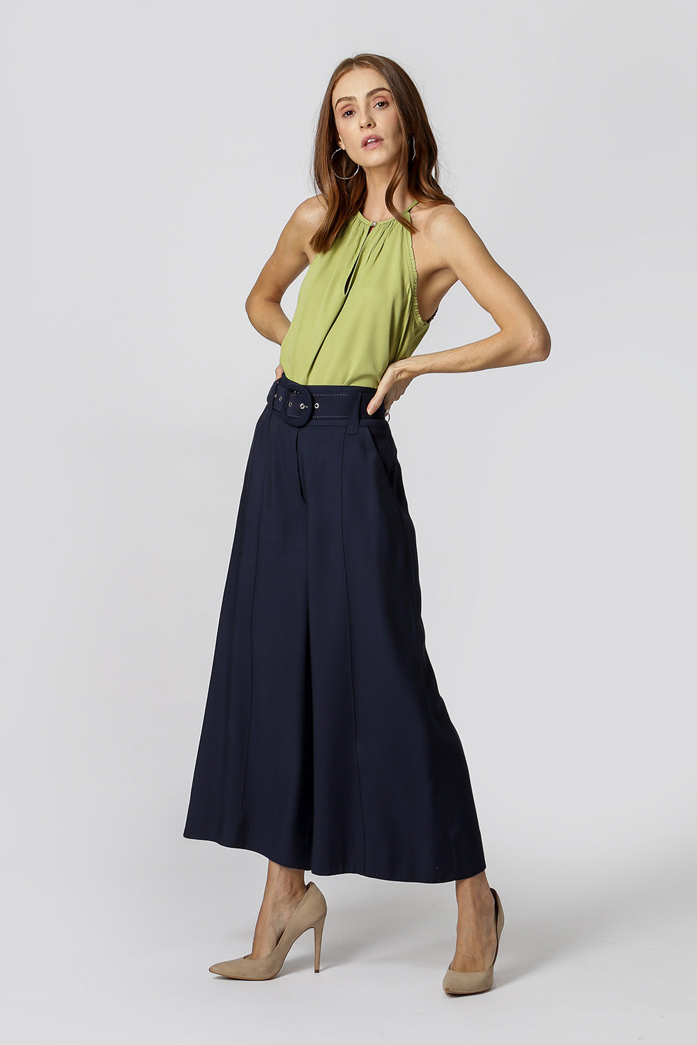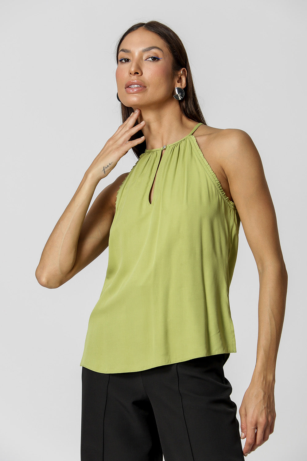 Regata com cava americana, feita em viscose fluída, com um rico e delicado detalhe de babados em pregas, com um botão de metal niquelado com strass, podendo ser usado tanto frente quando costas.