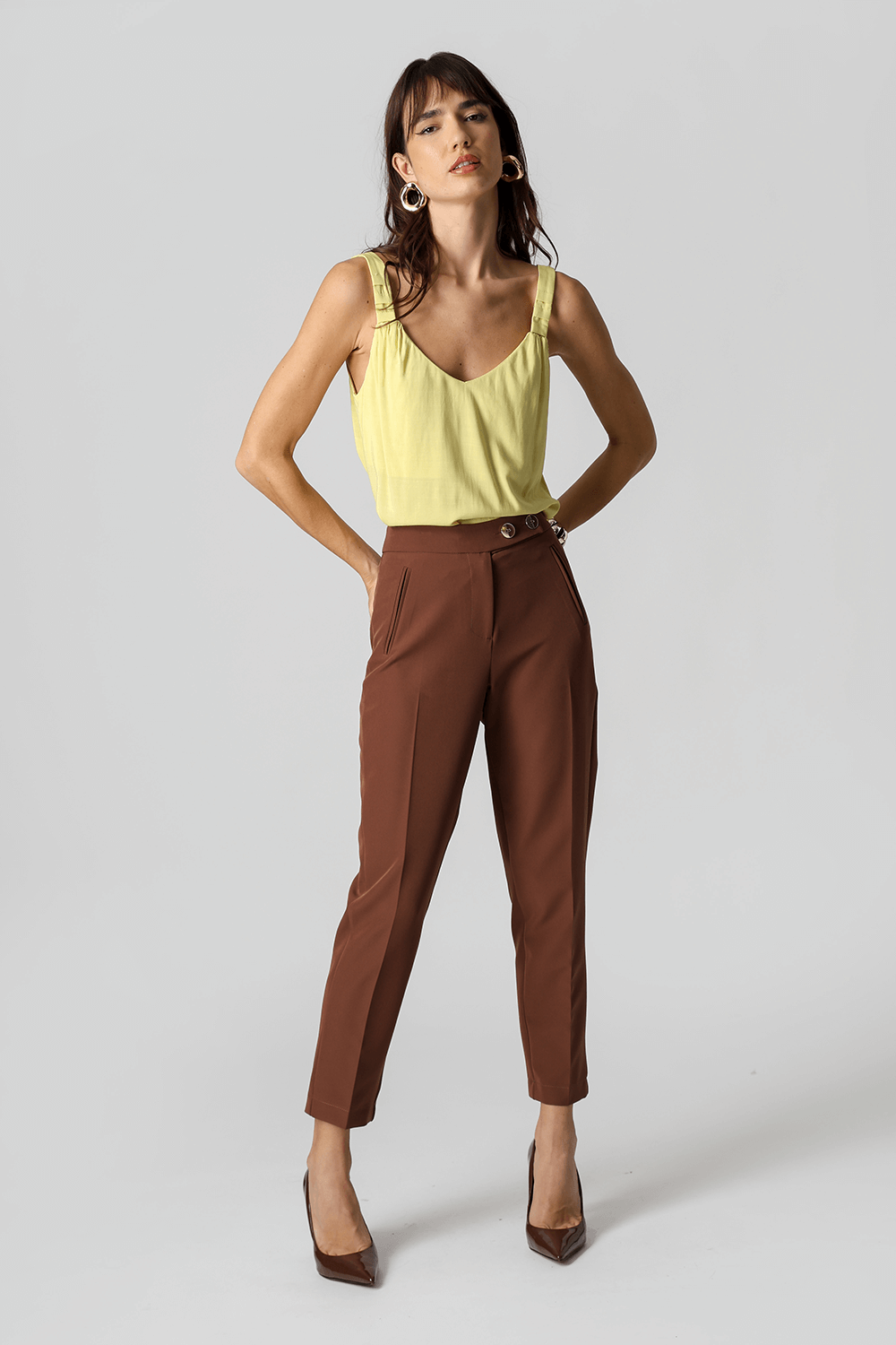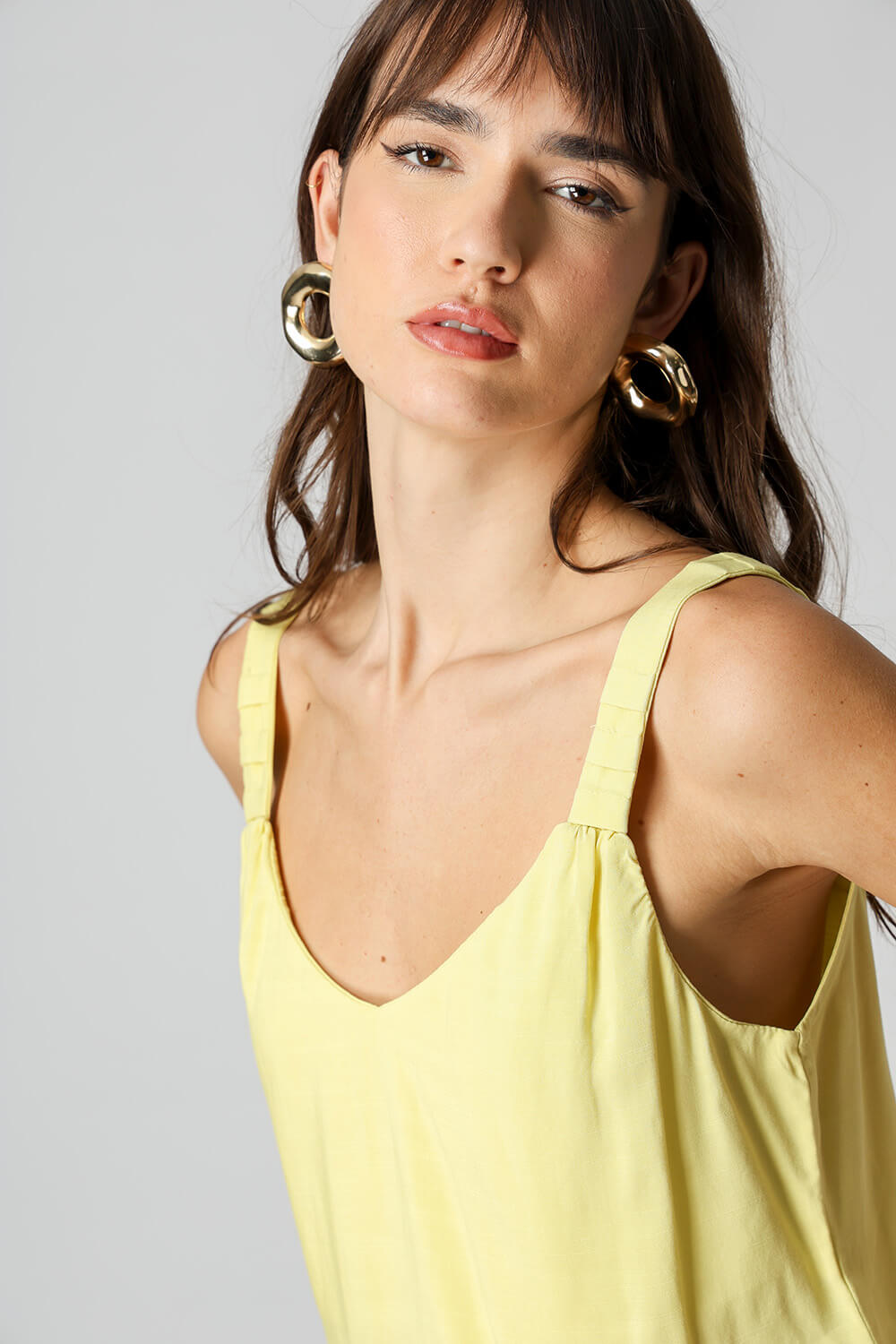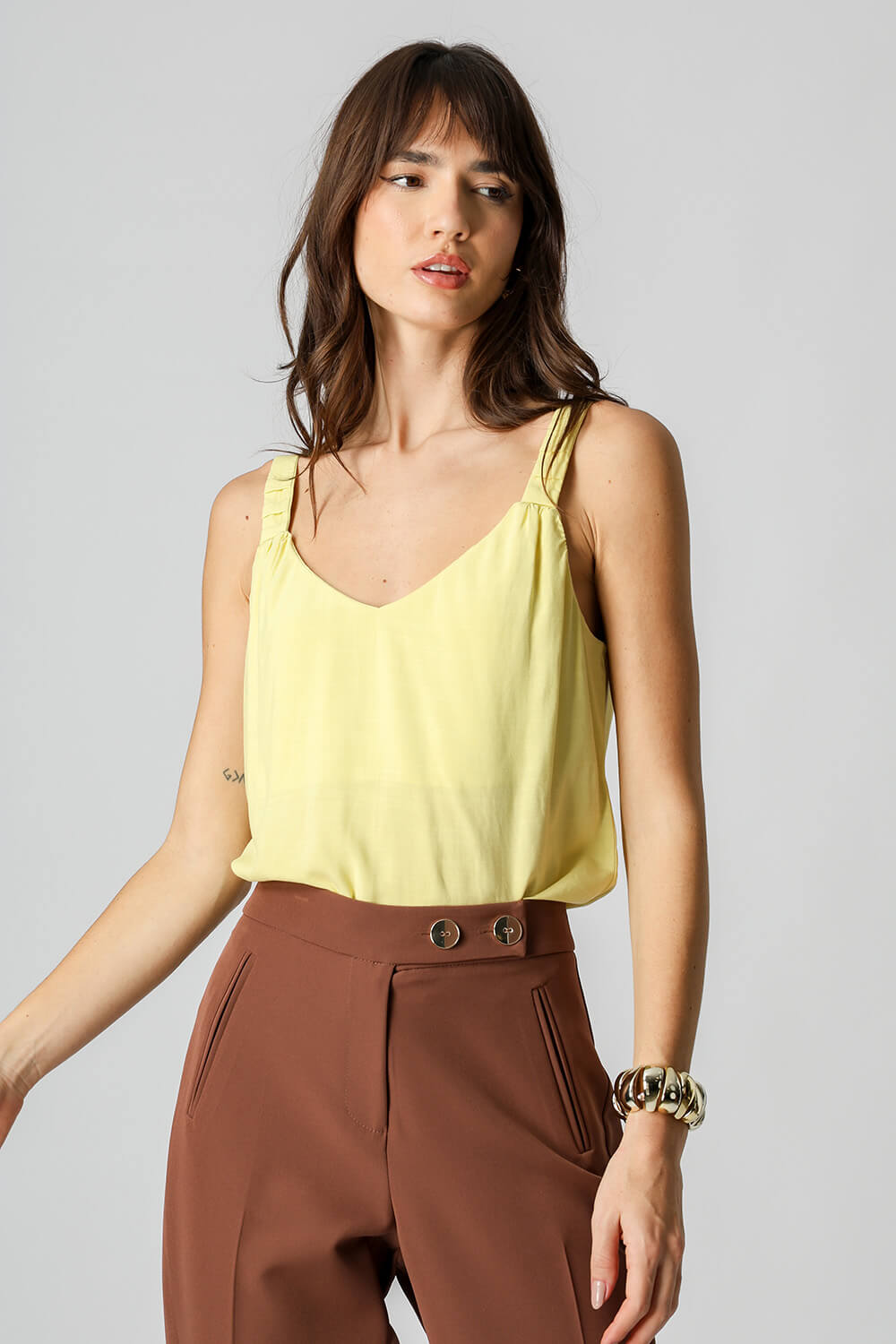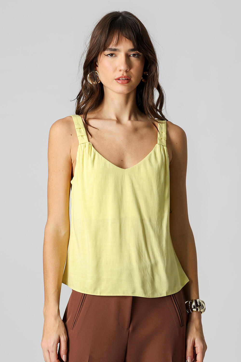 Regata com detalhe de pregas na alça. Peça confeccionada no tecido Viscose Fluída. Uma peça básica casual e fluída, ideal para os dias de verão.