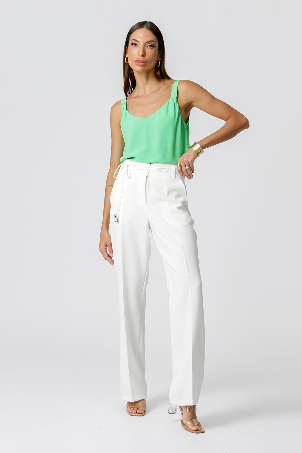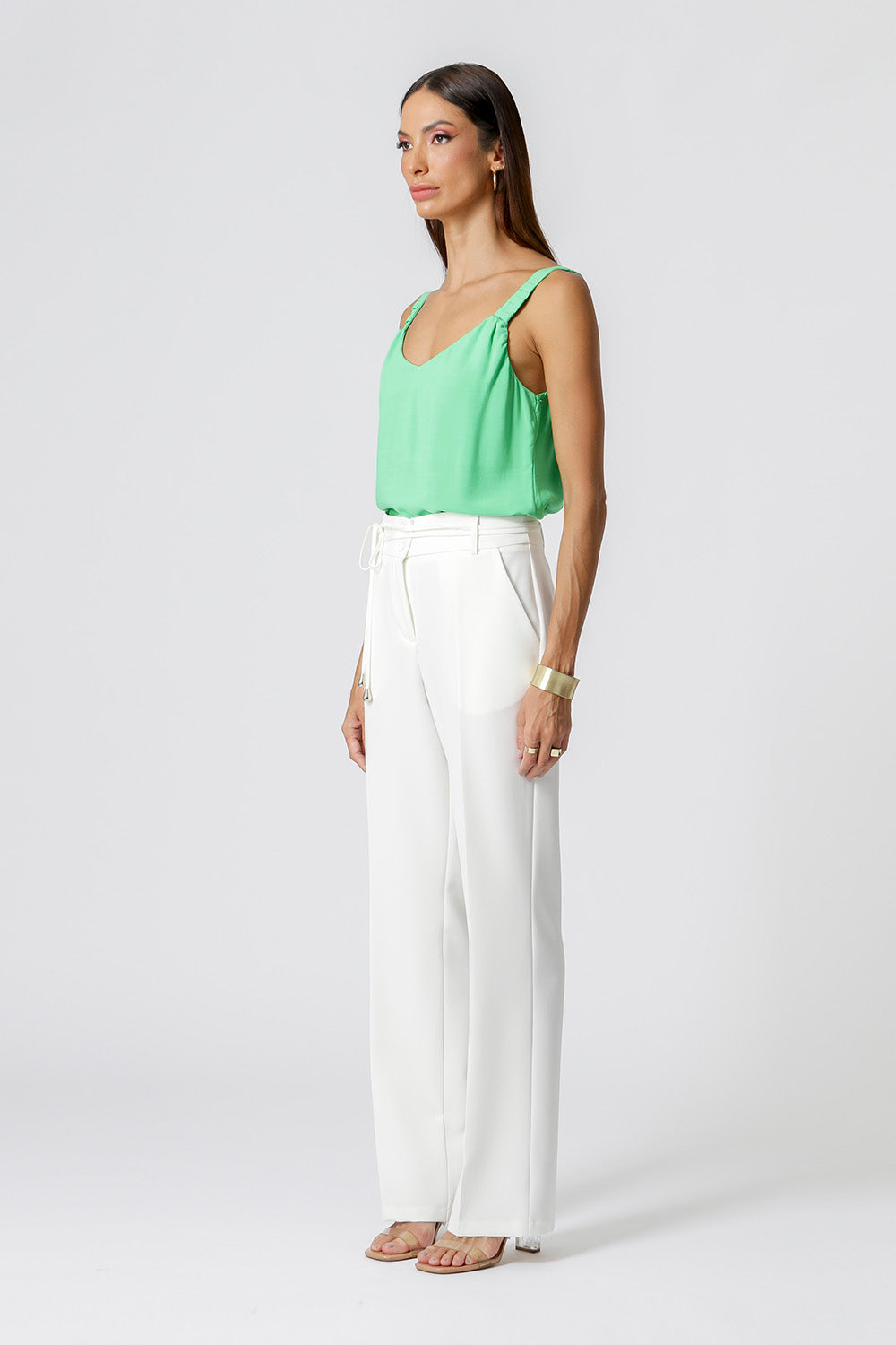 Regata com detalhe de pregas na alça. Peça confeccionada no tecido Viscose Fluída. Uma peça básica casual e fluída, ideal para os dias de verão.