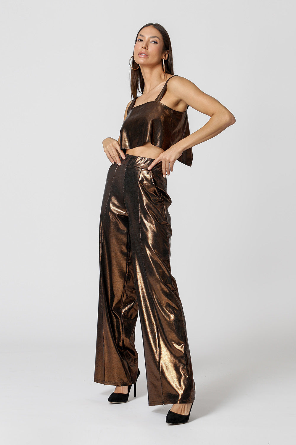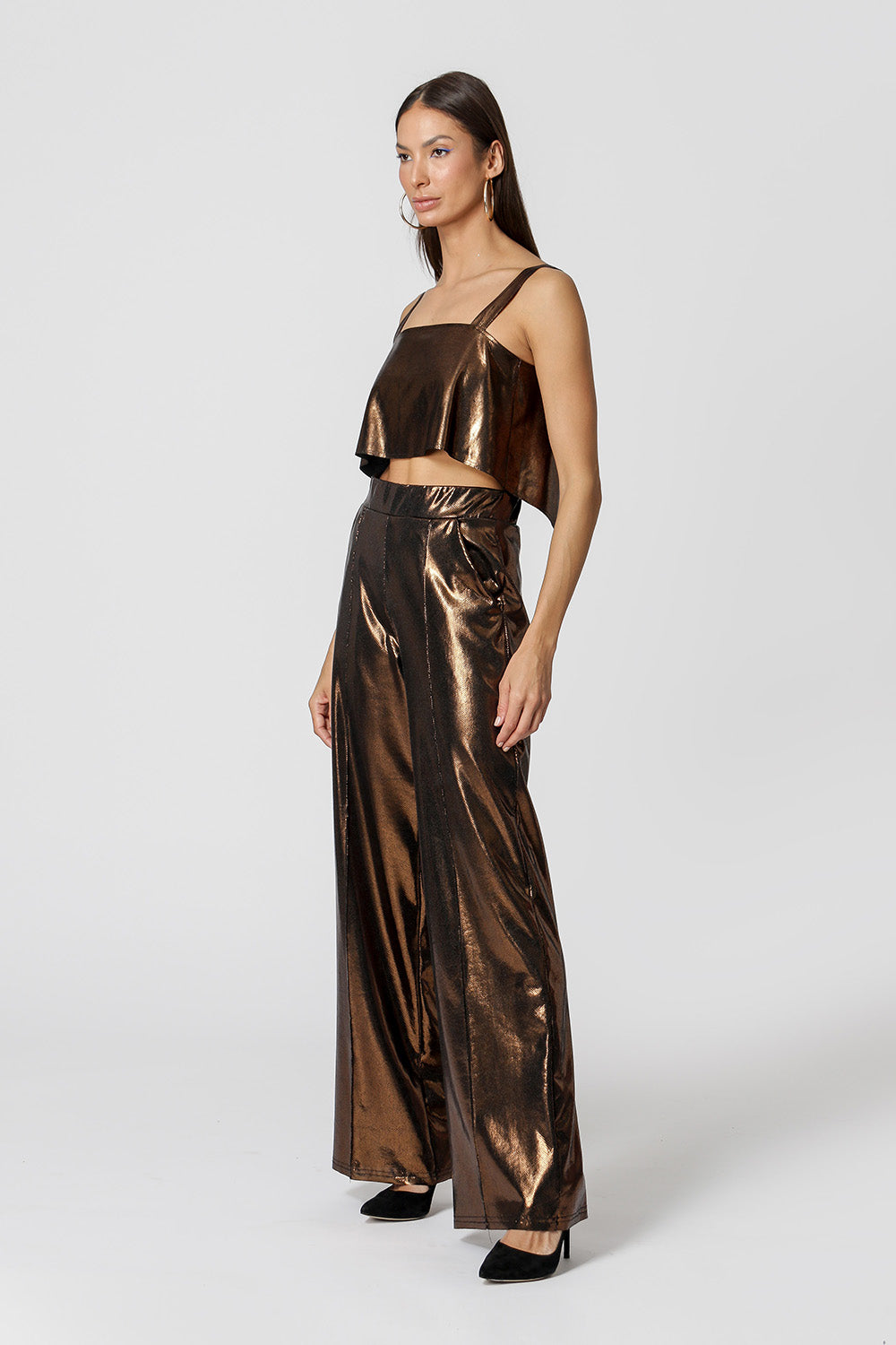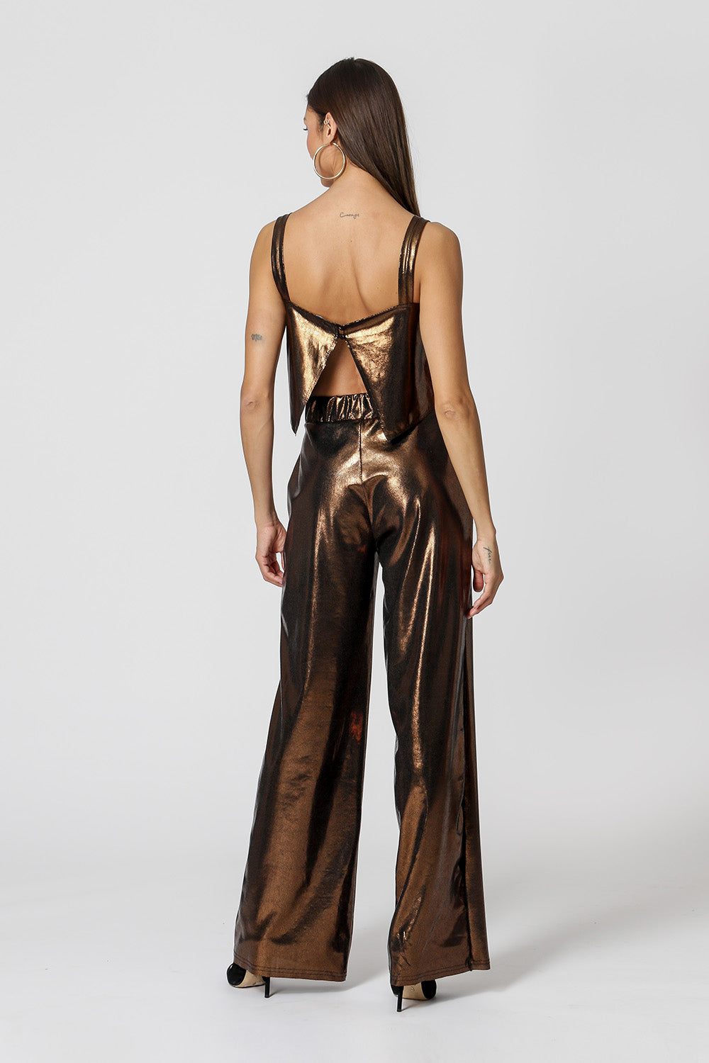 Blusa regata feita em foil texturizado. Detalhe de botão costas. Peça que vai deixar seu look night mais ousado!
