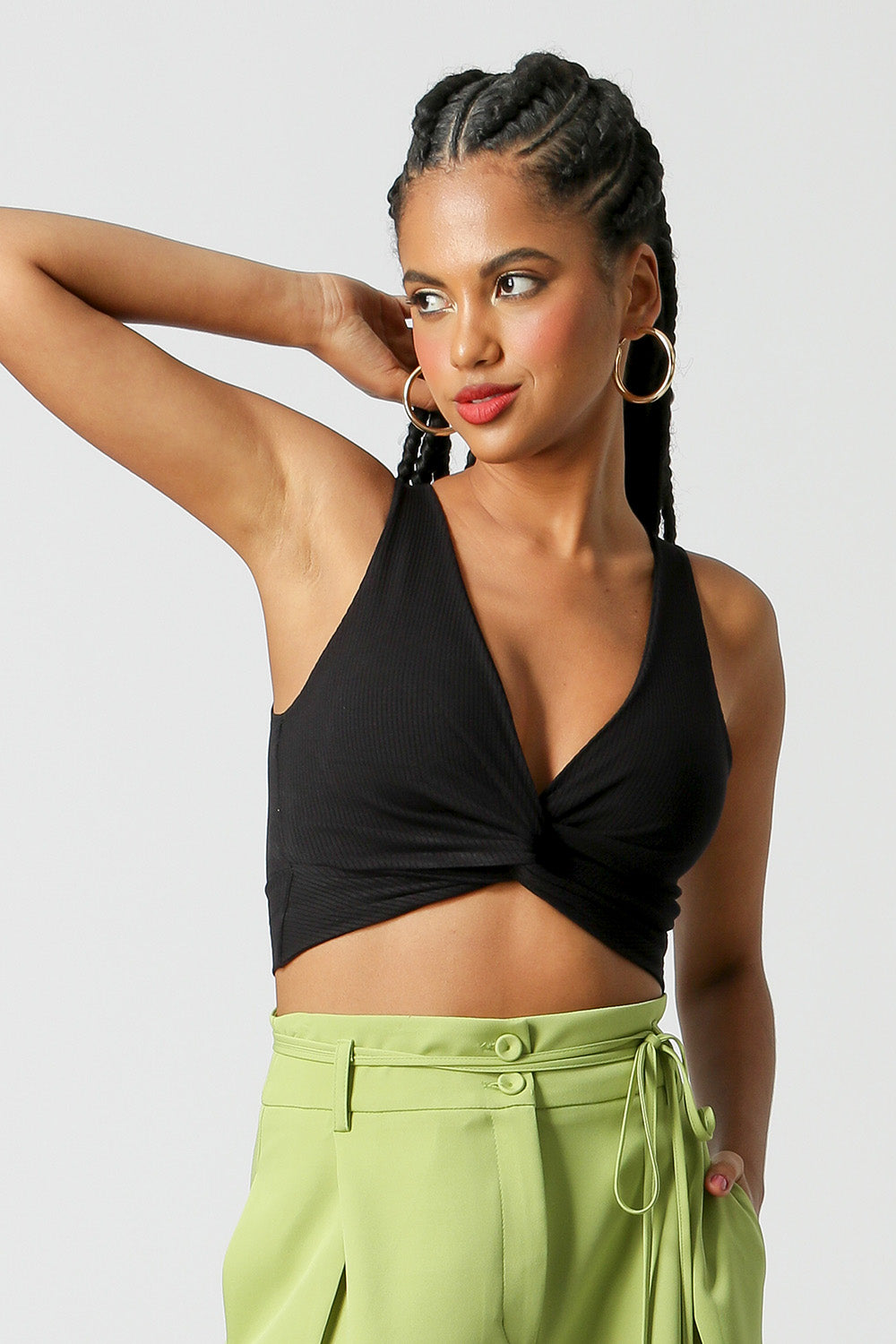 Regata cropped com shape justo ao corpo e decorte com detalhe de twist. Peça feita em malha canelada slim. Perfeito para compor seu look do dia a dia!