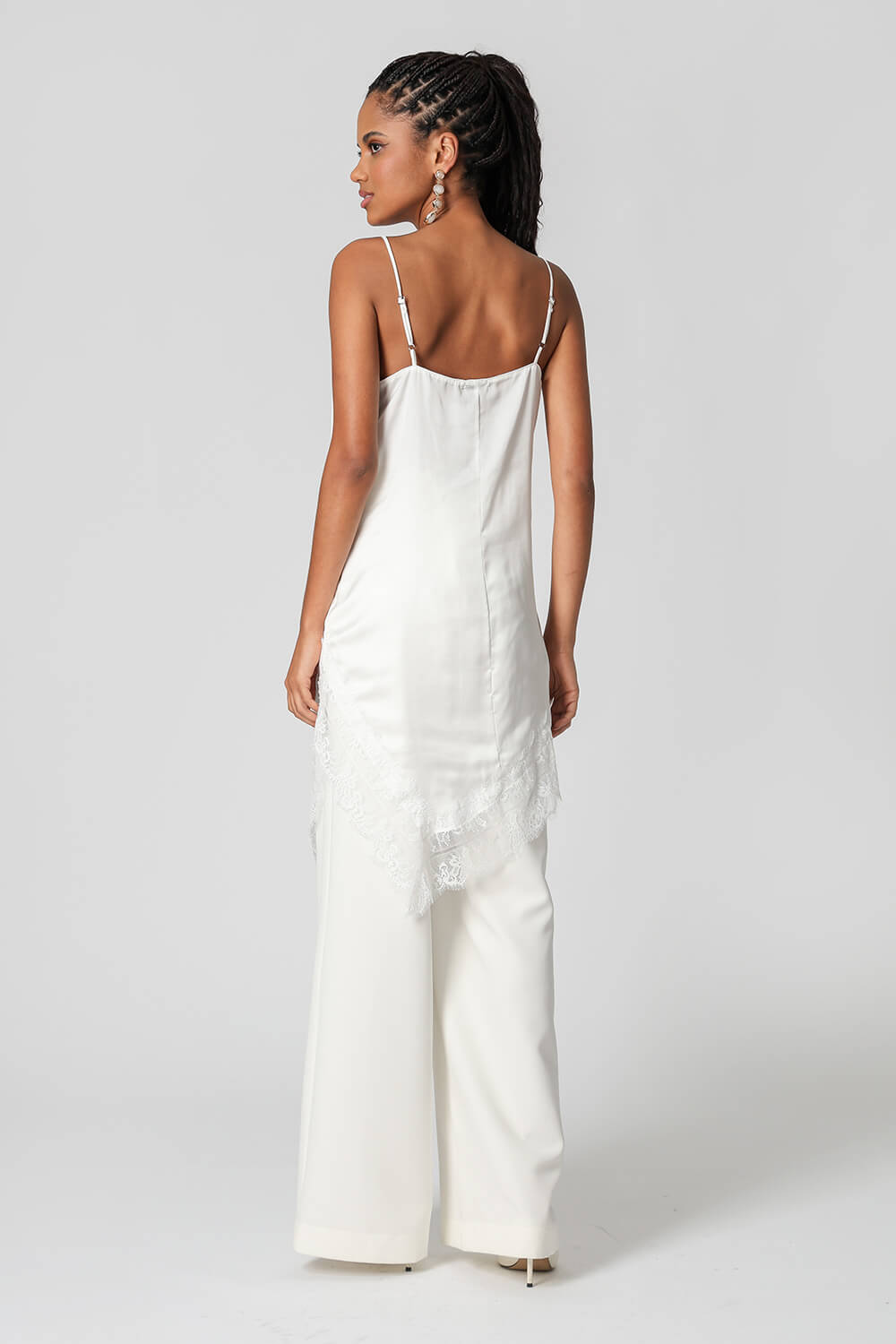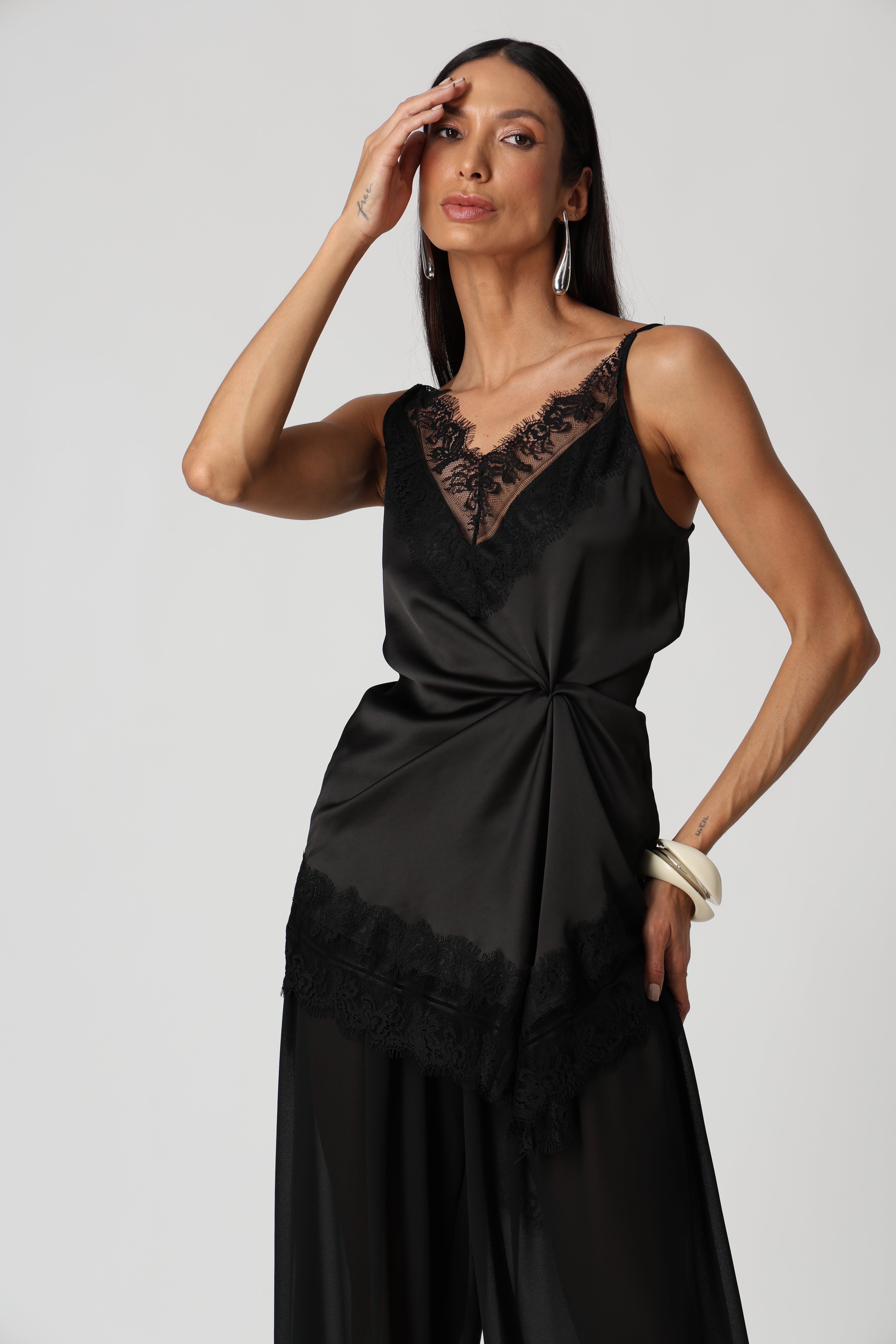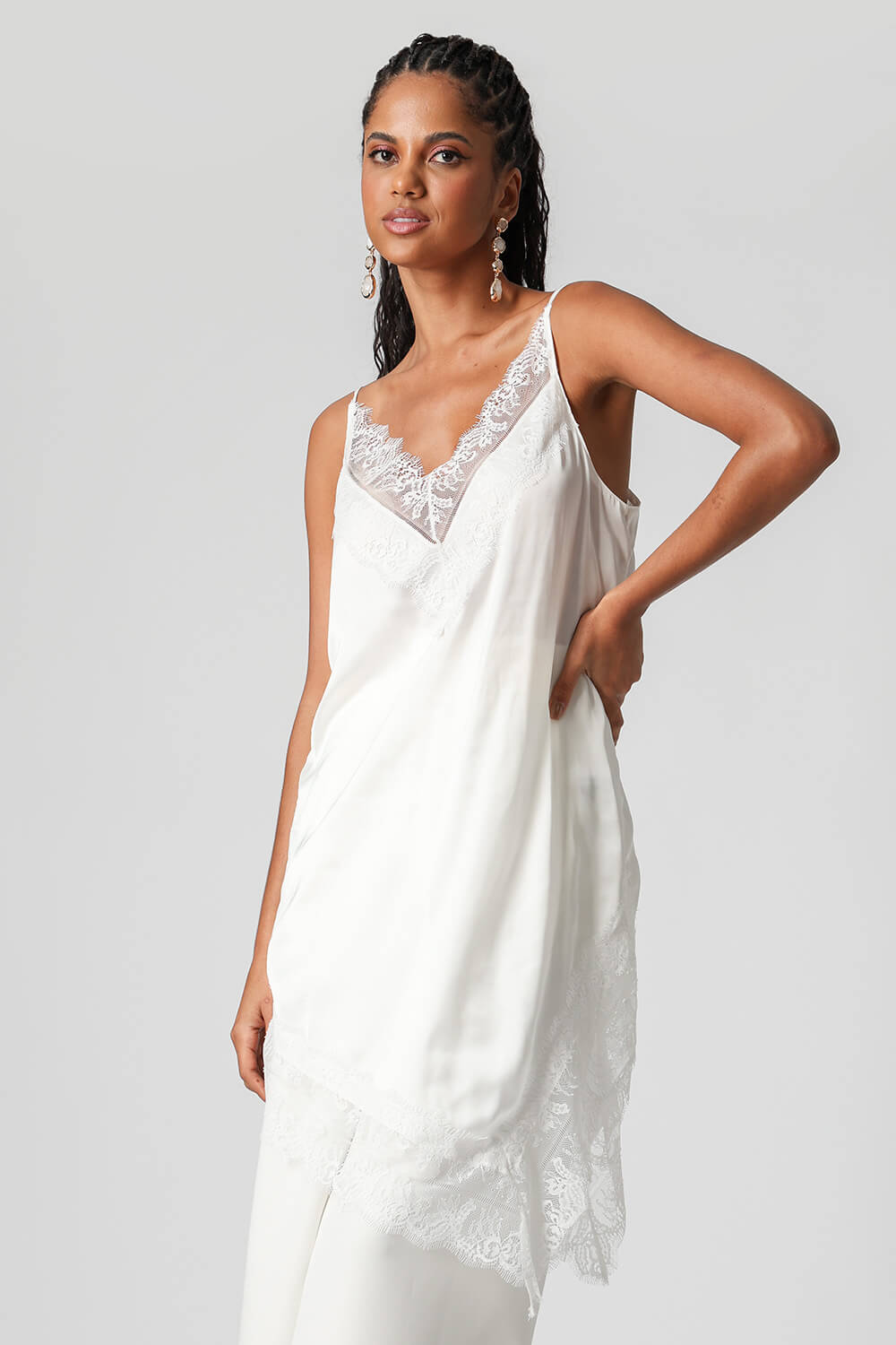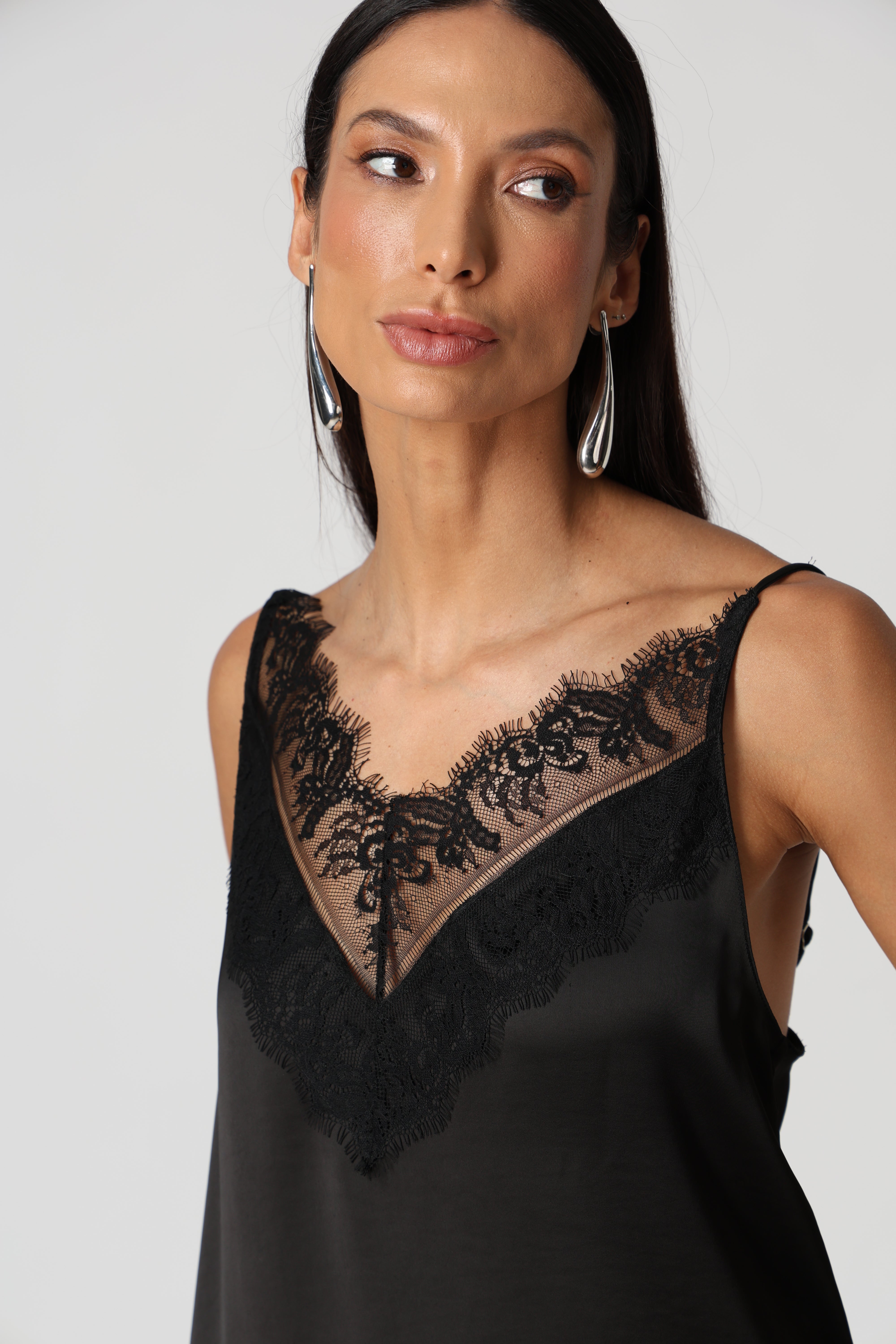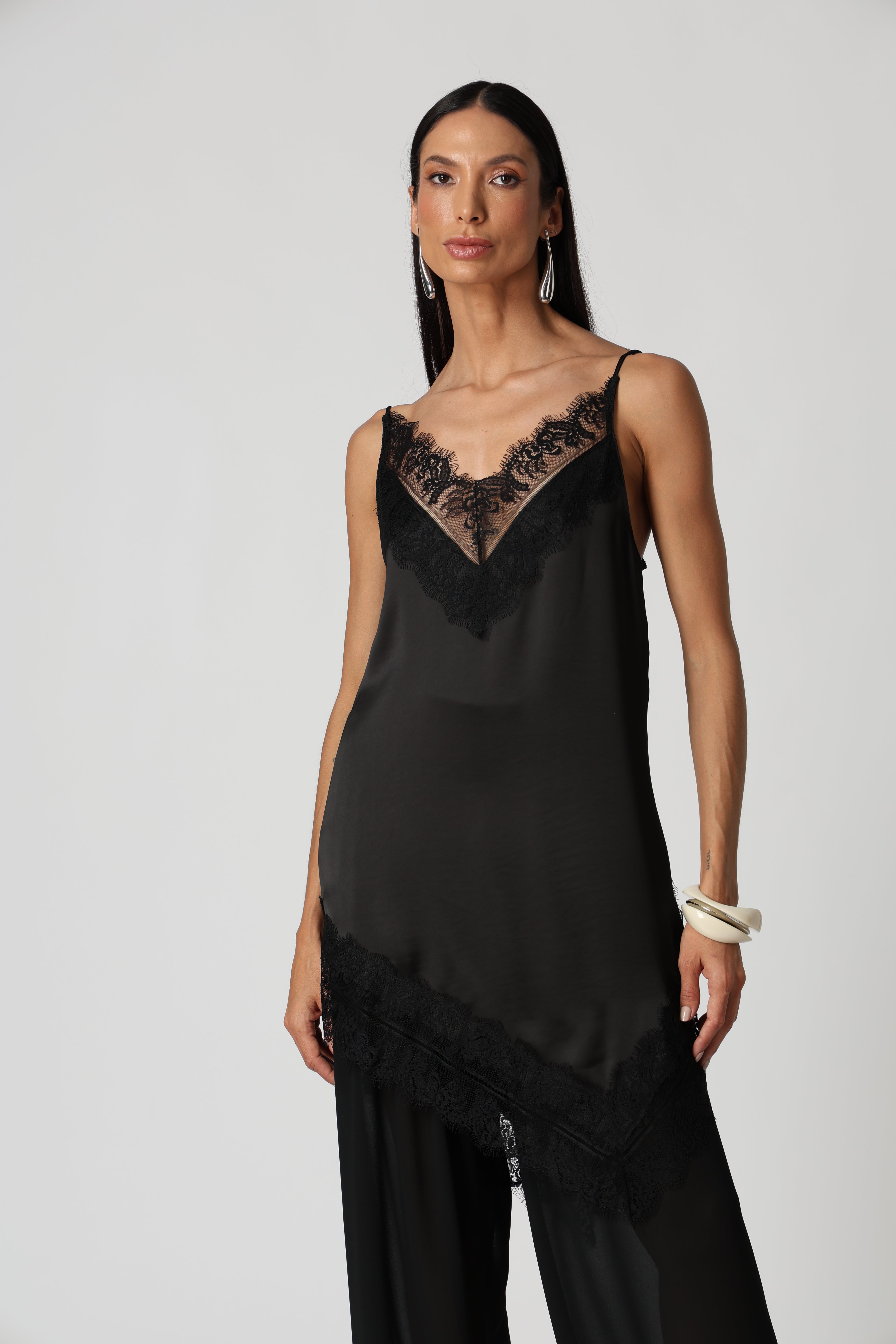 Regata sofisticada em cetim com delicados detalhes em renda no decote e na barra assimétrica. Possui alças finas com regulagem para ajuste perfeito e caimento leve e elegante.