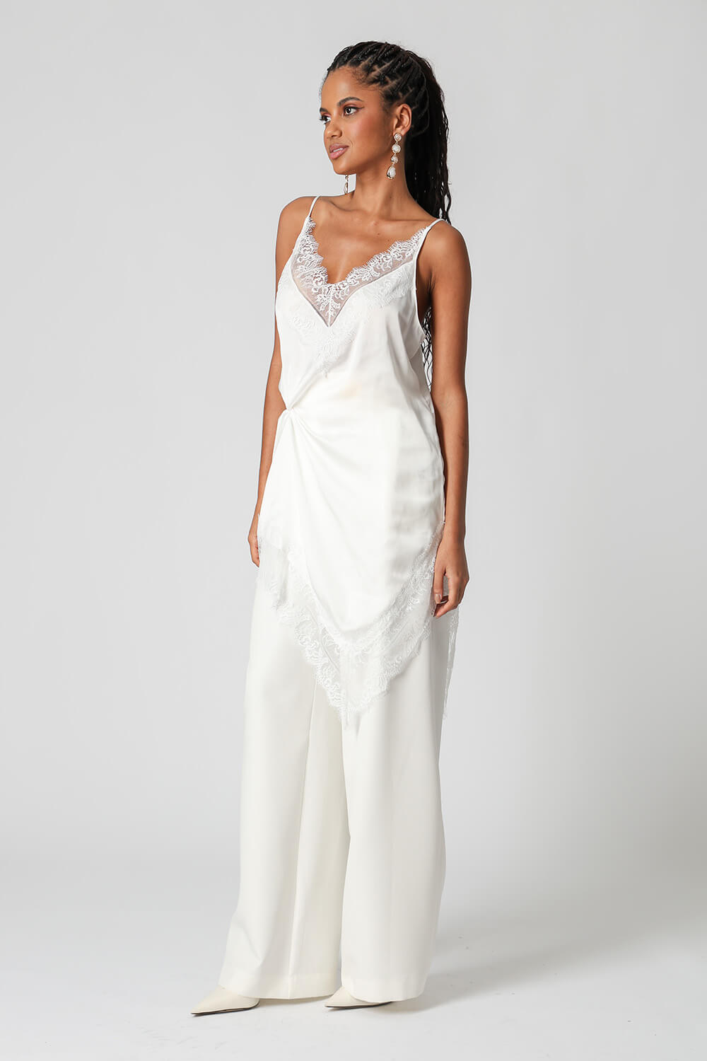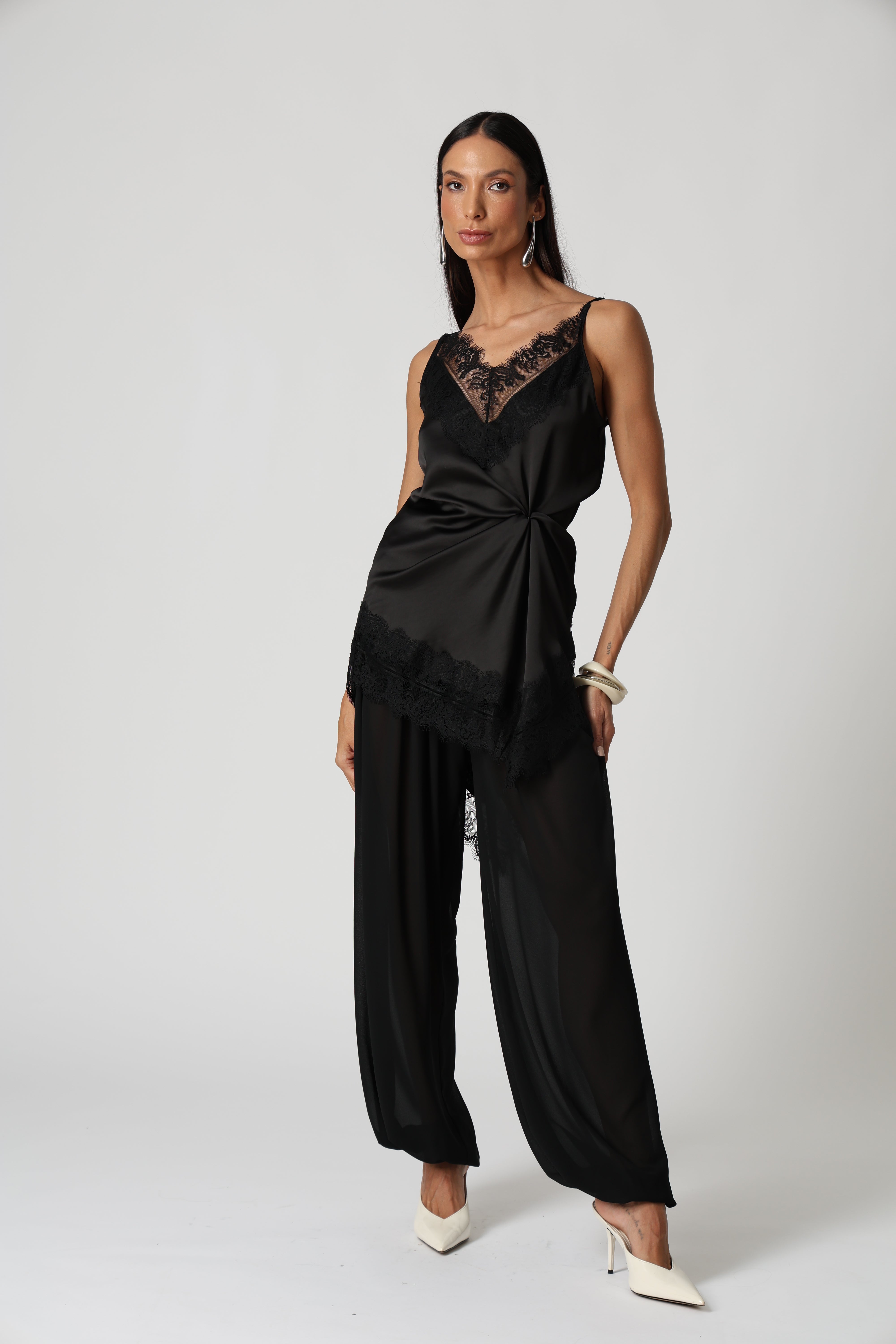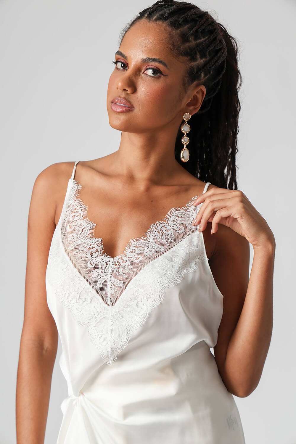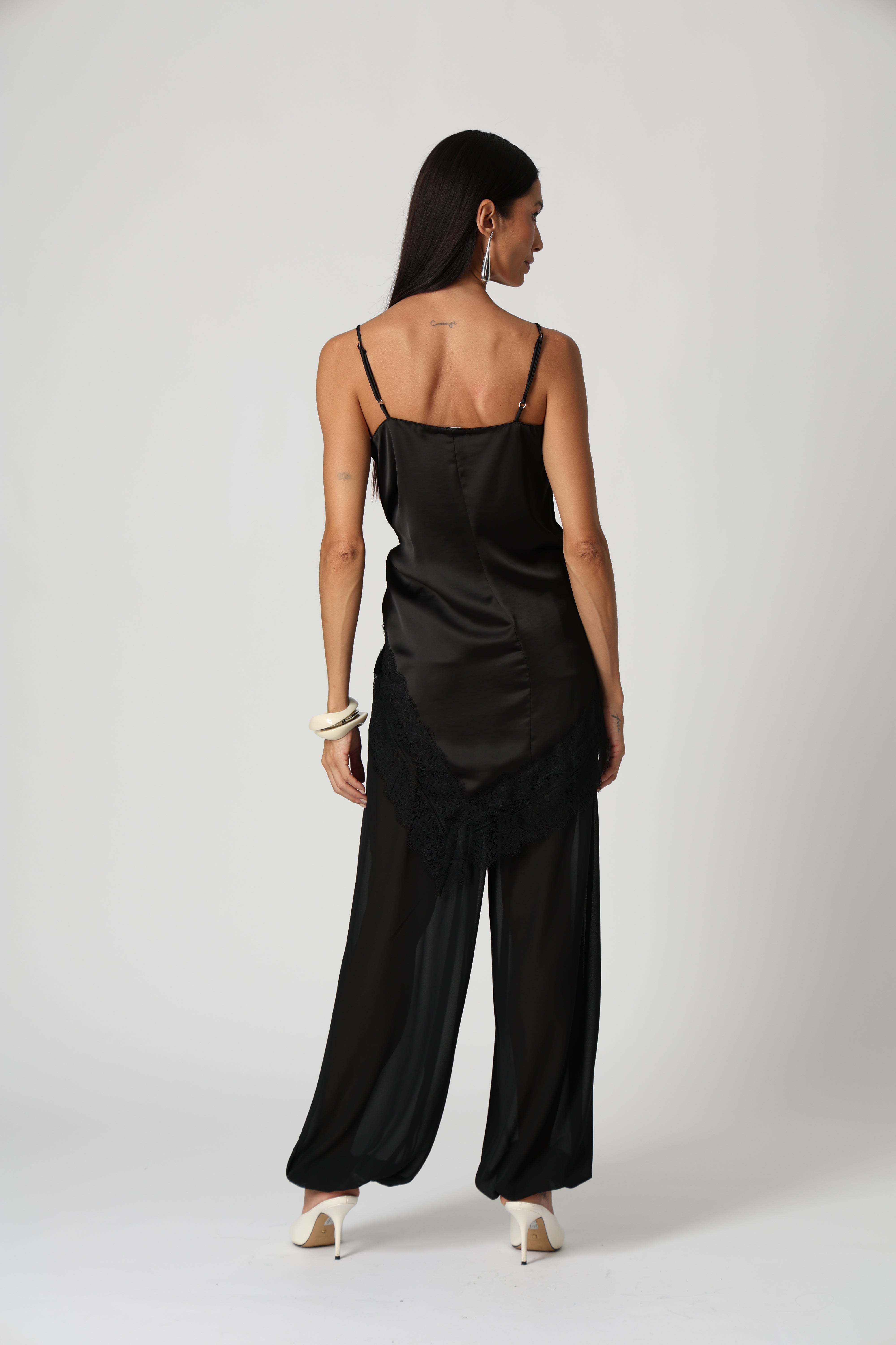 Regata sofisticada em cetim com delicados detalhes em renda no decote e na barra assimétrica. Possui alças finas com regulagem para ajuste perfeito e caimento leve e elegante.