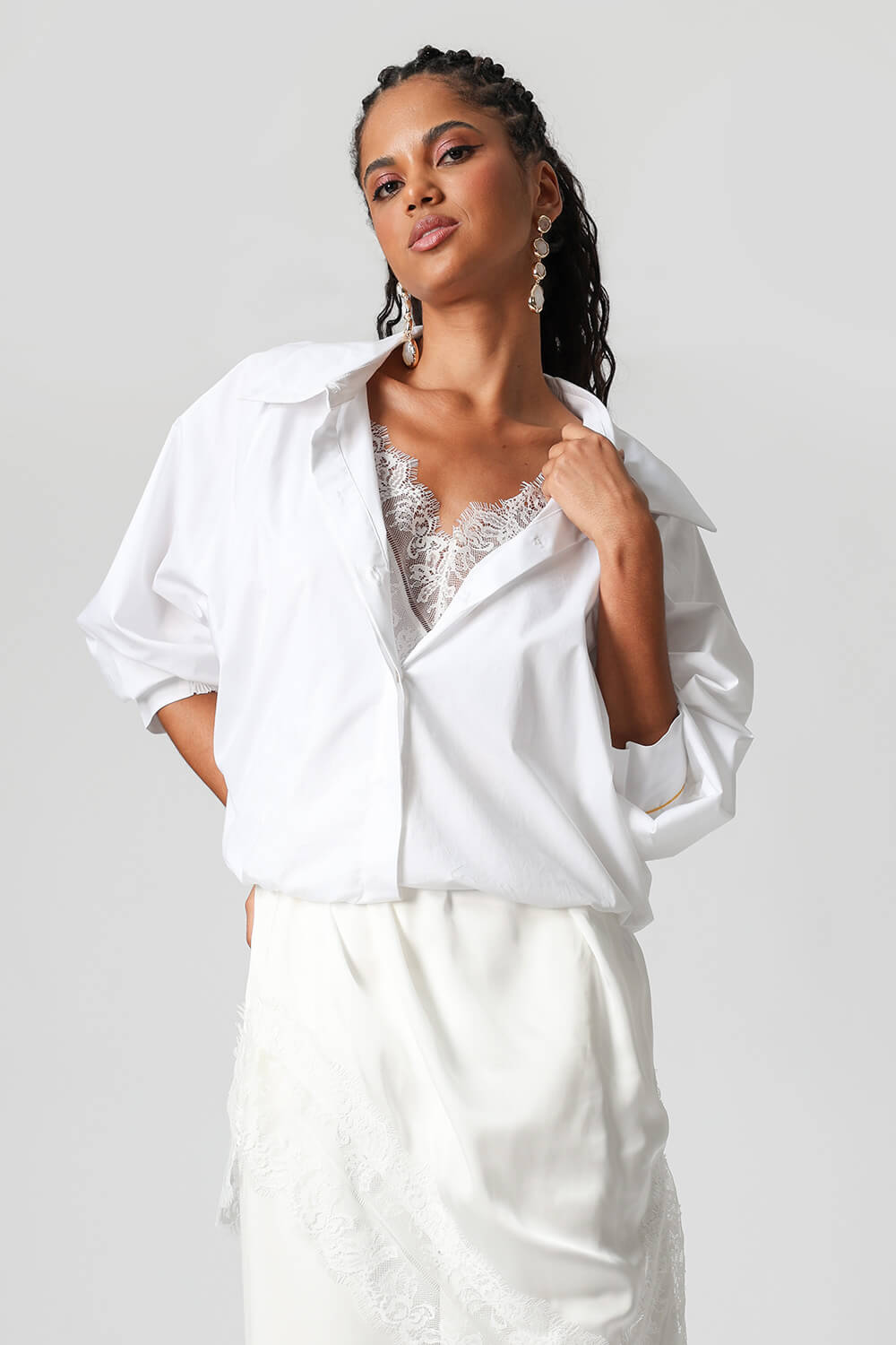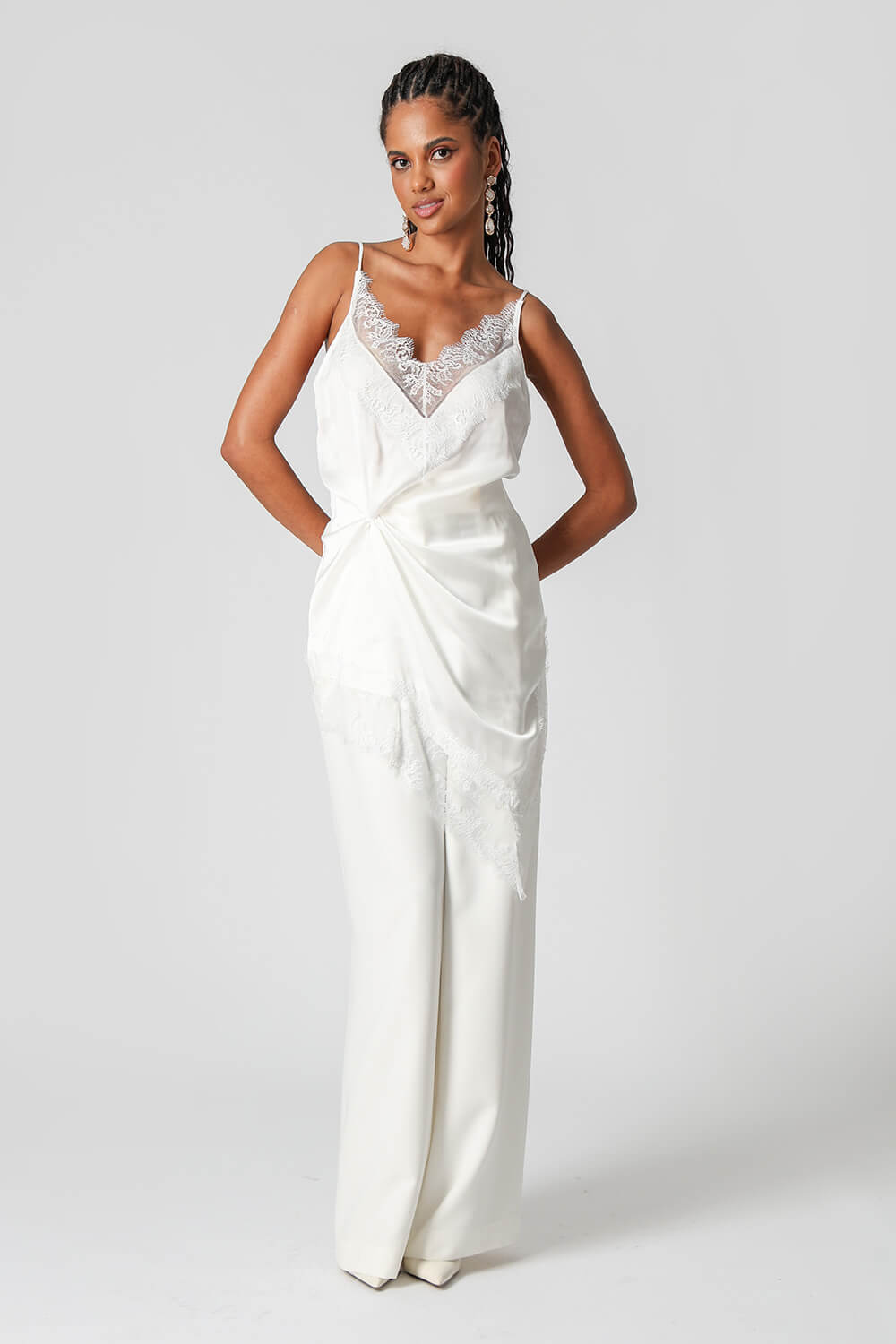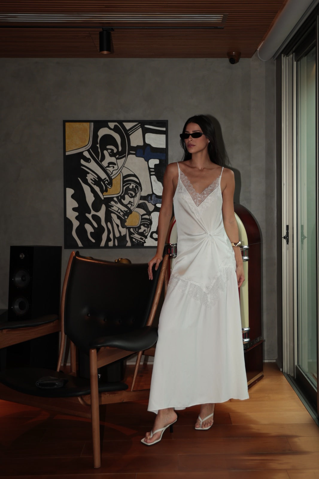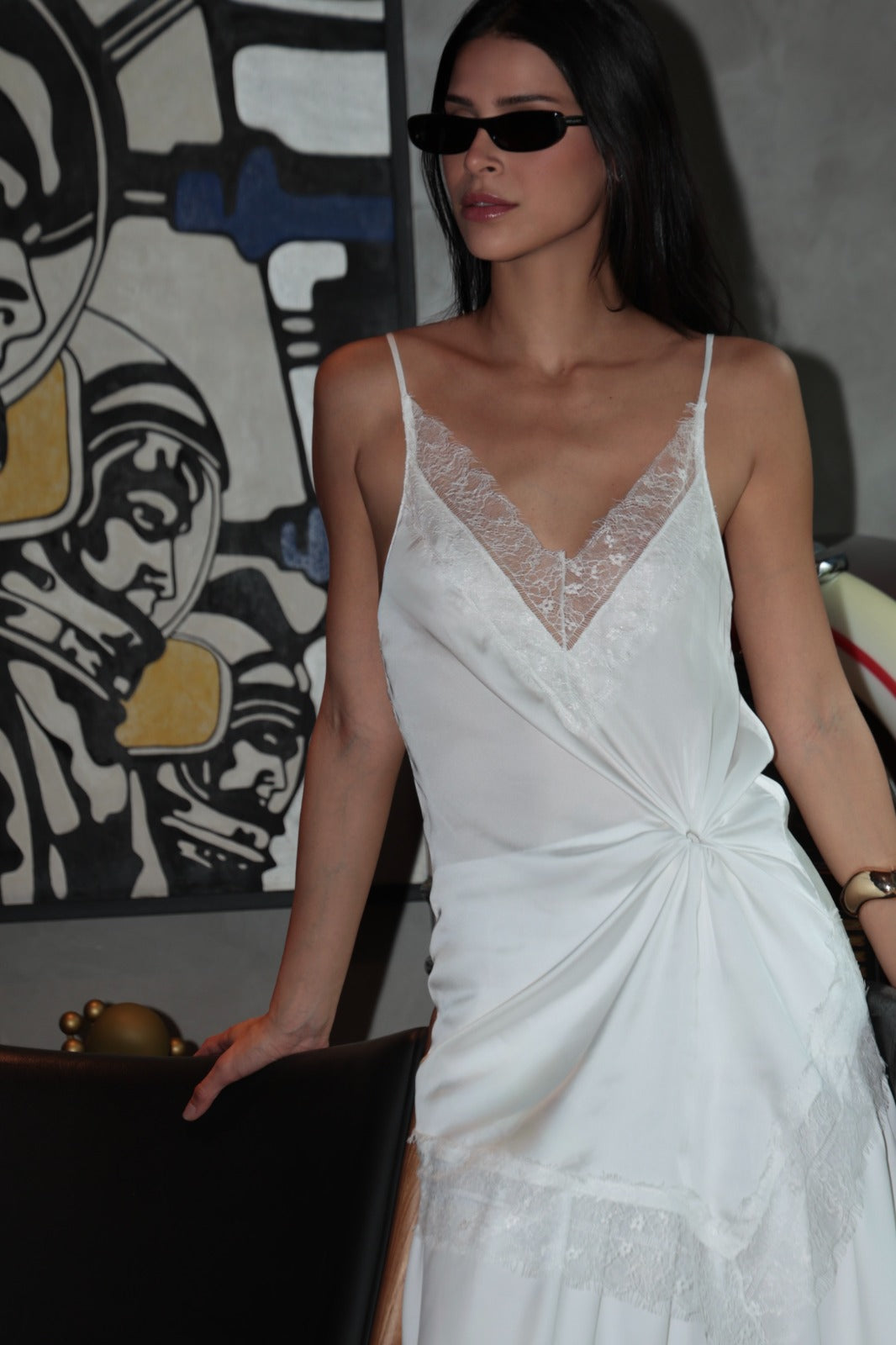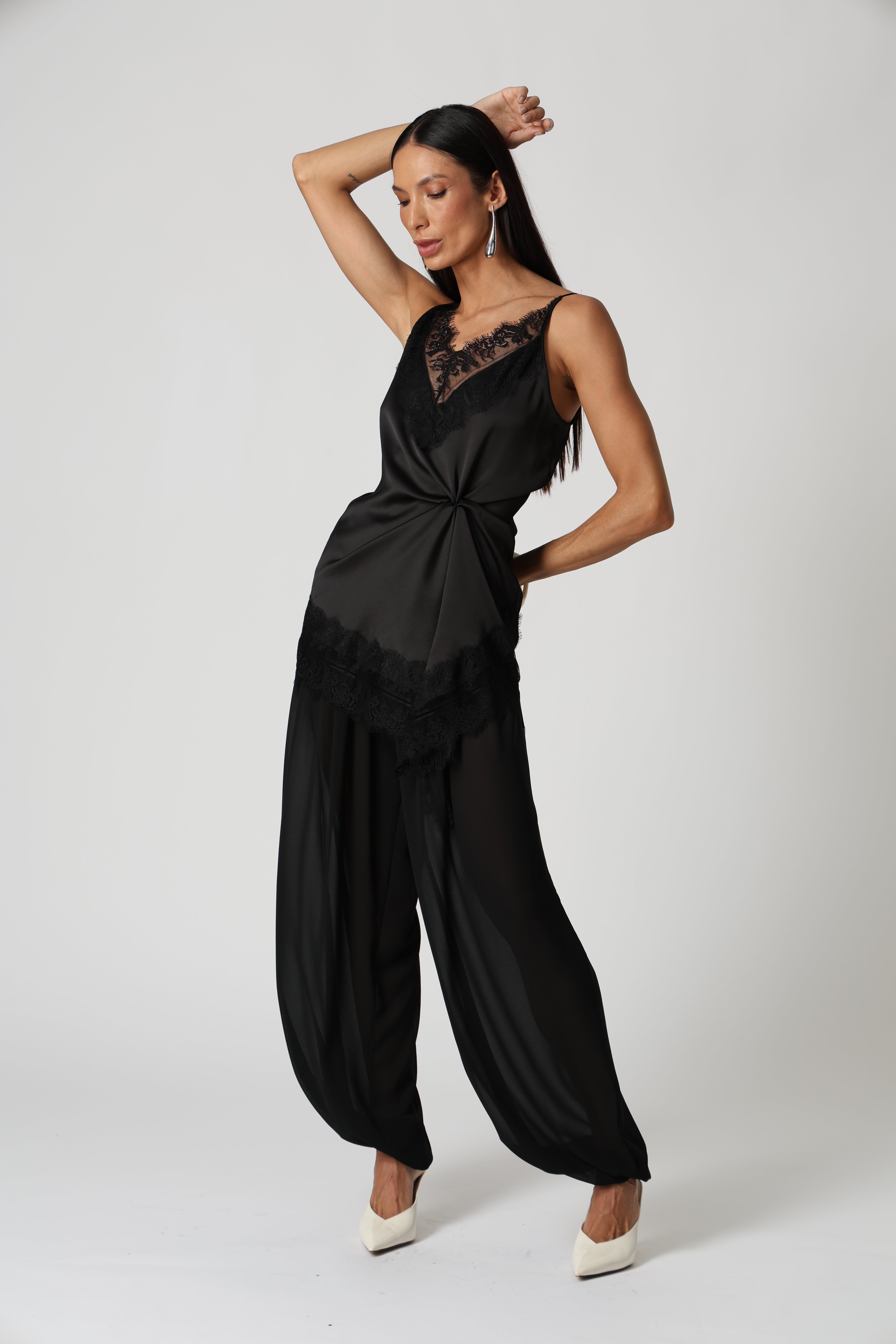 Regata sofisticada em cetim com delicados detalhes em renda no decote e na barra assimétrica. Possui alças finas com regulagem para ajuste perfeito e caimento leve e elegante.