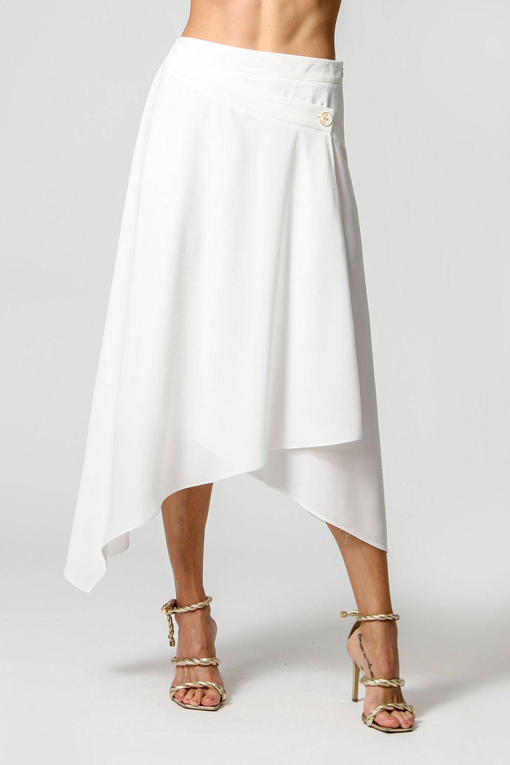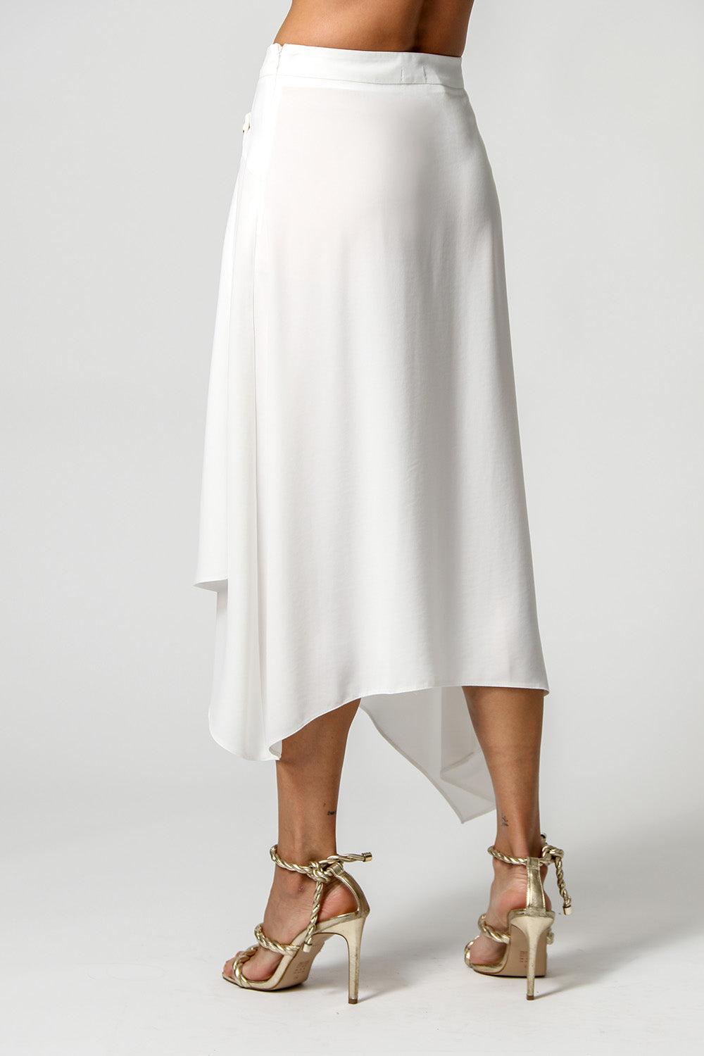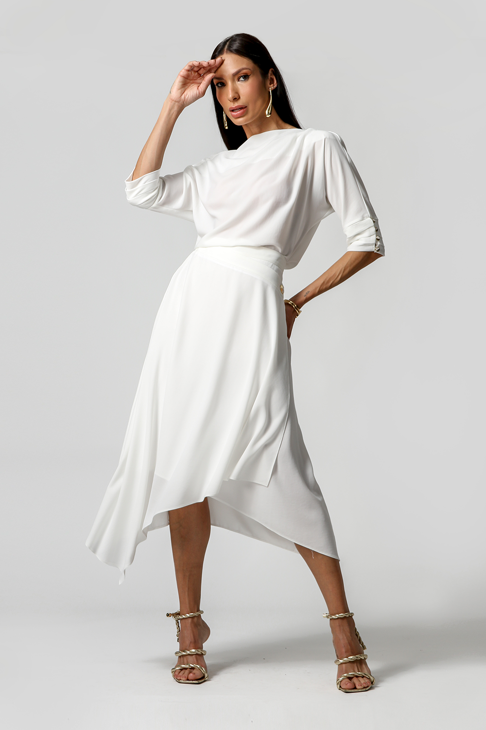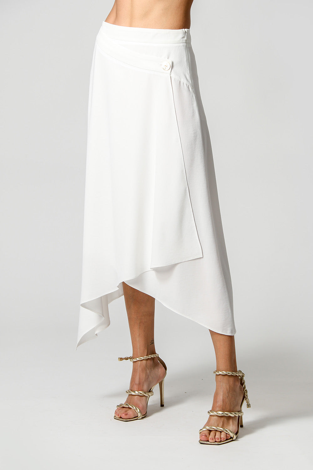 Saia assimétrica transpassada com cós transpassado fixo, trazendo elegância para você arrasar em looks casuais.
