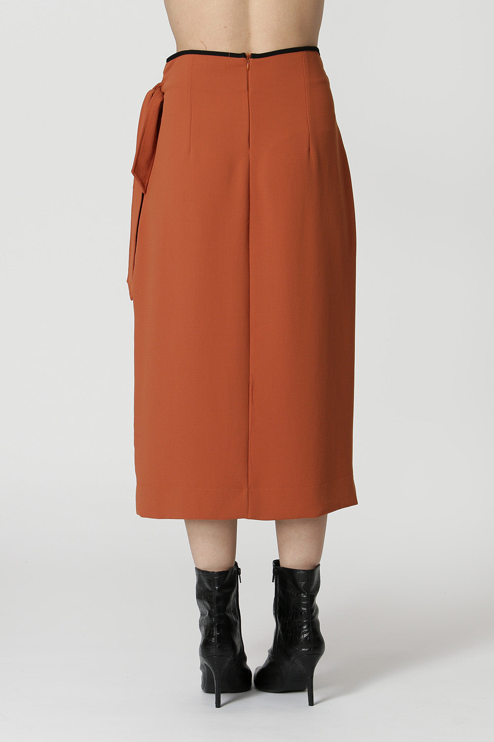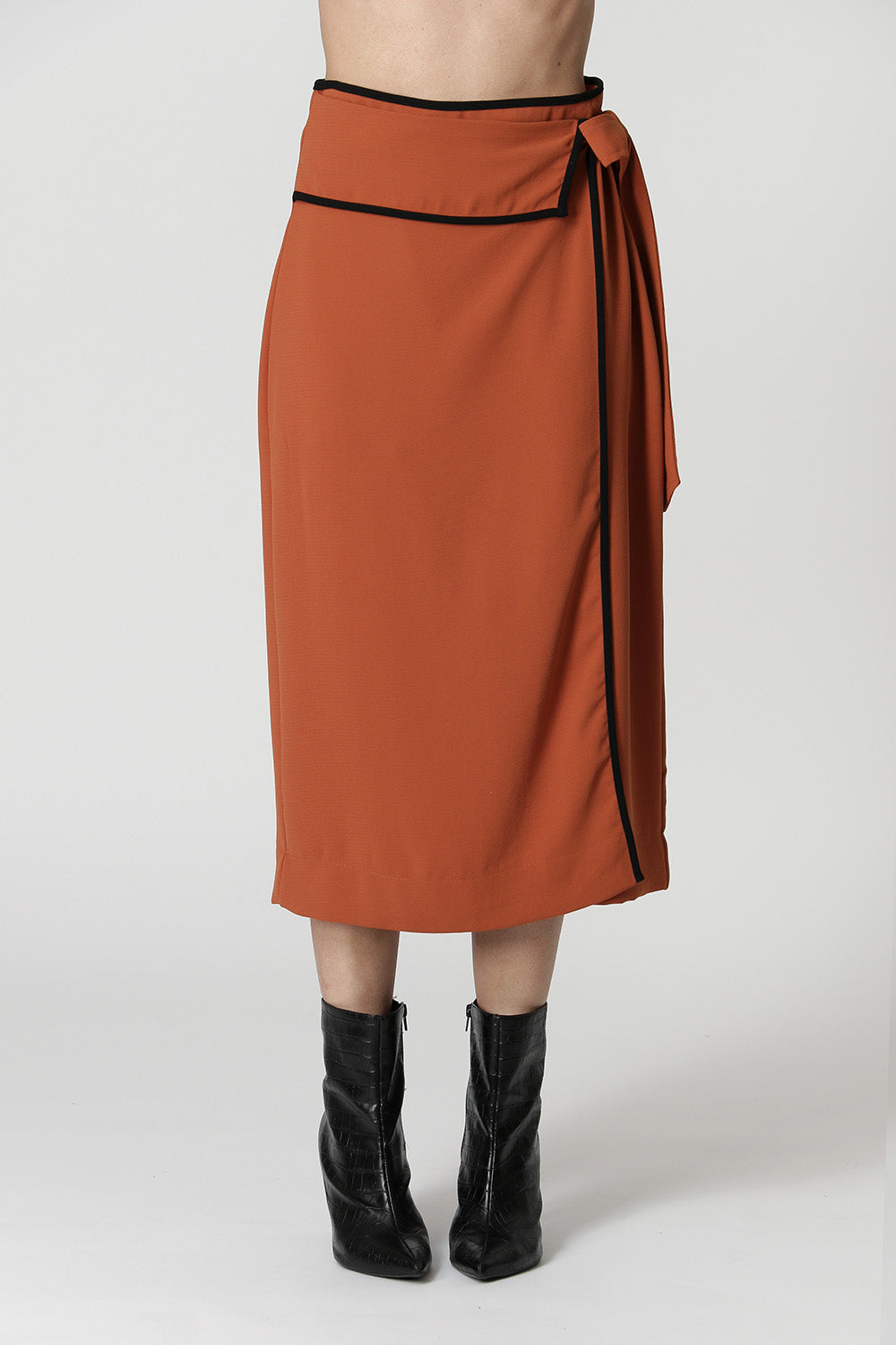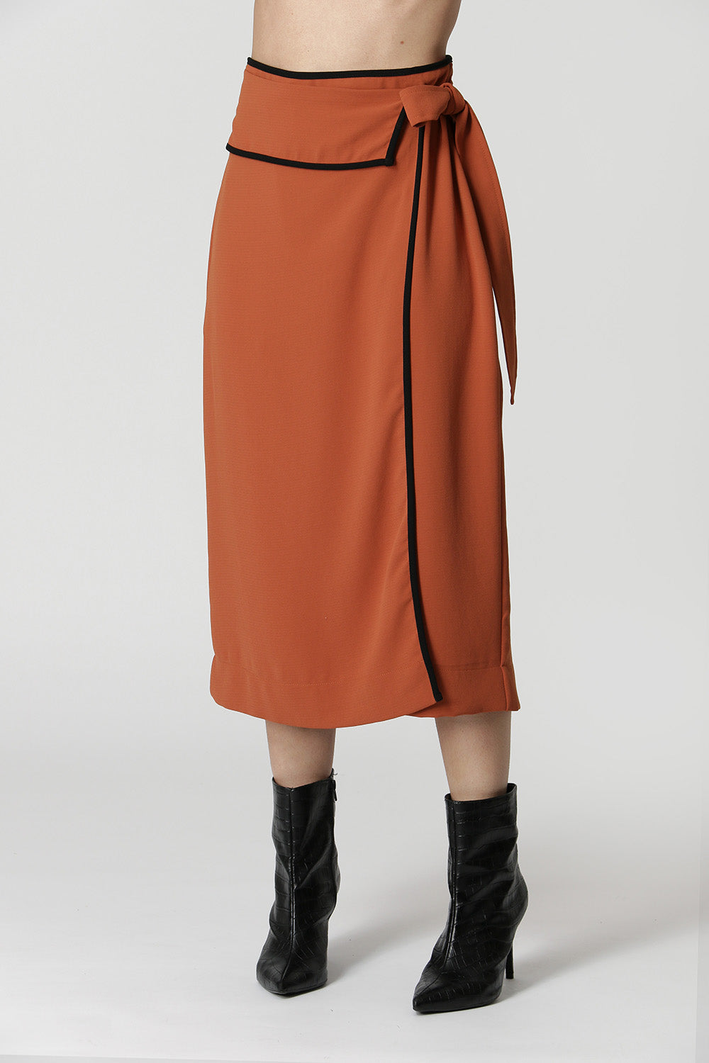Saia transpassada com vivos contrastante e amarração lateral. Peça ideal para compor mood work e casual.