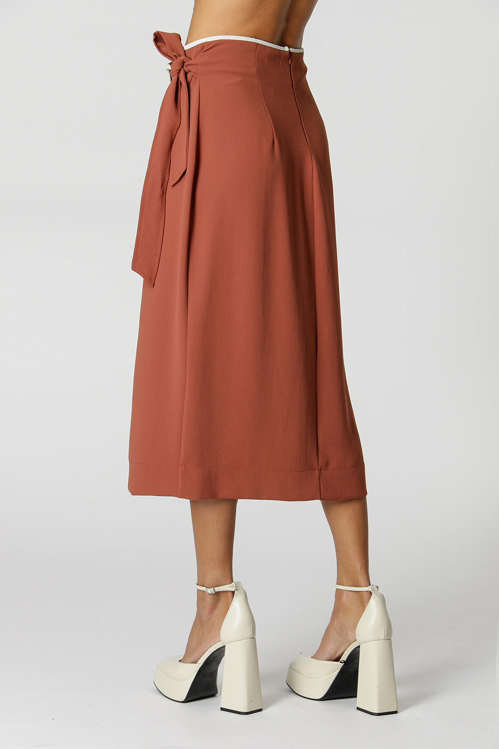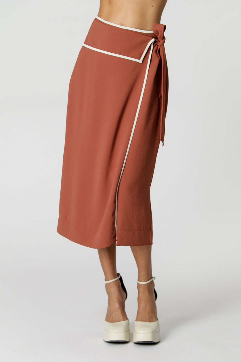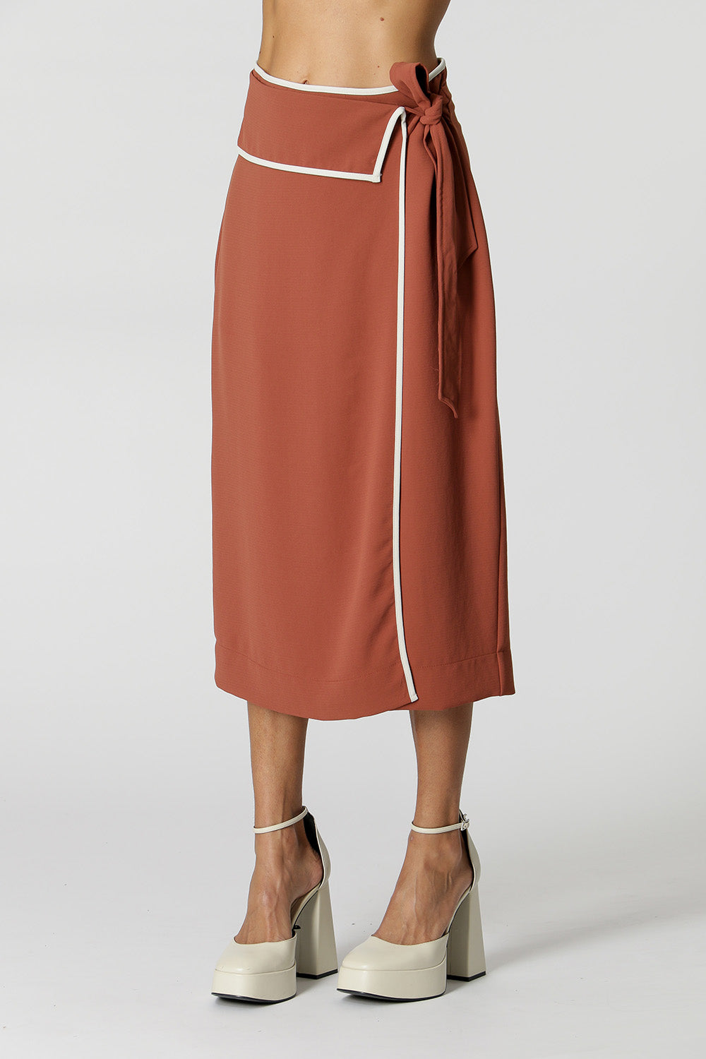 Saia transpassada com vivos contrastante e amarração lateral. Peça ideal para compor mood work e casual.