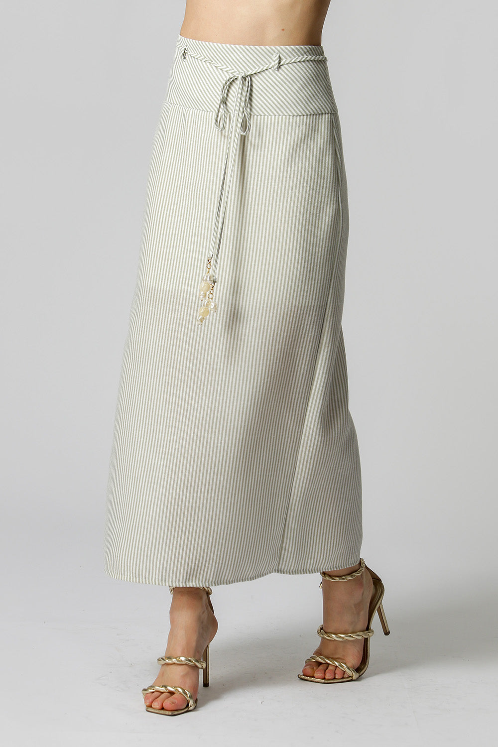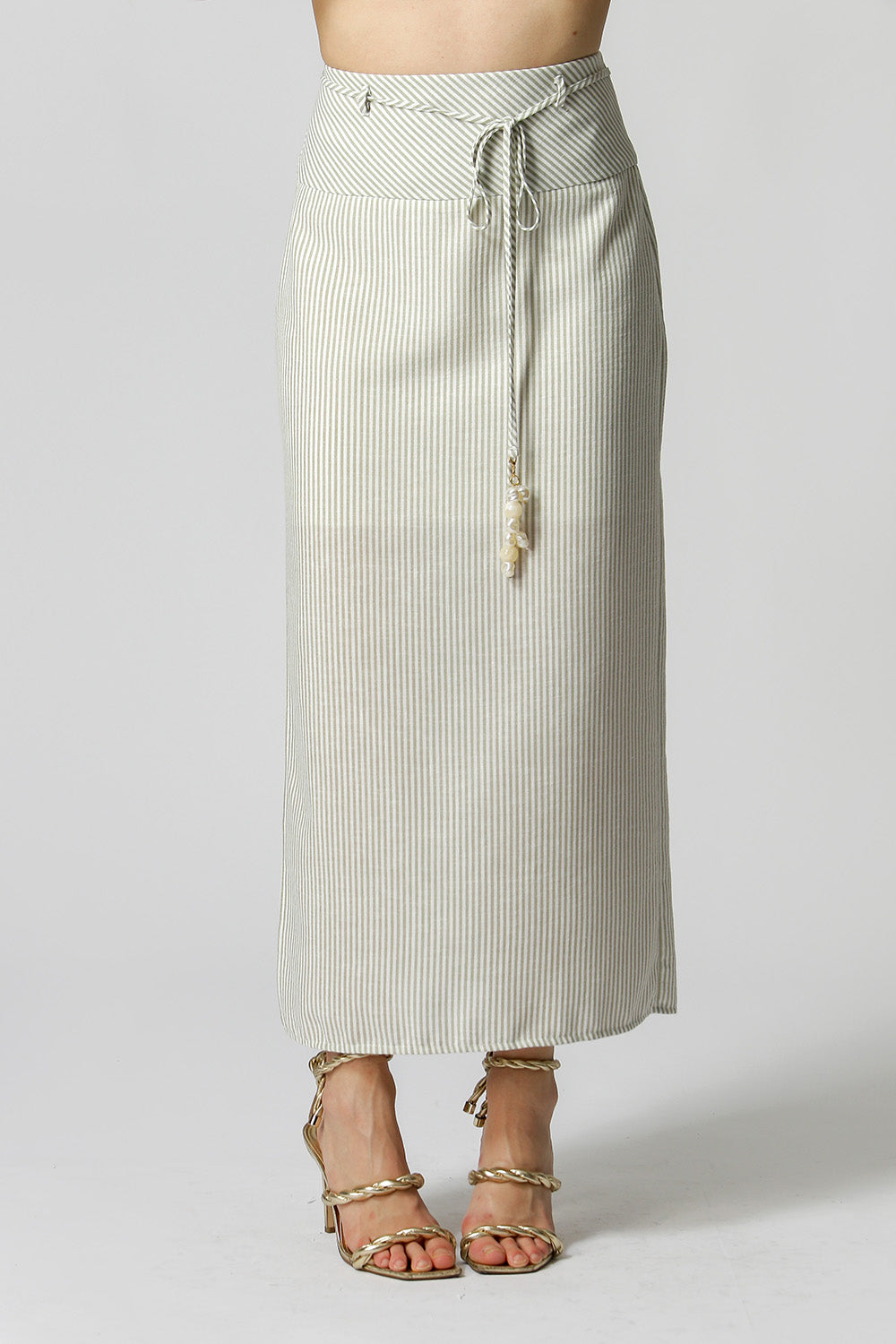 Saia linho com cinto e fenda lateral. Peça elegante e atemporal.