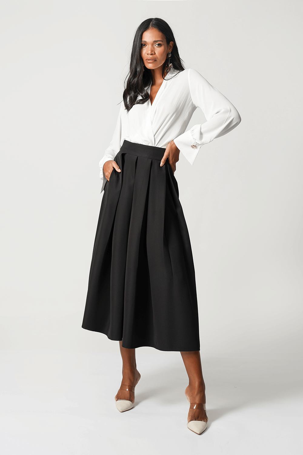 Saia de pregas com um volume super atual, citado como look dior, uma peça feita em alfaitaria, o item fashion do momento.