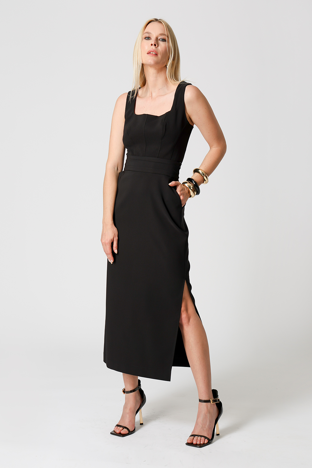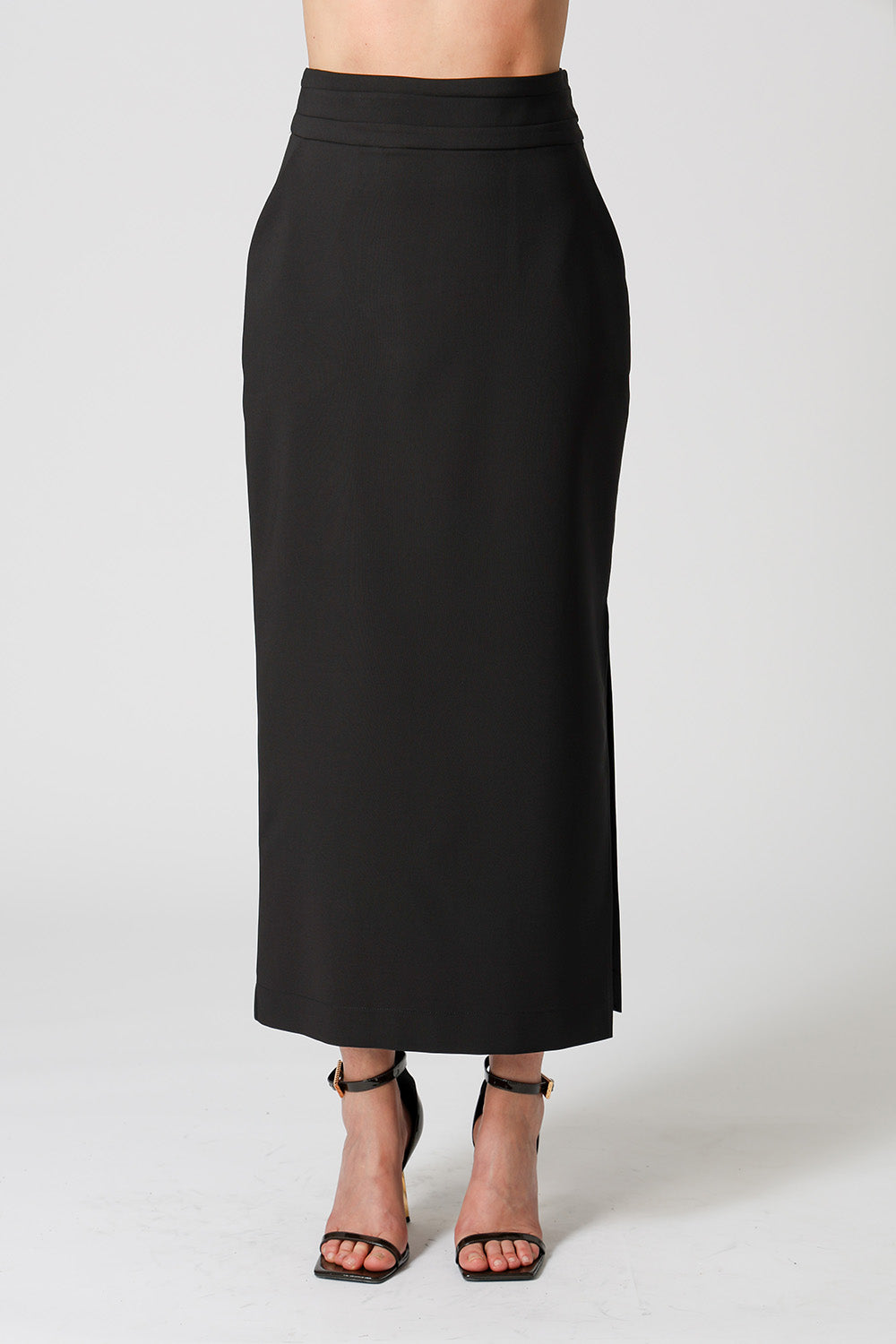 Saia reta em tecido de alfaiataria, com recortes modernos no cós, fenda lateral esquerda e bolso funcional na frente. Elegante e versátil para compor looks sofisticados.