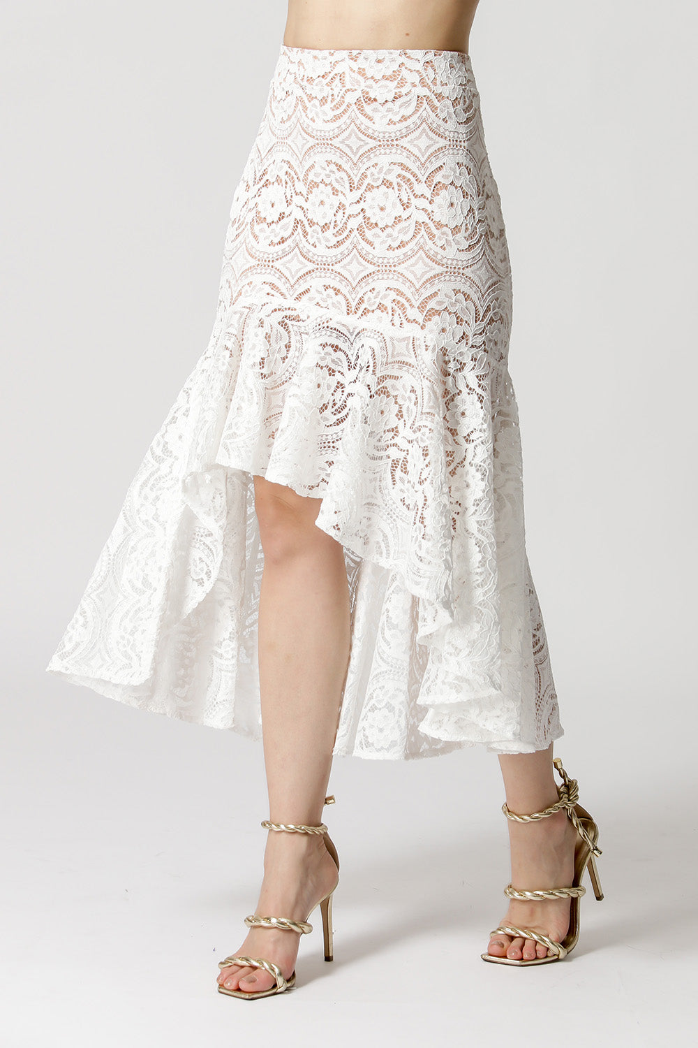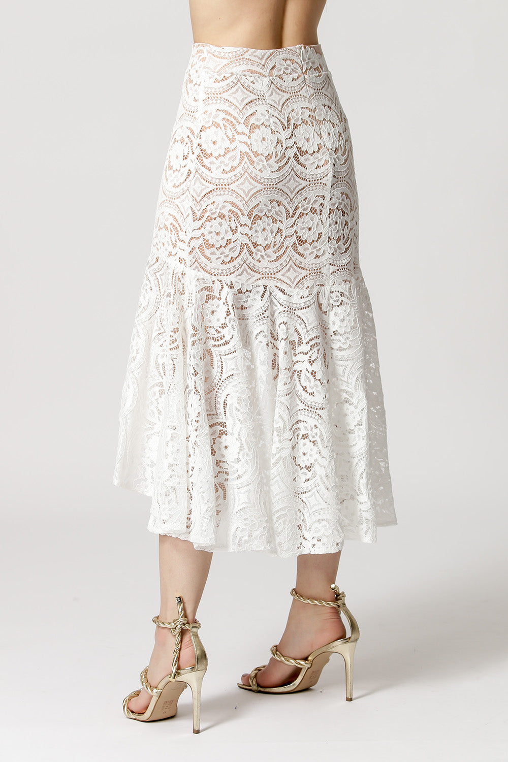 Saia de comprimento midi, modelagem assimétrica com babados e revestida com renda. Modelo que mescla delicadeza e romantismo na medida certa.