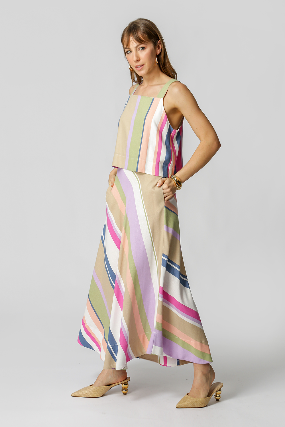 Saia de linho com pregas, modelo ideal para arrasar em looks casuais.