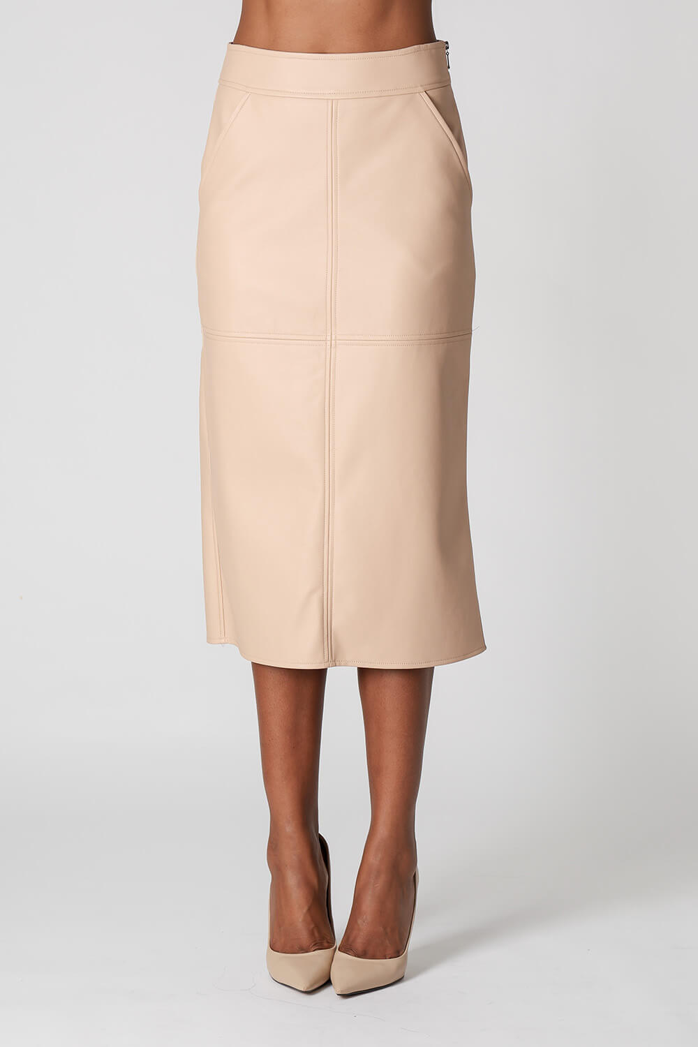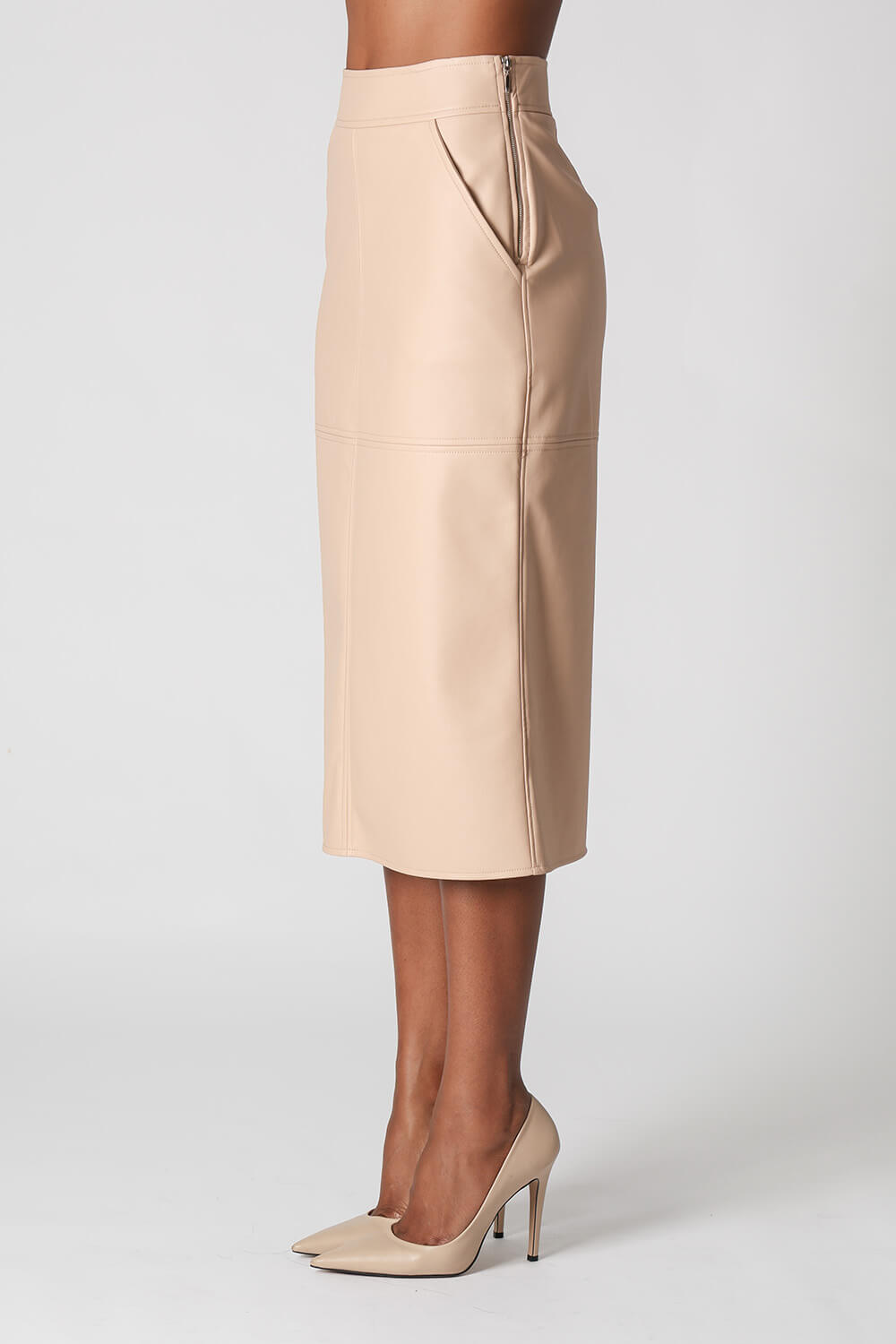 Saia lápis midi confeccionada em couro sintético, com recortes que valorizam a silhueta e fenda no meio das costas, garantindo elegância e conforto ao vestir.