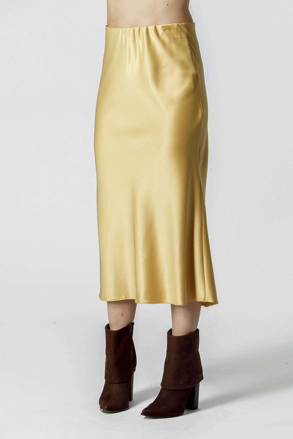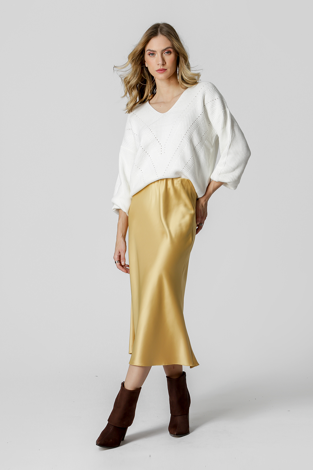 Saia com comprimento midi, com um shape sereia. Um item que alonga a silhueta e compõe com diversos itens, ideal para looks com blusas com volume, uma peça que atualiza o look e transita tanto para o look night quanto para o look casual.
