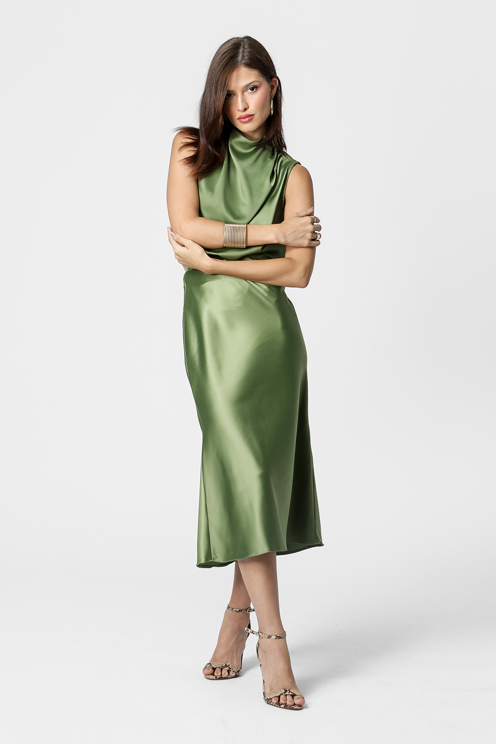 Saia com comprimento midi, com um shape sereia. Um item que alonga a silhueta e compõe com diversos itens, ideal para looks com blusas com volume, uma peça que atualiza o look e transita tanto para o look night quanto para o look casual.