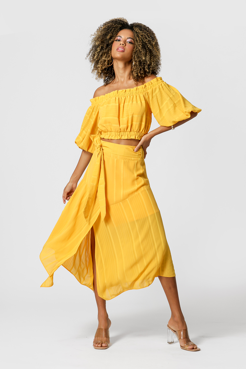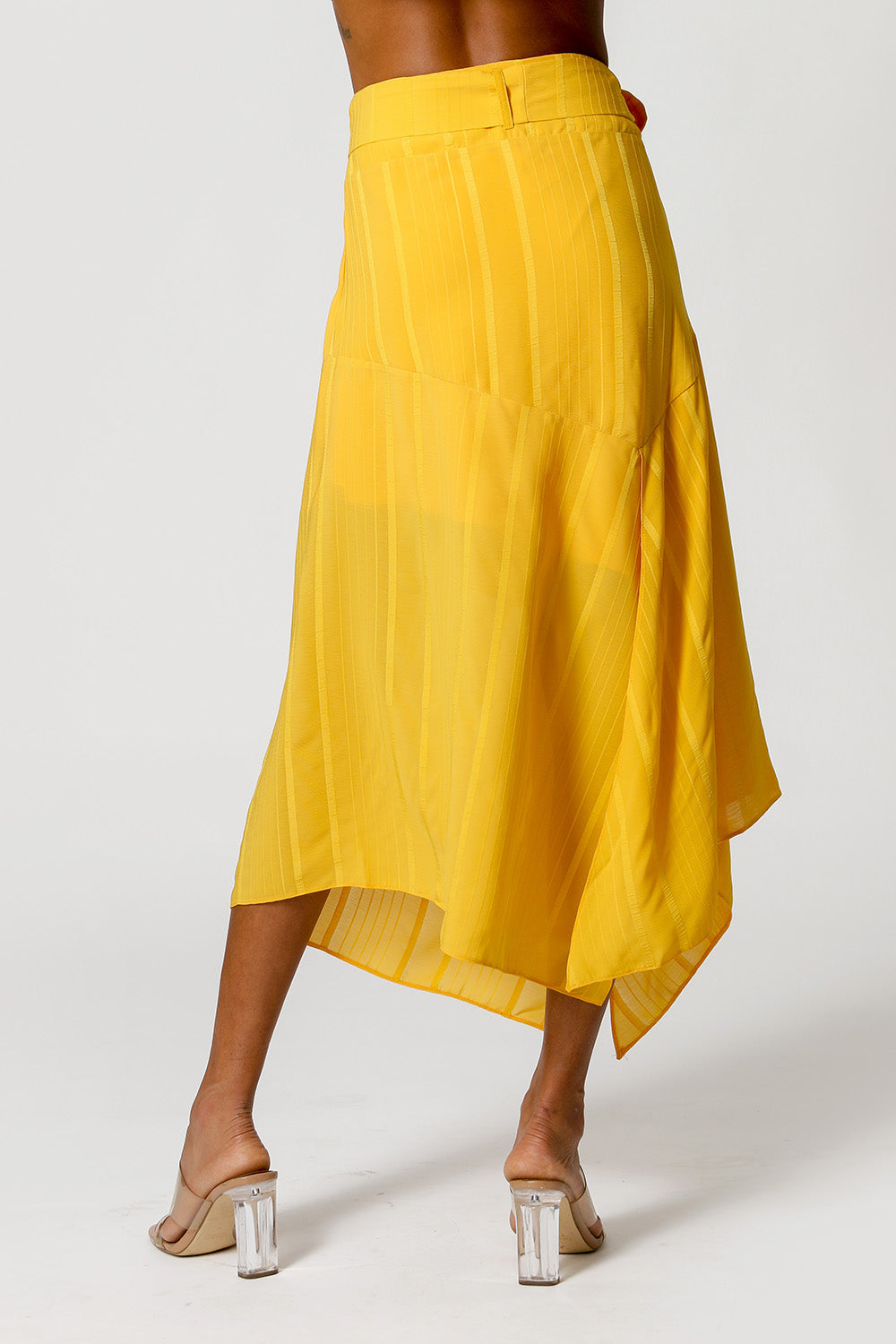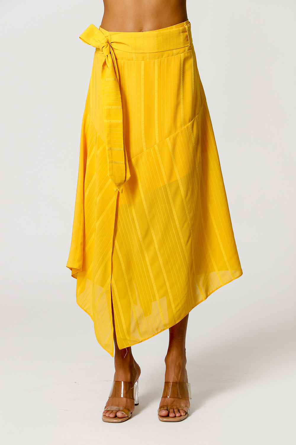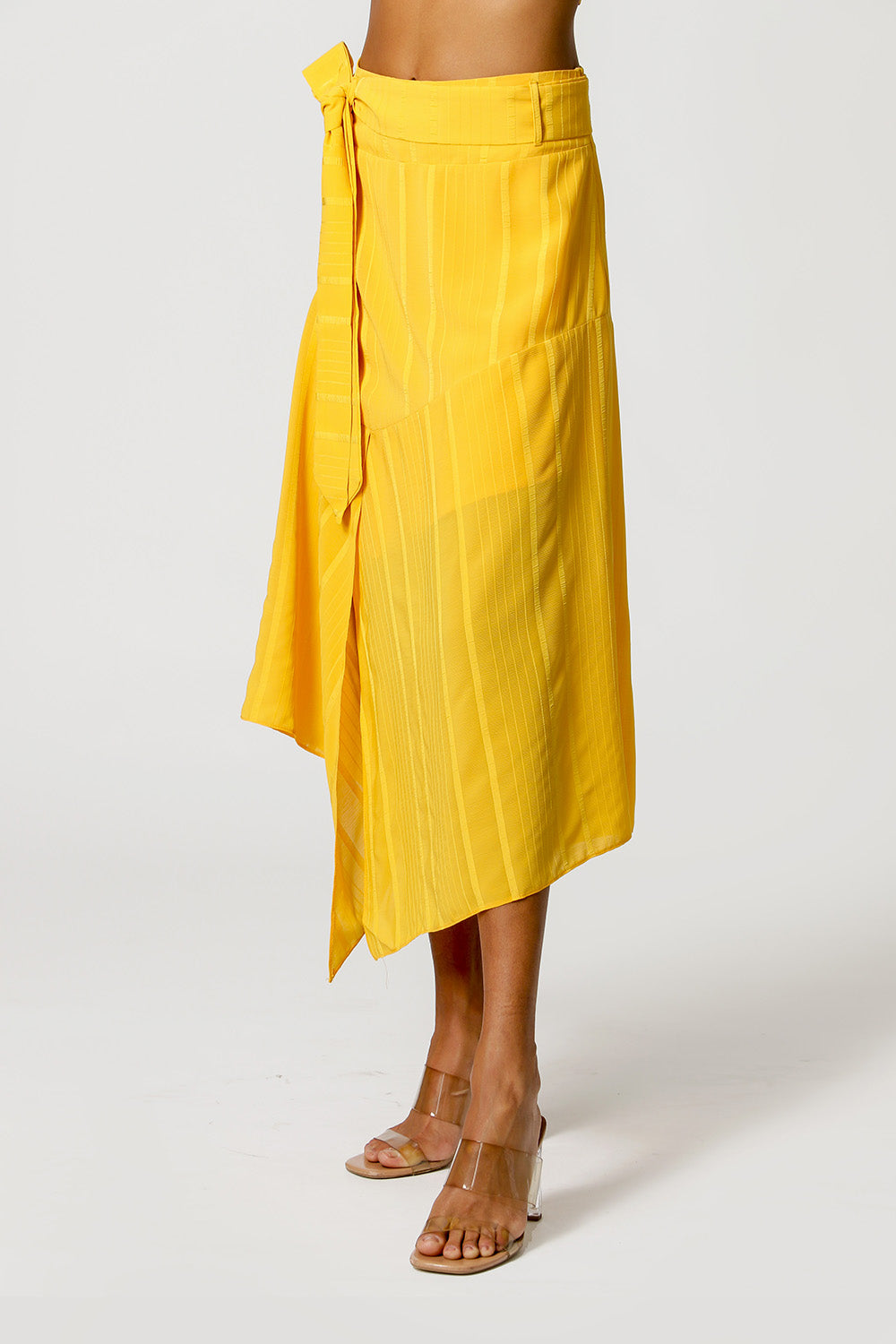 Saia midi assimétrica feita em chiffon elysee, acompanha faixa para amarração. Possui zíper invisivel lateral e forro. Uma peça com ar despojado e fresco, ideal para os dias de verão.
