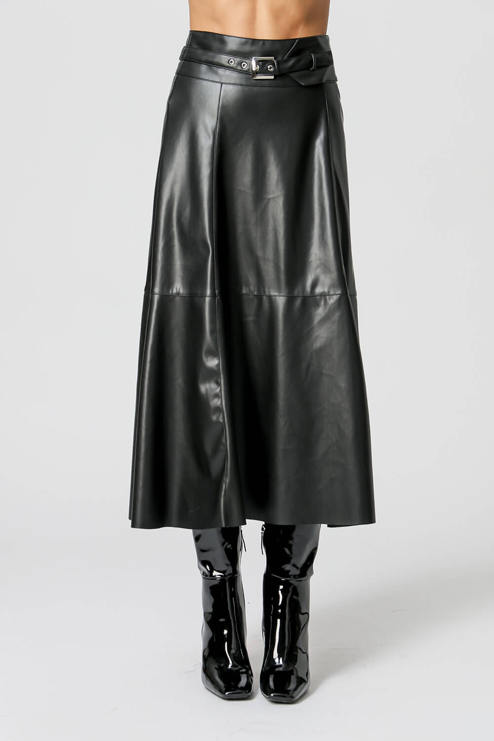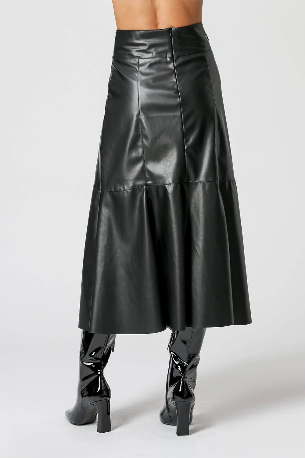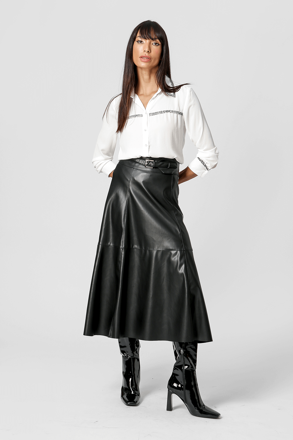 Saia midi de couro sintético com detalhe de cinto do próprio tecido, ziper na parte posterior. Um modelo elegante, versátil e coordenável que pode combinar com seu guarda-roupa.