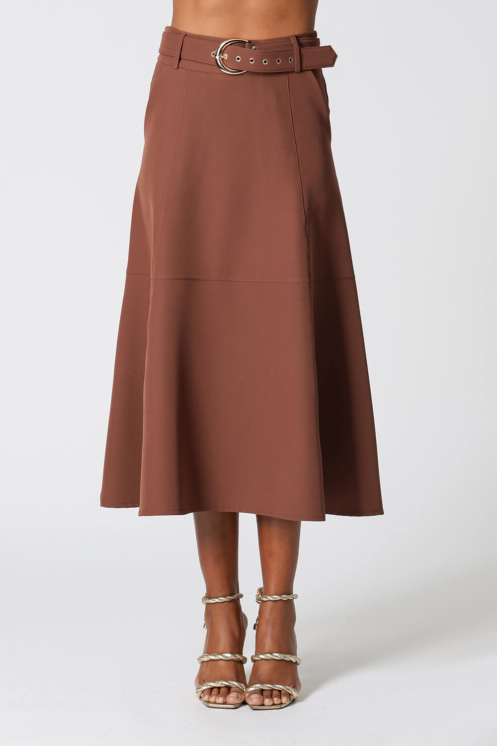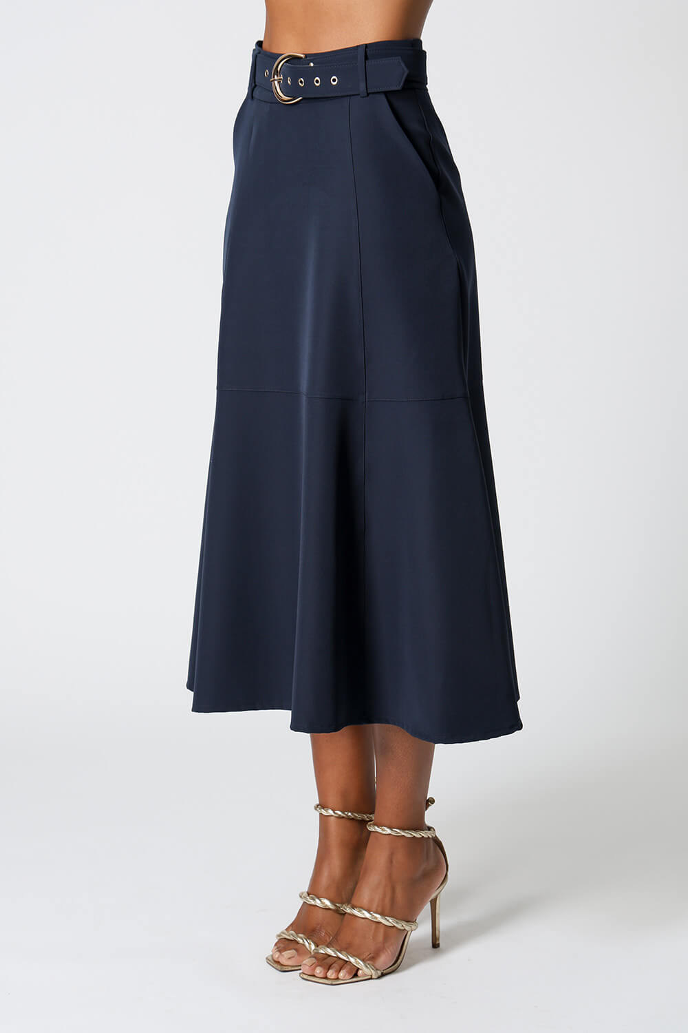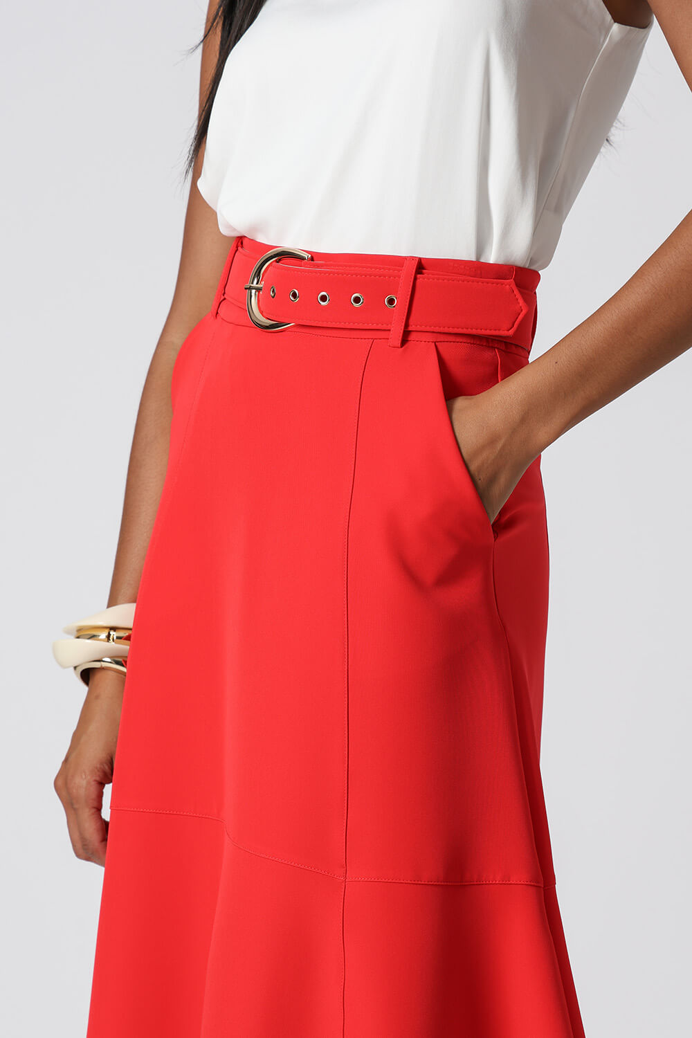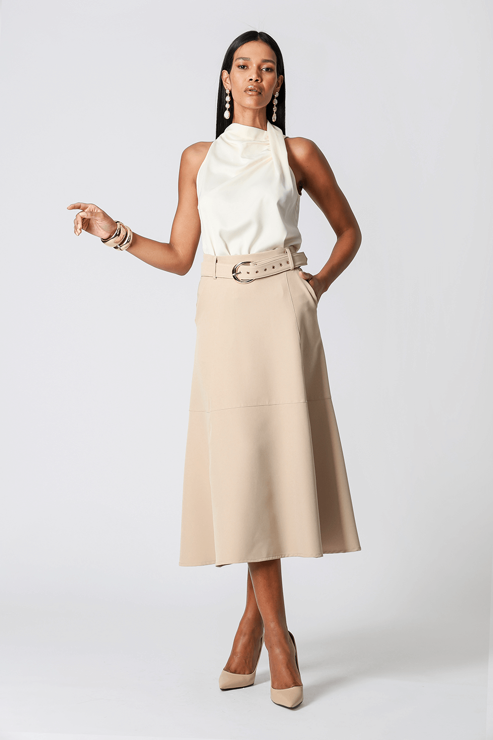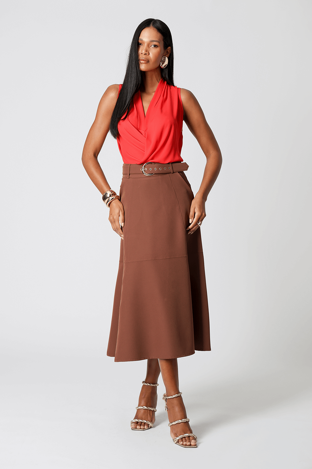 Saia midi com detalhes de recortes, uma peça elegante que te proporciona diversos looks para ocasiões especiais.