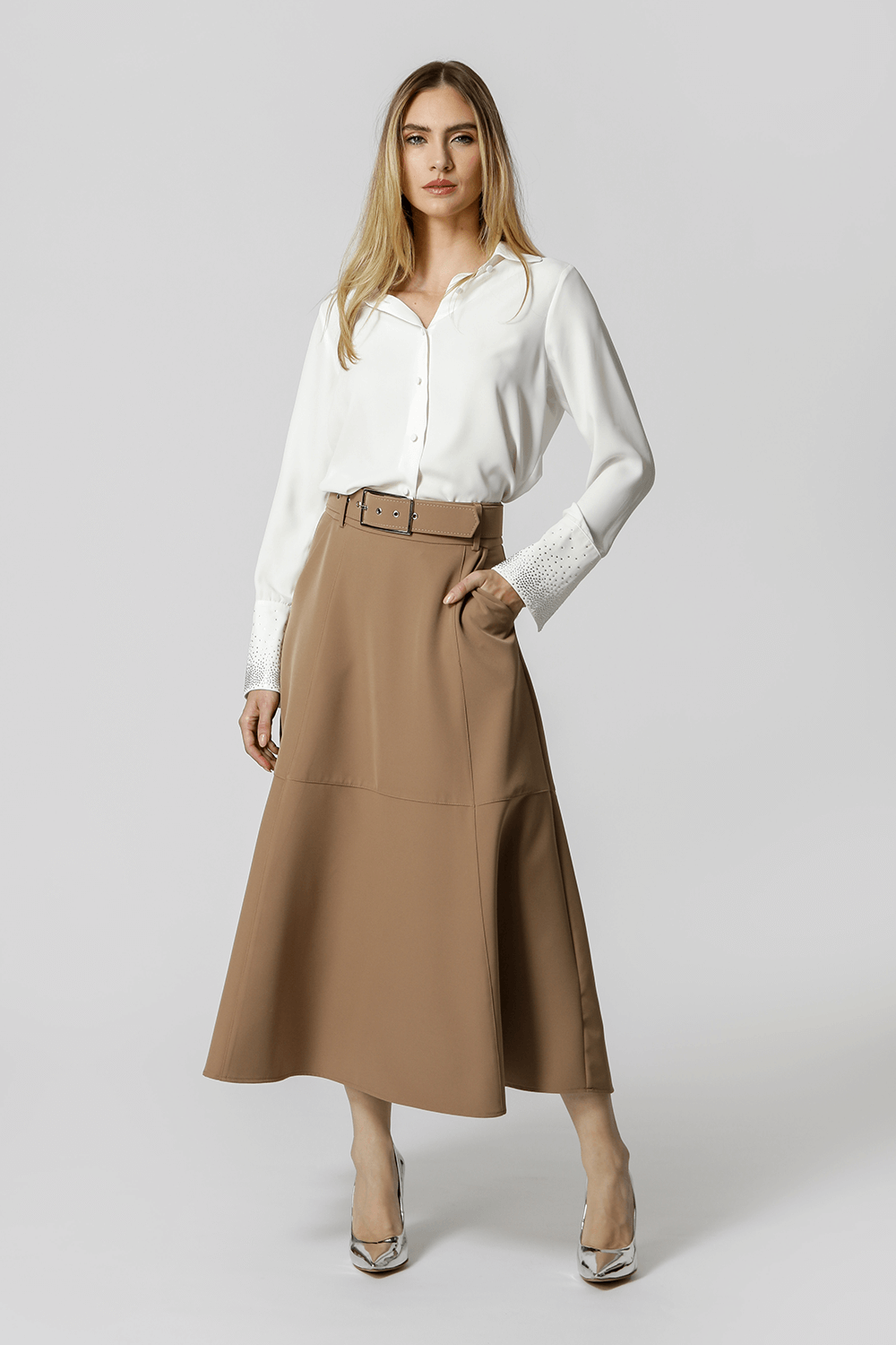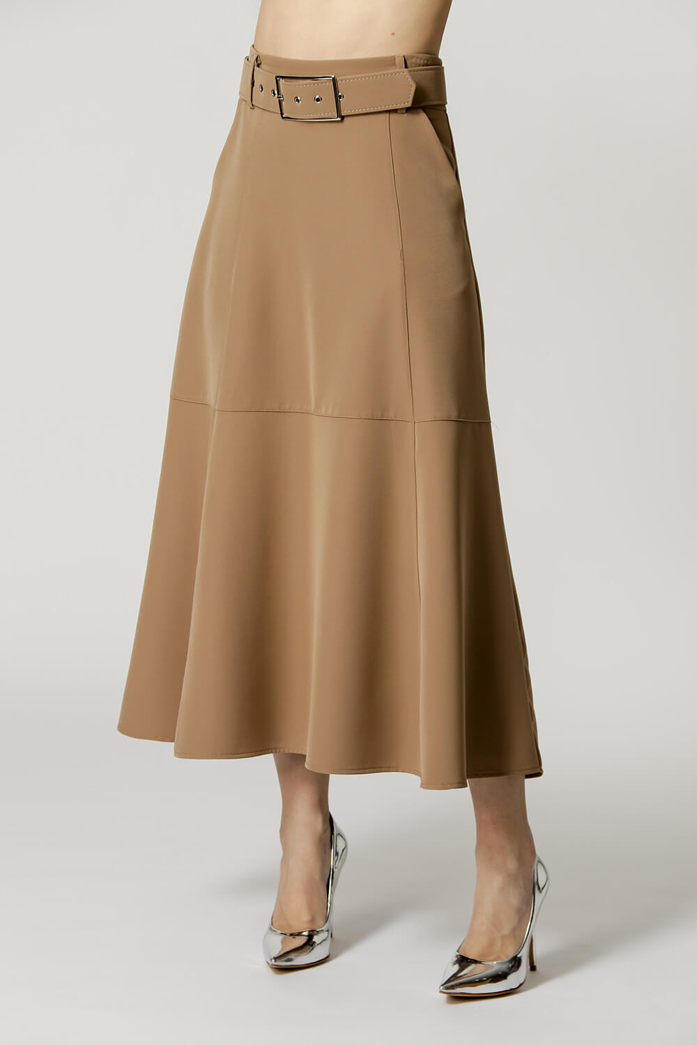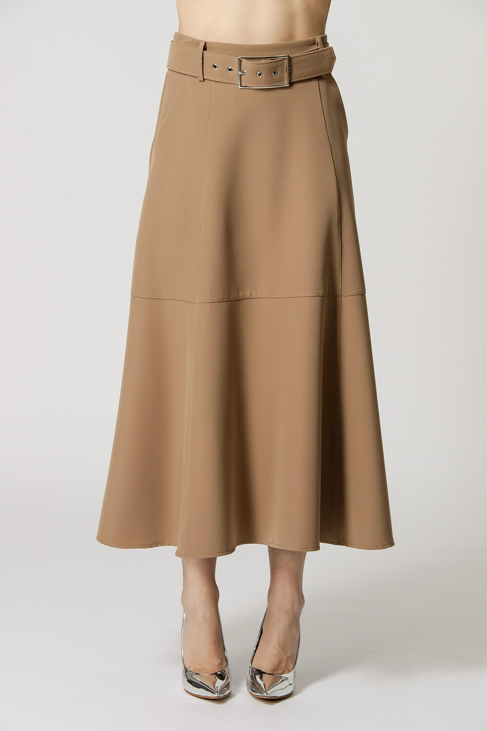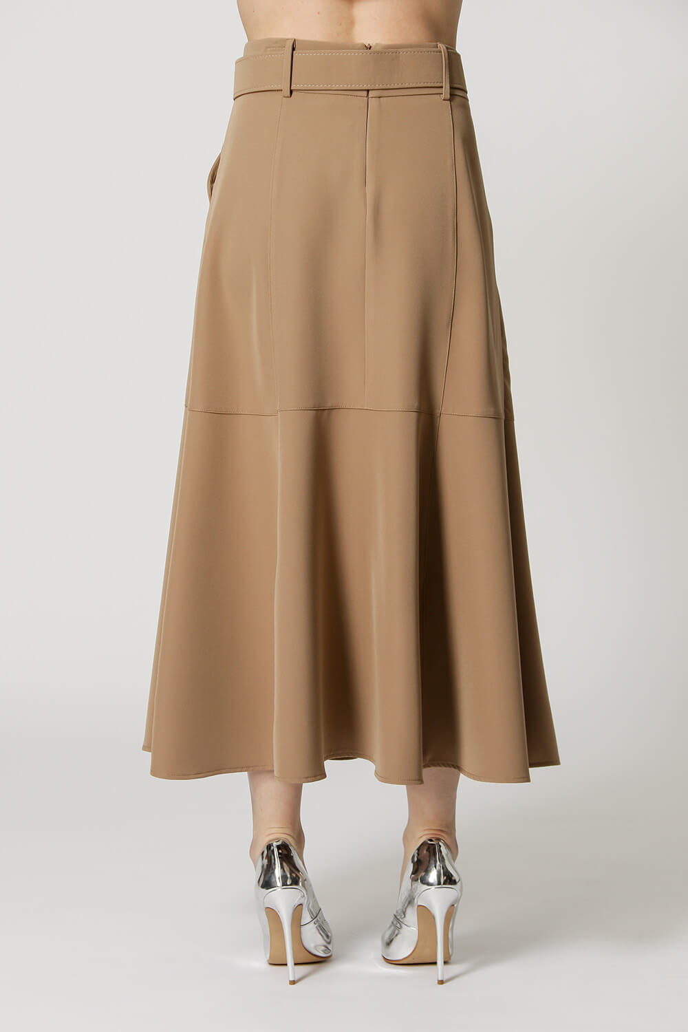Saia midi com detalhes de recortes, bolso faca, zíper invisível na parte posterior e cinto do próprio tecido costurado com fivela de metal. Modelo confeccionado em tecido alfaiataria, uma peça elegante que te proporciona diversos looks para ocasiões especiais.