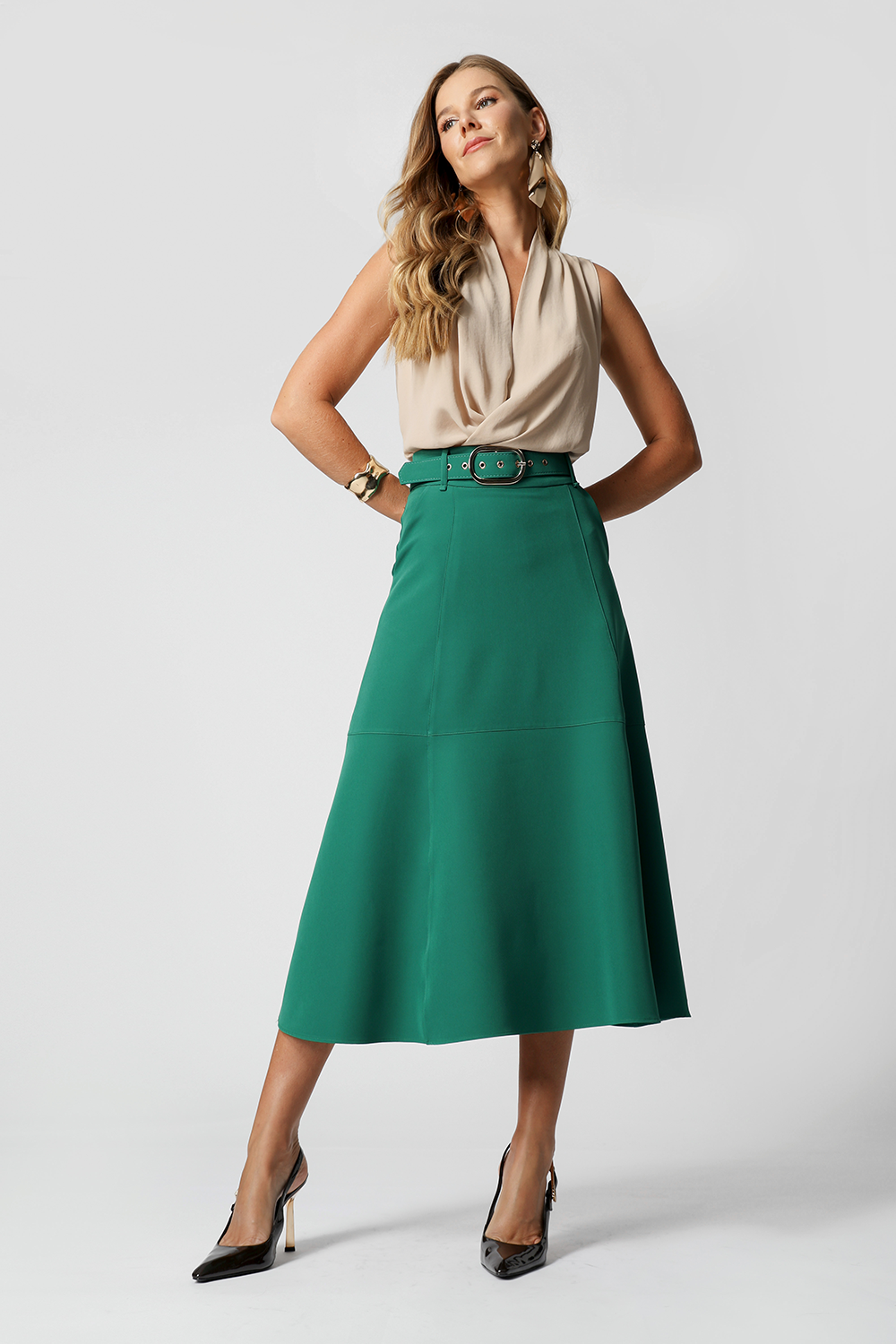 Saia midi com detalhes de recortes, uma peça elegante que te proporciona diversos looks para ocasiões especiais.