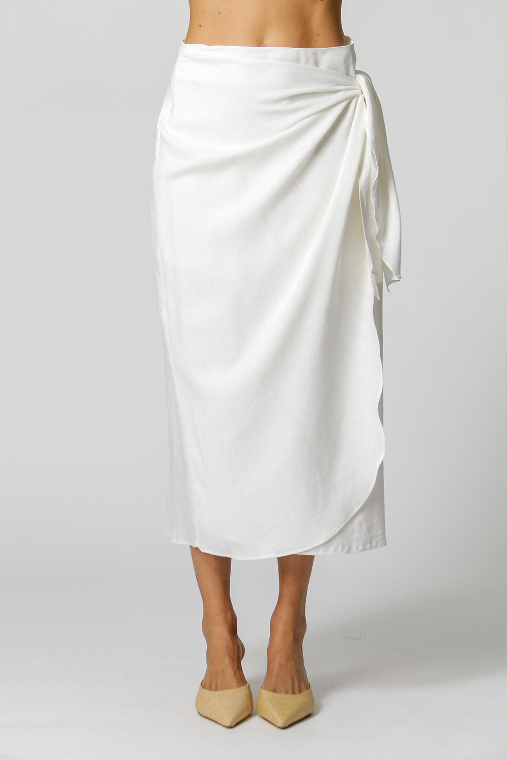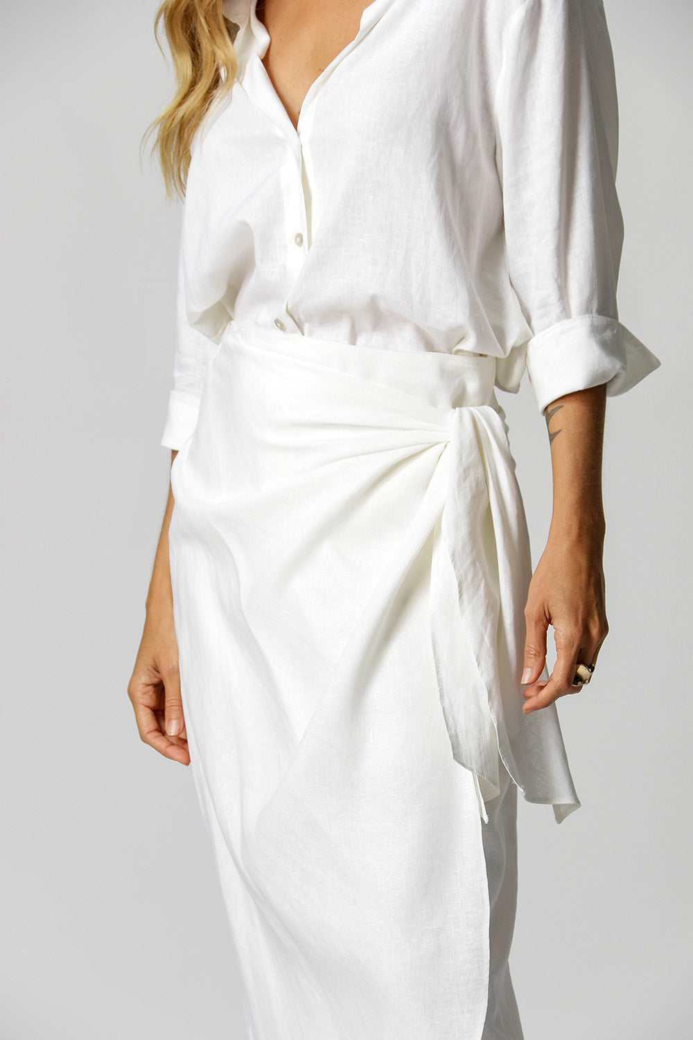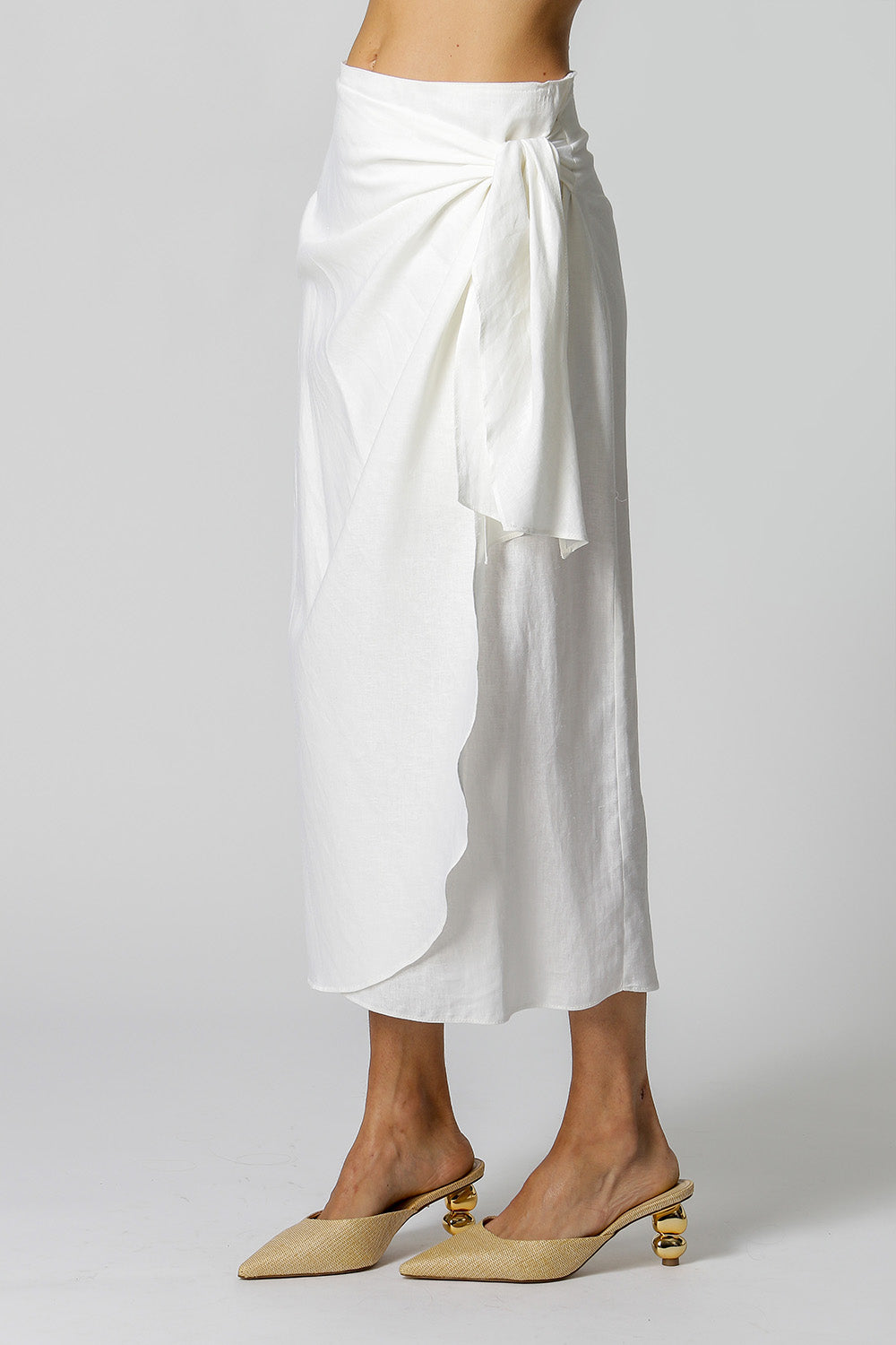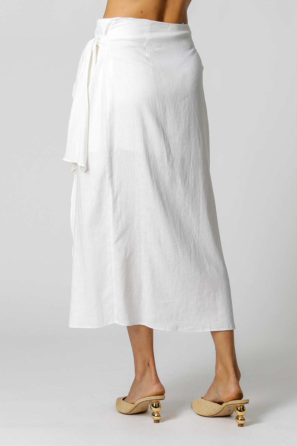 Saia média com transpasse e laço na lateral. Confeccionada em tecido Linho. Uma peça com shape confortável e cheio de charme para looks casuais no seu dia a dia.