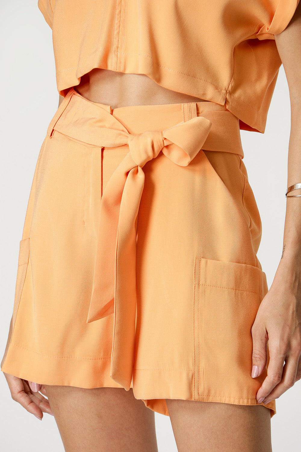 Shorts com bolsos faca, traseiros, e laterais. Cinto faixa para fazer amarração na cintura. Peça confortável e tendência para arrasar no look casual de verão.