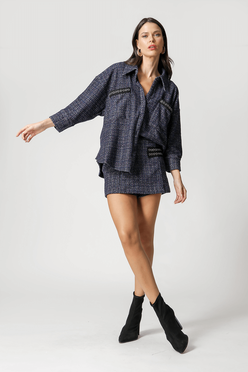 Shorts Saia detalhe strass lapela, confeccionada em tweed. Uma peça básica com um toque fashion para arrasar nas produções do dia a dia.
