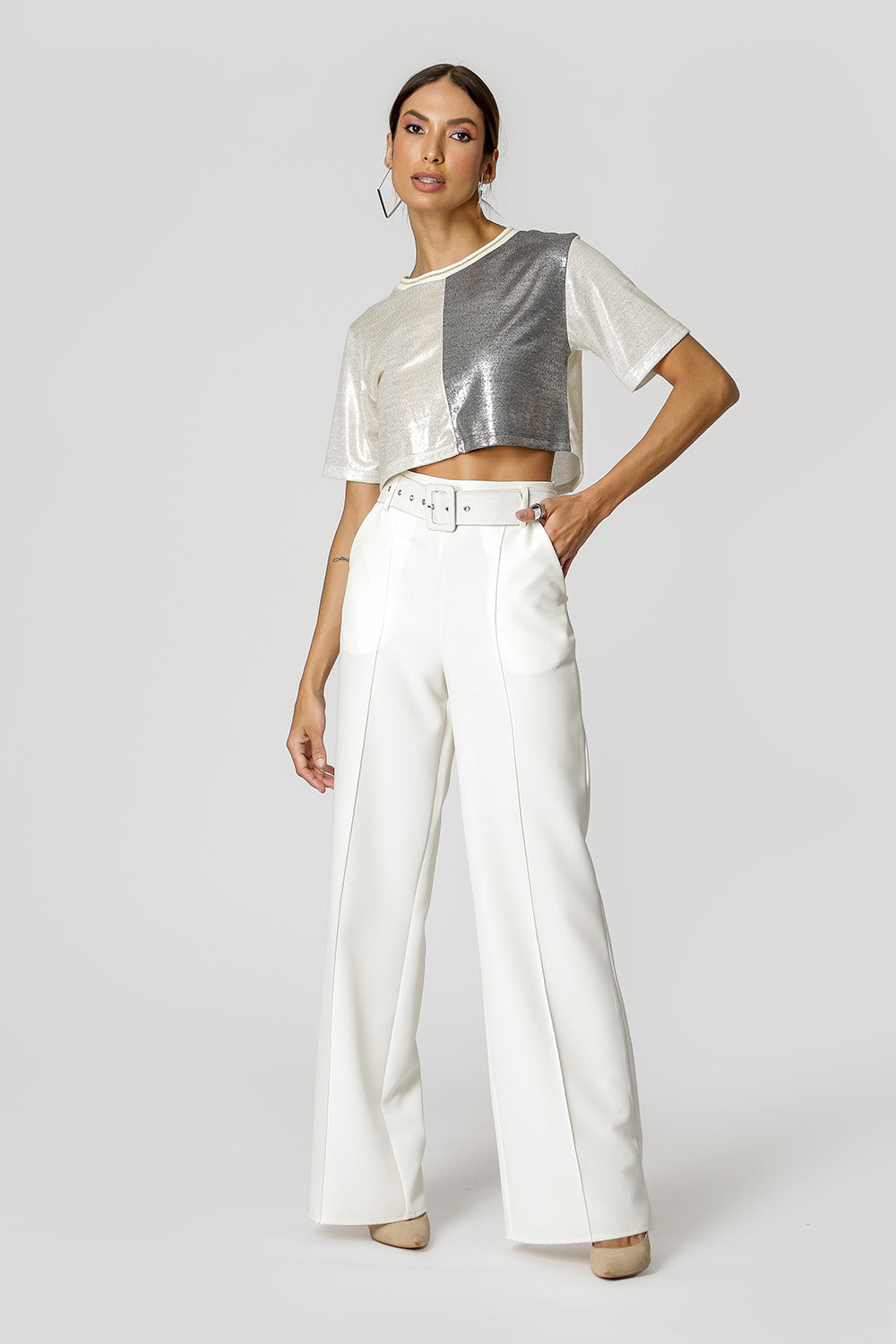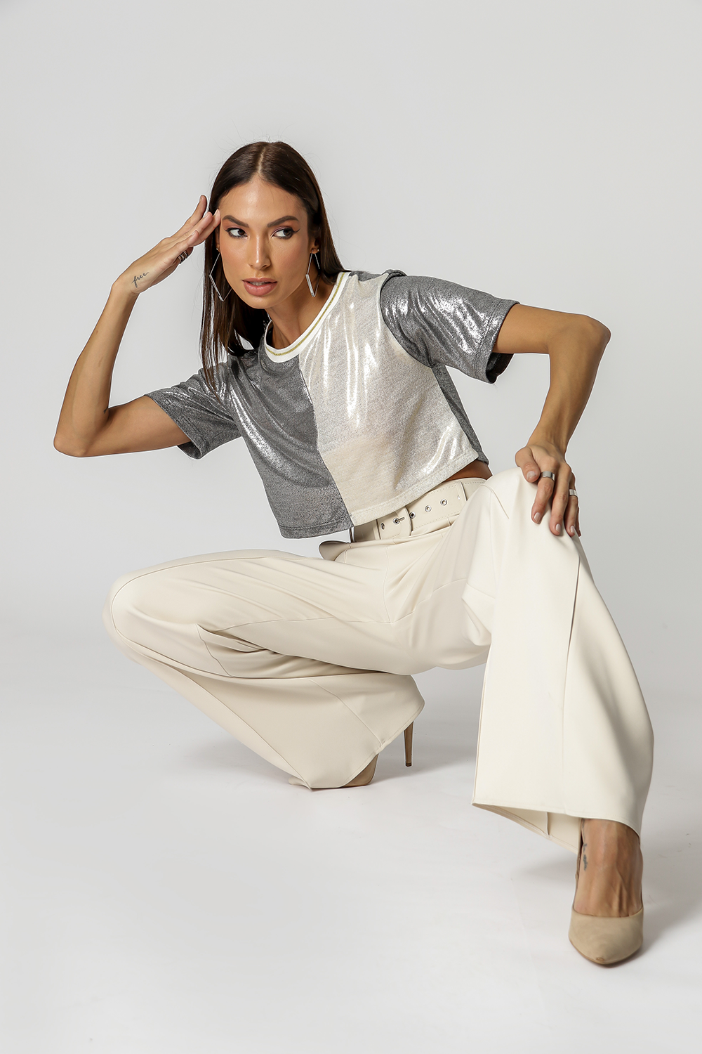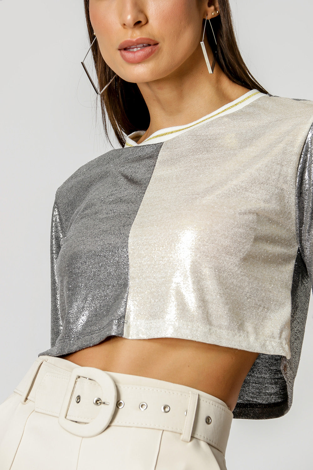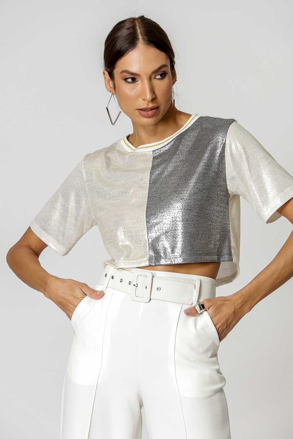 T-shirt cropped, manga curta e shape mais soltinho, peça bicolor, com detalhe de retilinea na gola. O básico diferenciado que você precisa para compor seu look night!