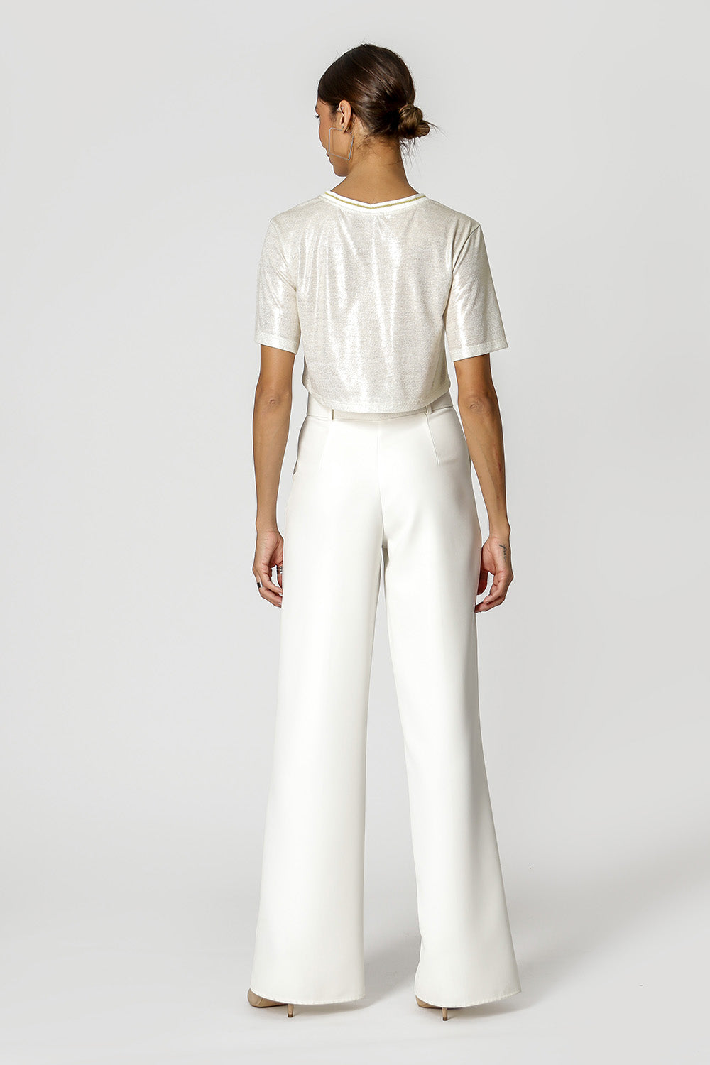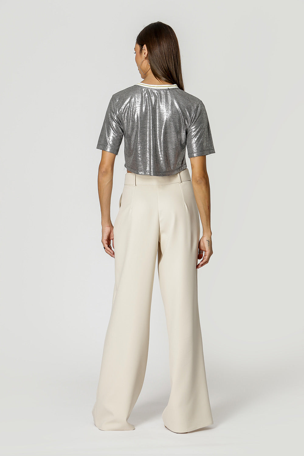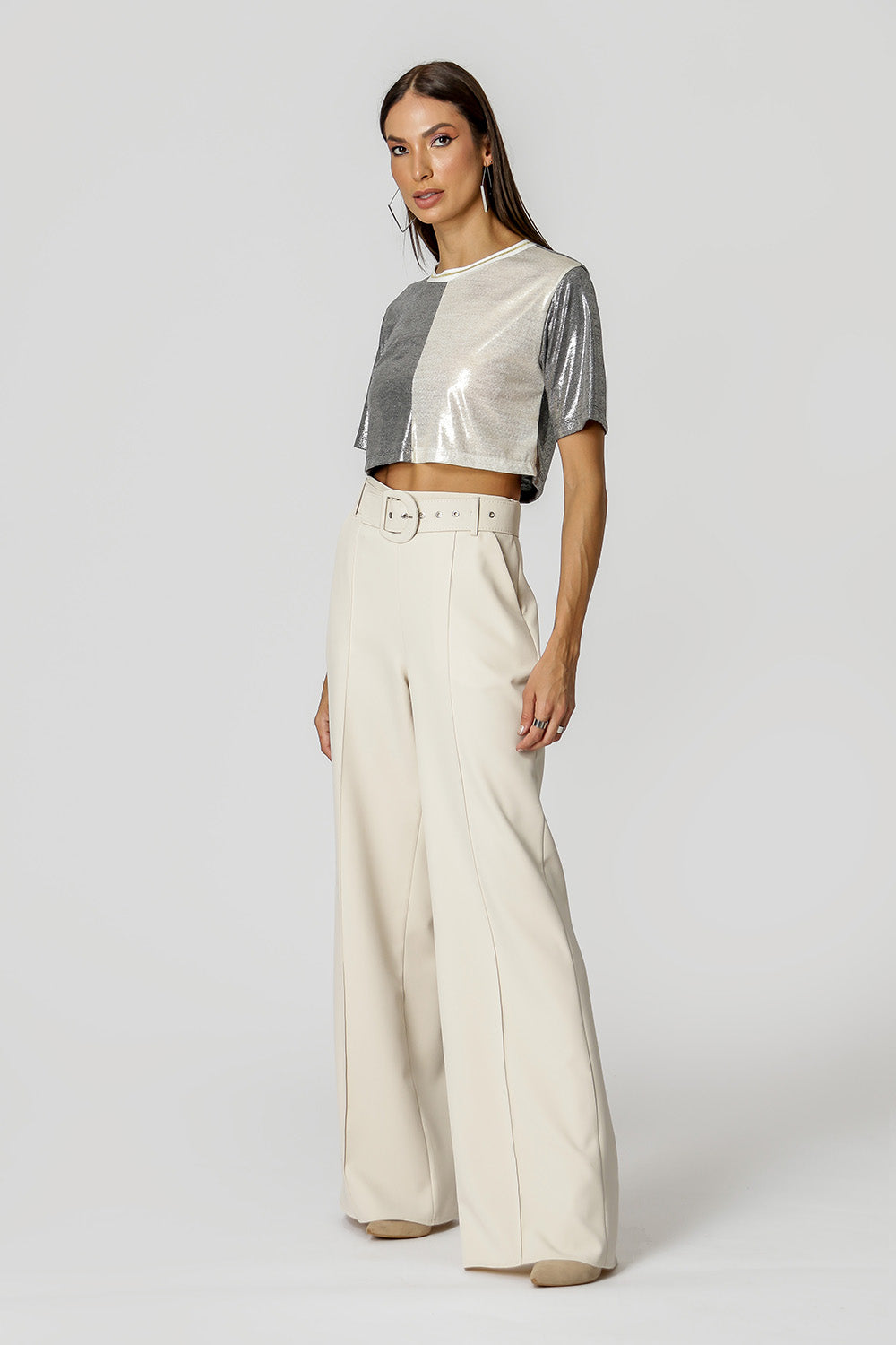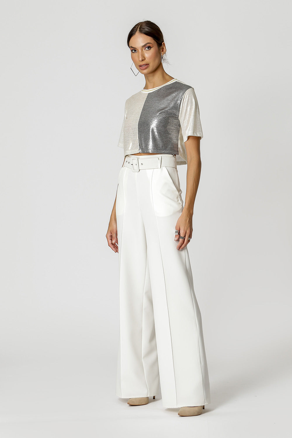 T-shirt cropped, manga curta e shape mais soltinho, peça bicolor, com detalhe de retilinea na gola. O básico diferenciado que você precisa para compor seu look night!
