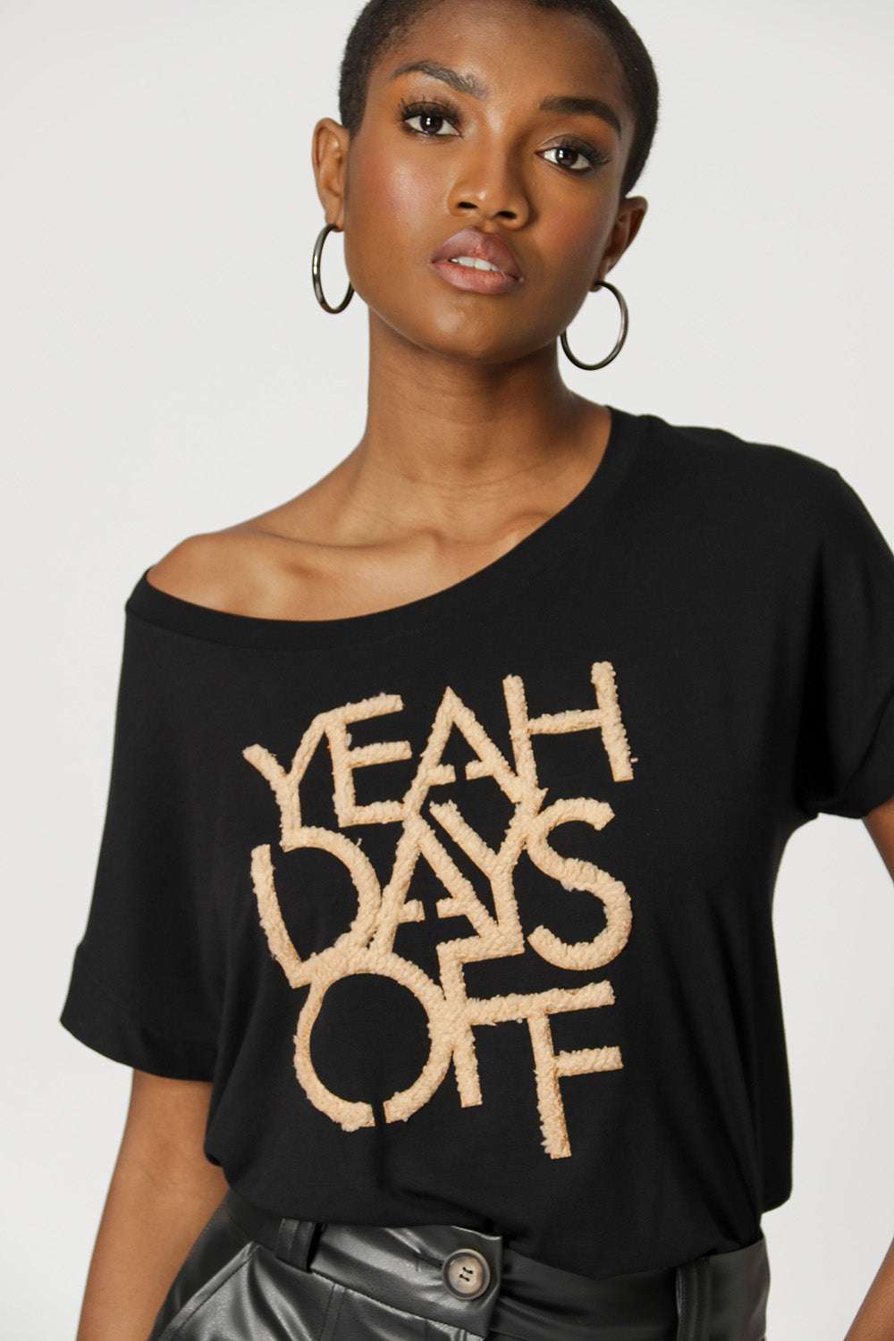 T-shirt com aplicação em floc, confeccionada em malha fluída, com comprimento longo. Ideal para look casuais e despojado.