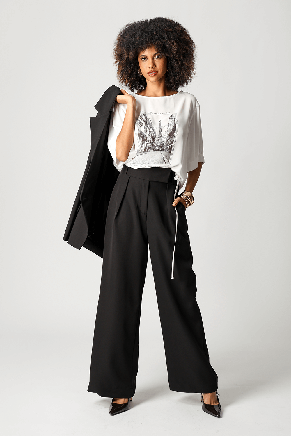 T-shirt em crepe fluido com estampa frontal e aplicação de pedrarias que trazem um toque de brilho e sofisticação. Leve, moderna e perfeita para elevar o look do dia a dia.