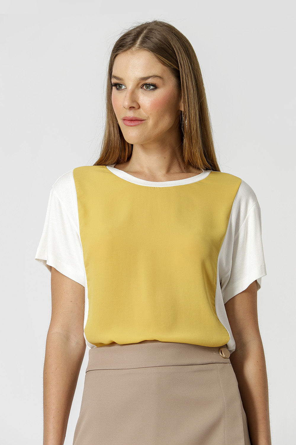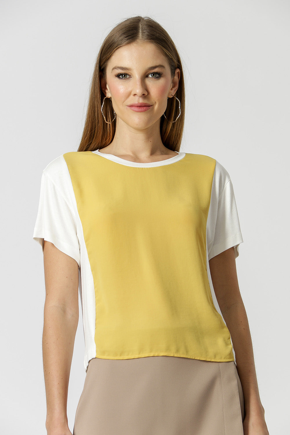 T-shirt com shape mais soltinho, recortes e mix de tecidos. Feita em Malha max e crepe fluído. O básico diferenciado que vai dar um UP no seu look!