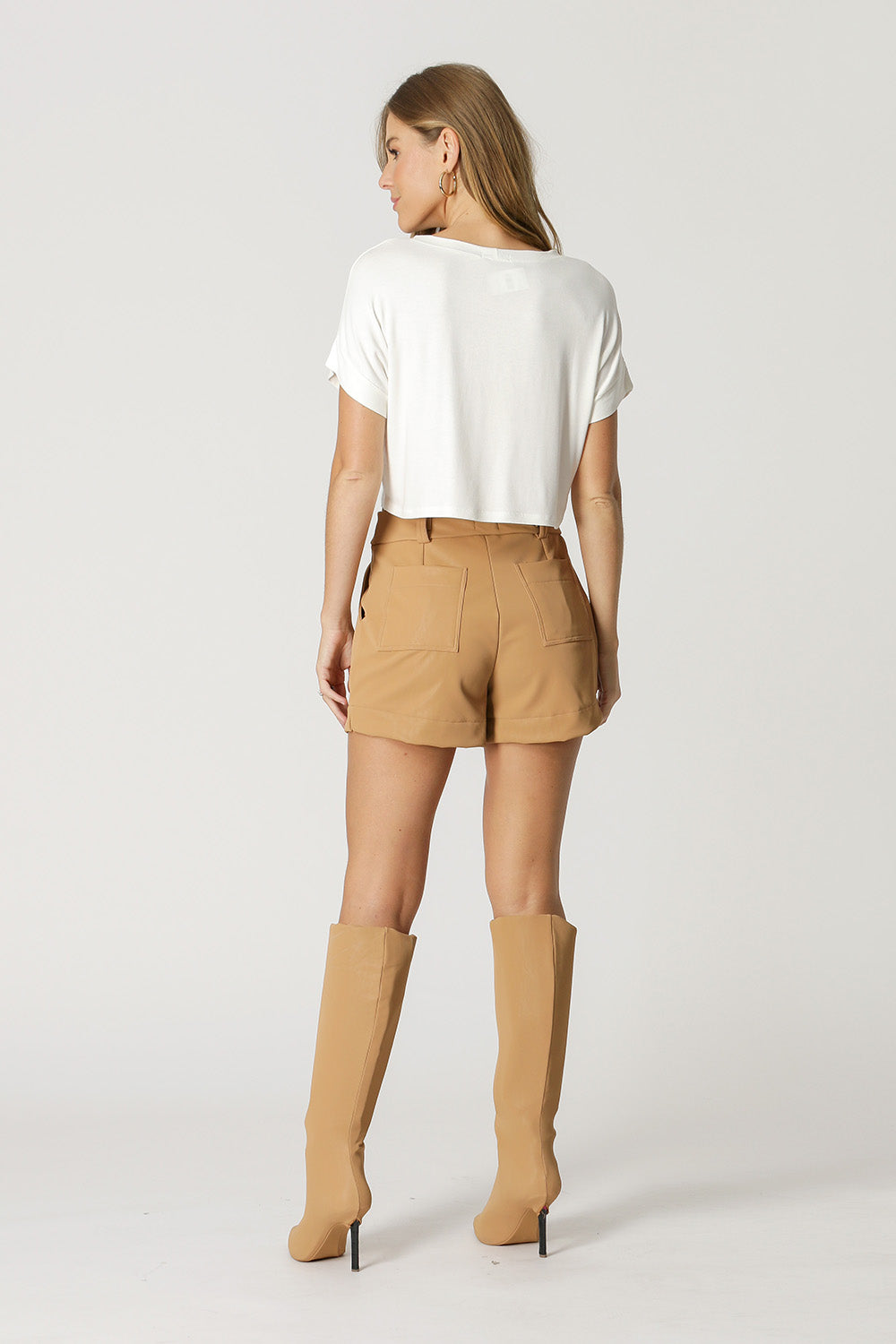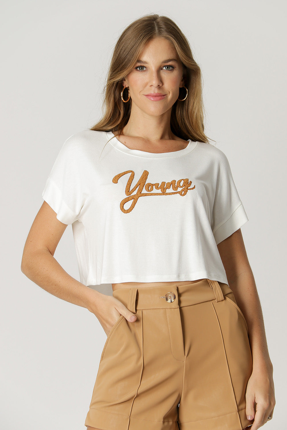 T-shirt com aplicação com camulfur na frente, confeccionada em malha max, comprimento cropped. Linda peça que pode ser usada com peças de alfaiataria, deixando um look despojado.