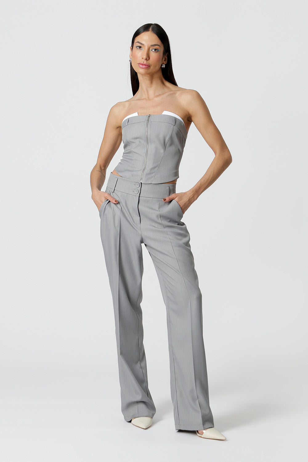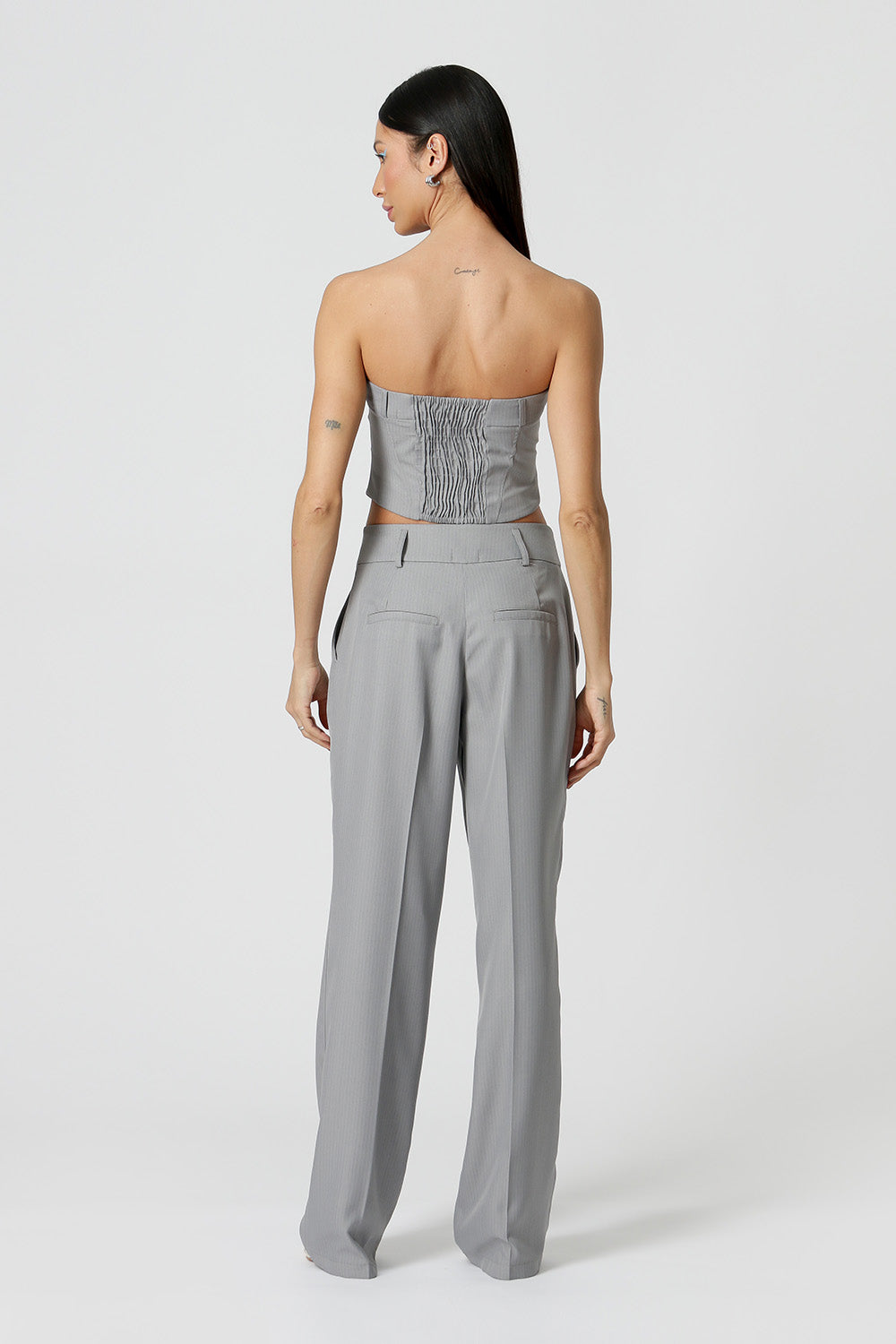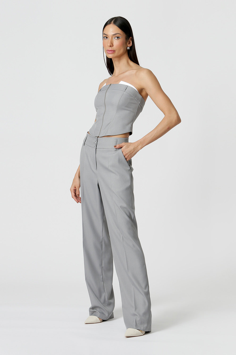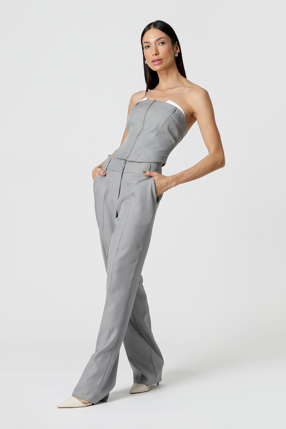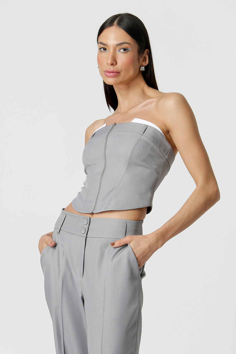 Blusa shape corset, confeccionada em alfaiataria risca de giz e detalhe no busto. Peça com informação de moda atual e moderna.