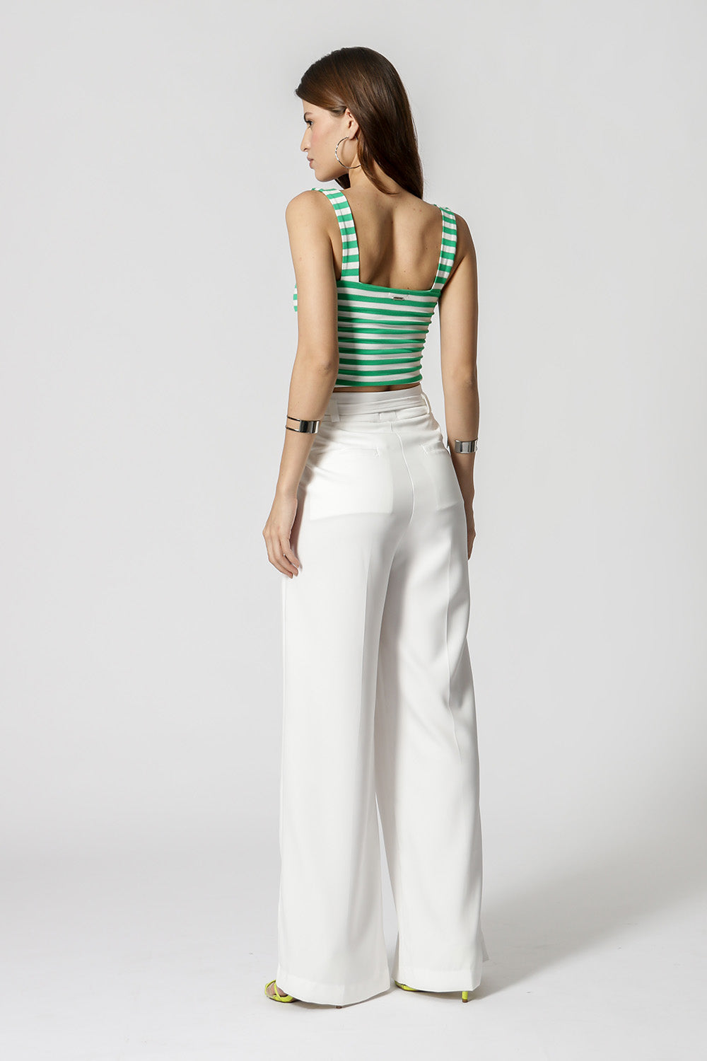 Top cropped de alça larga feito em malha listrada, uma peça prática para diversos looks.
