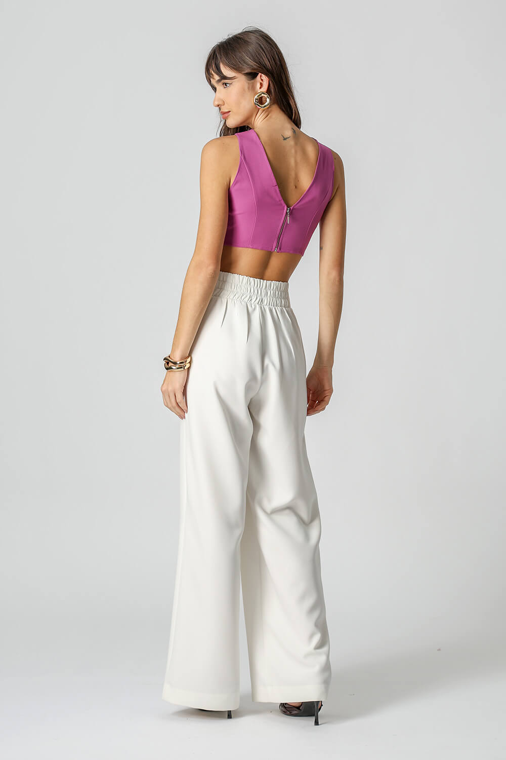 Blusa cropped com shape mais ajustado ao corpo. Possui zíper nas costas e detalhe na barra. Confeccionada em alfaiataria.