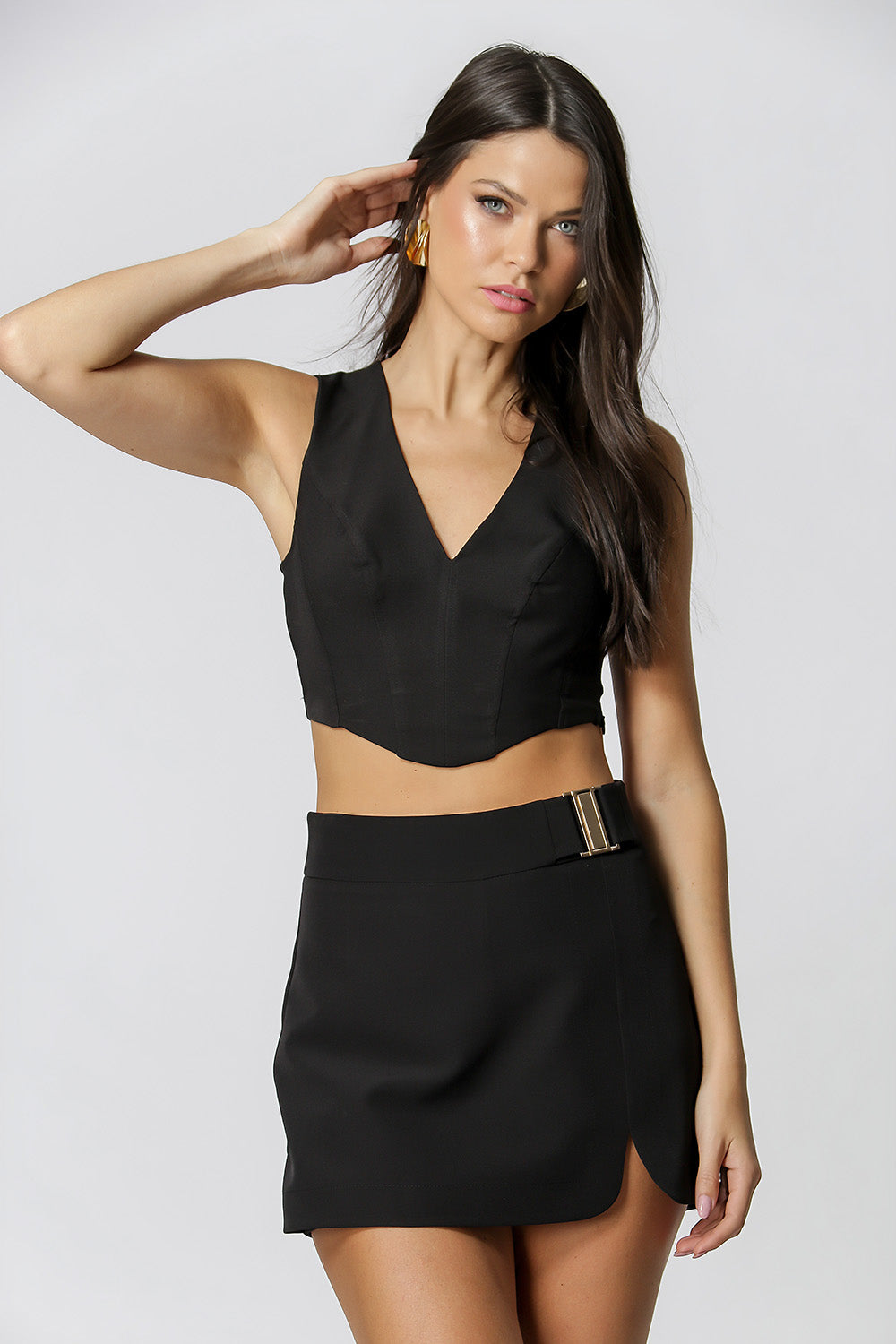Top cropped com alça larga, com recortes que seguem a tendência dos corsets, feito em alfaiataria, uma peça atual para um look de moda.
