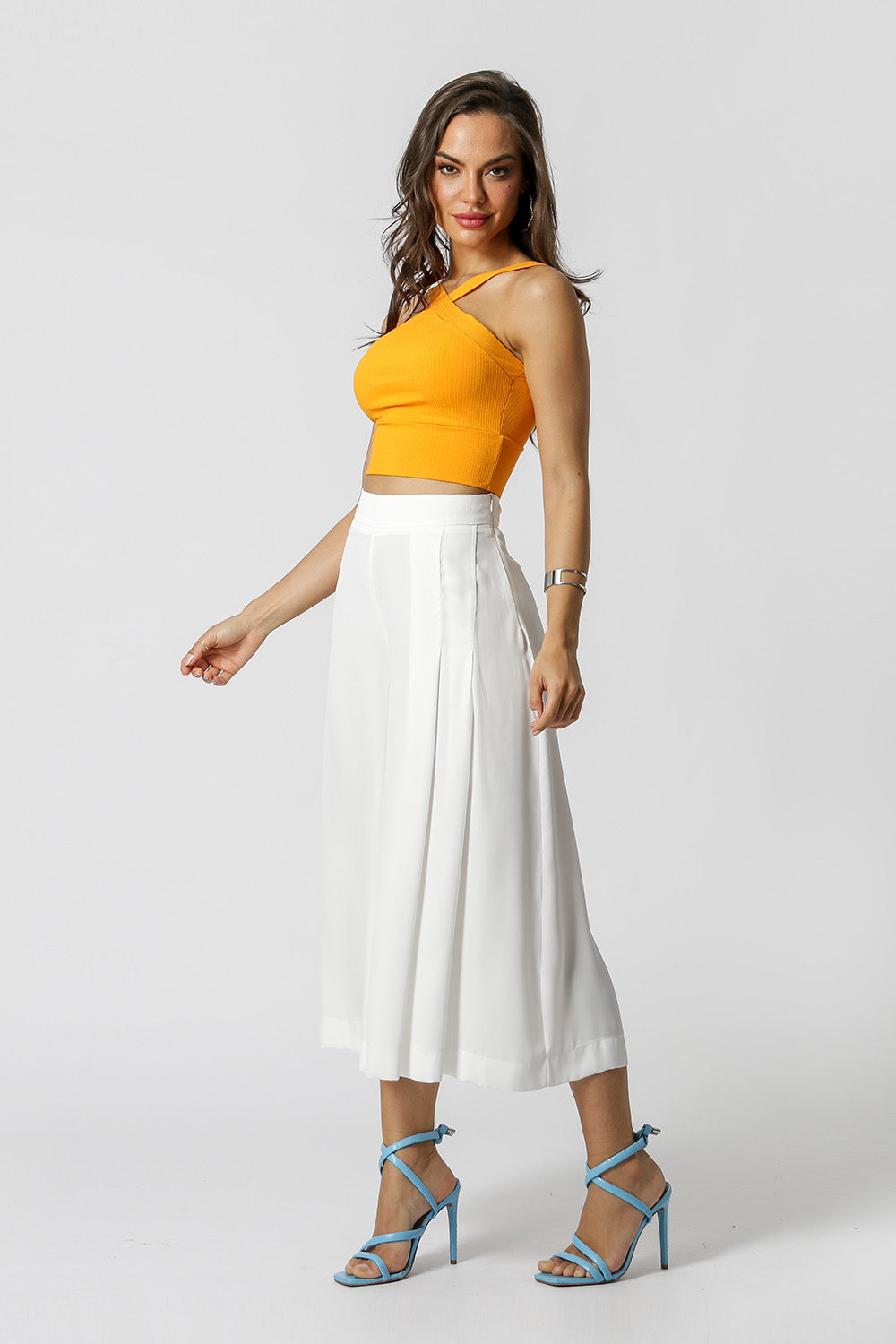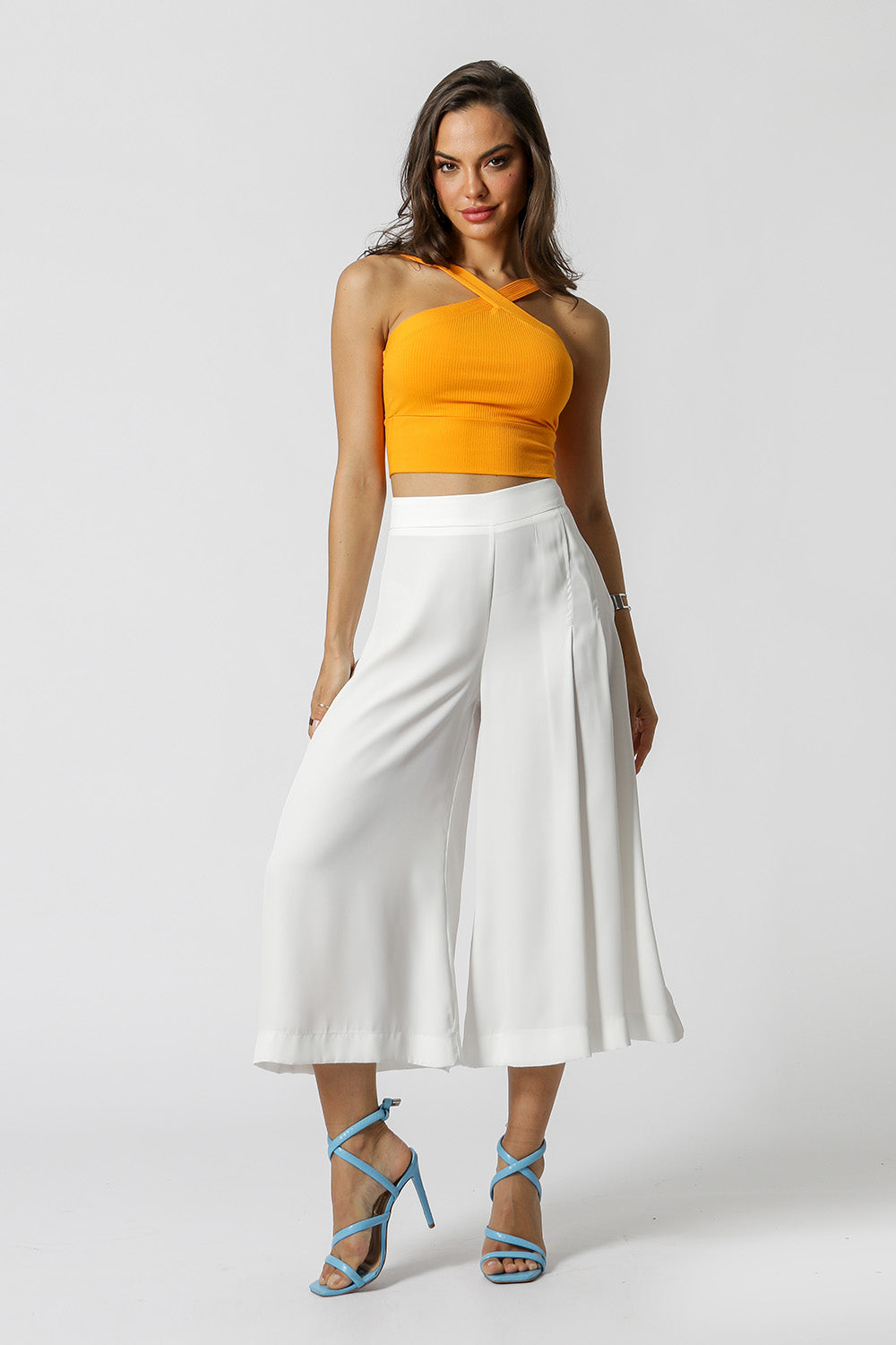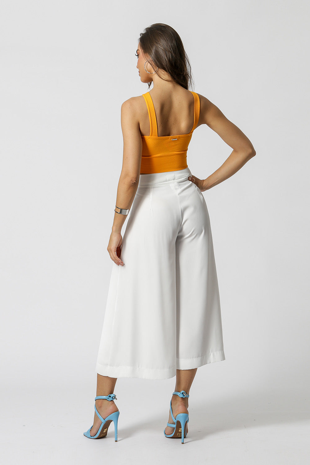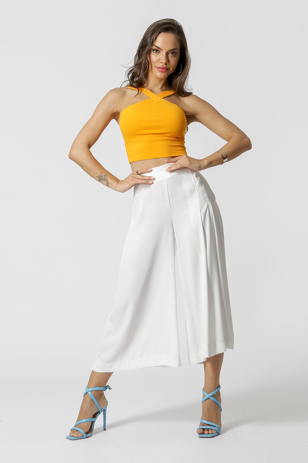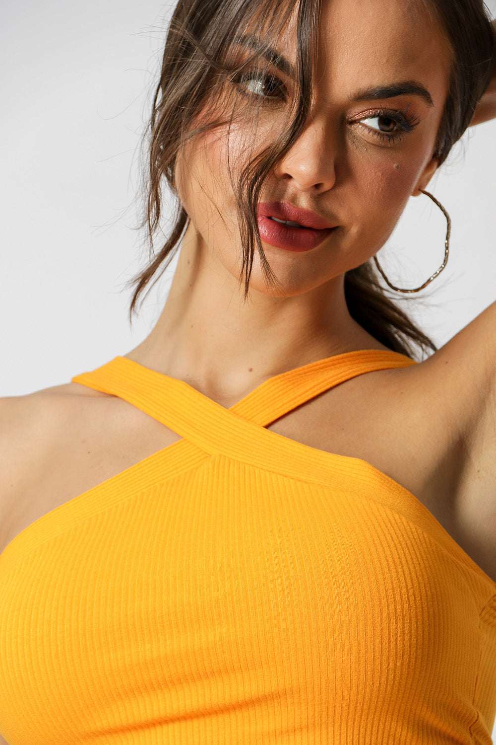 Top cropped confeccionado em malha canelada, decote em X com alças cruzadas. Uma peça versátil e fácil de combinar, indispensável no seu closet.