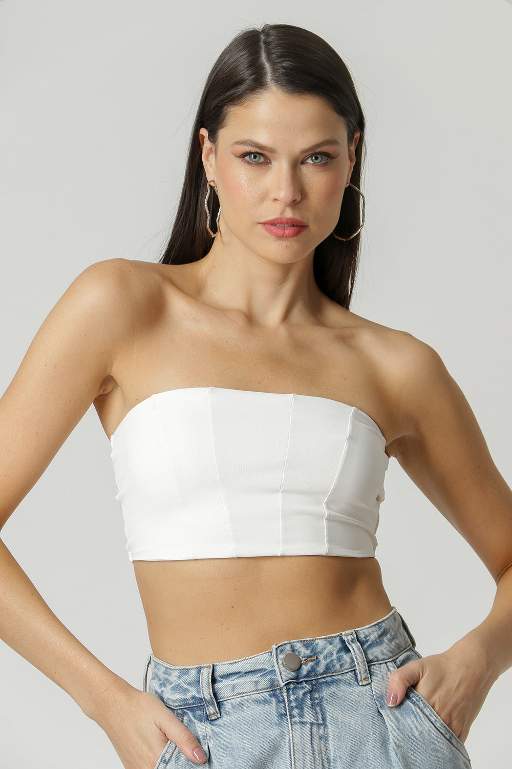 Top faixa com recortes estilo corset. Feito em malha poliamida super confortável. Uma peça super versátil, ideal para combinar com sobreposições mais casuais.