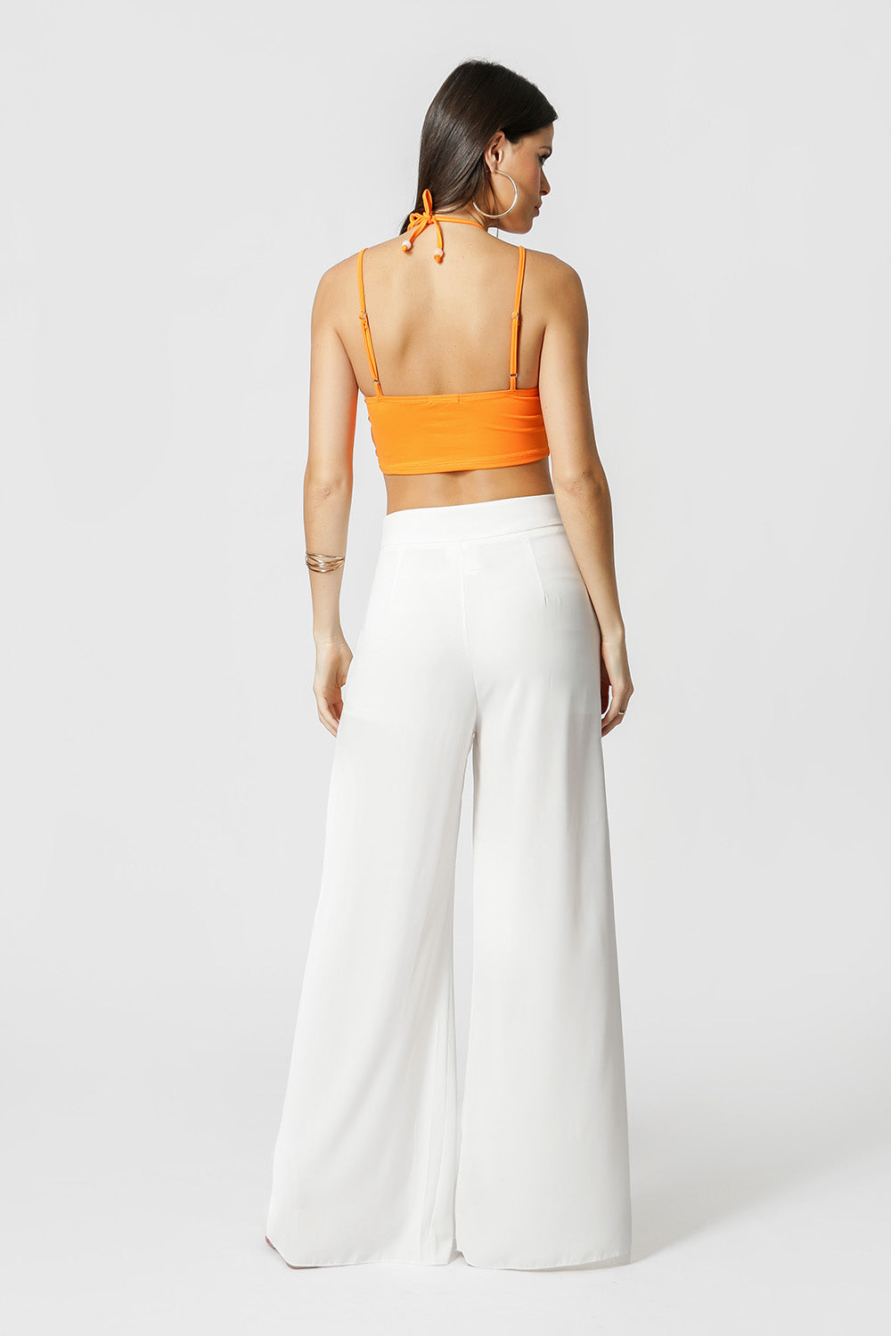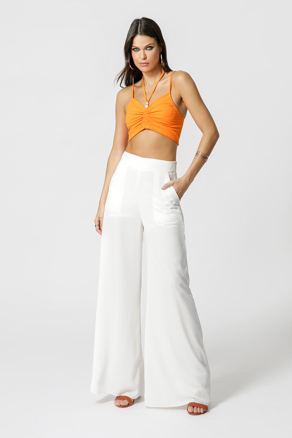 Top cropped franzido no decote, com aviamentos de resina para valorizar. Tendência para abusar nesse verão!