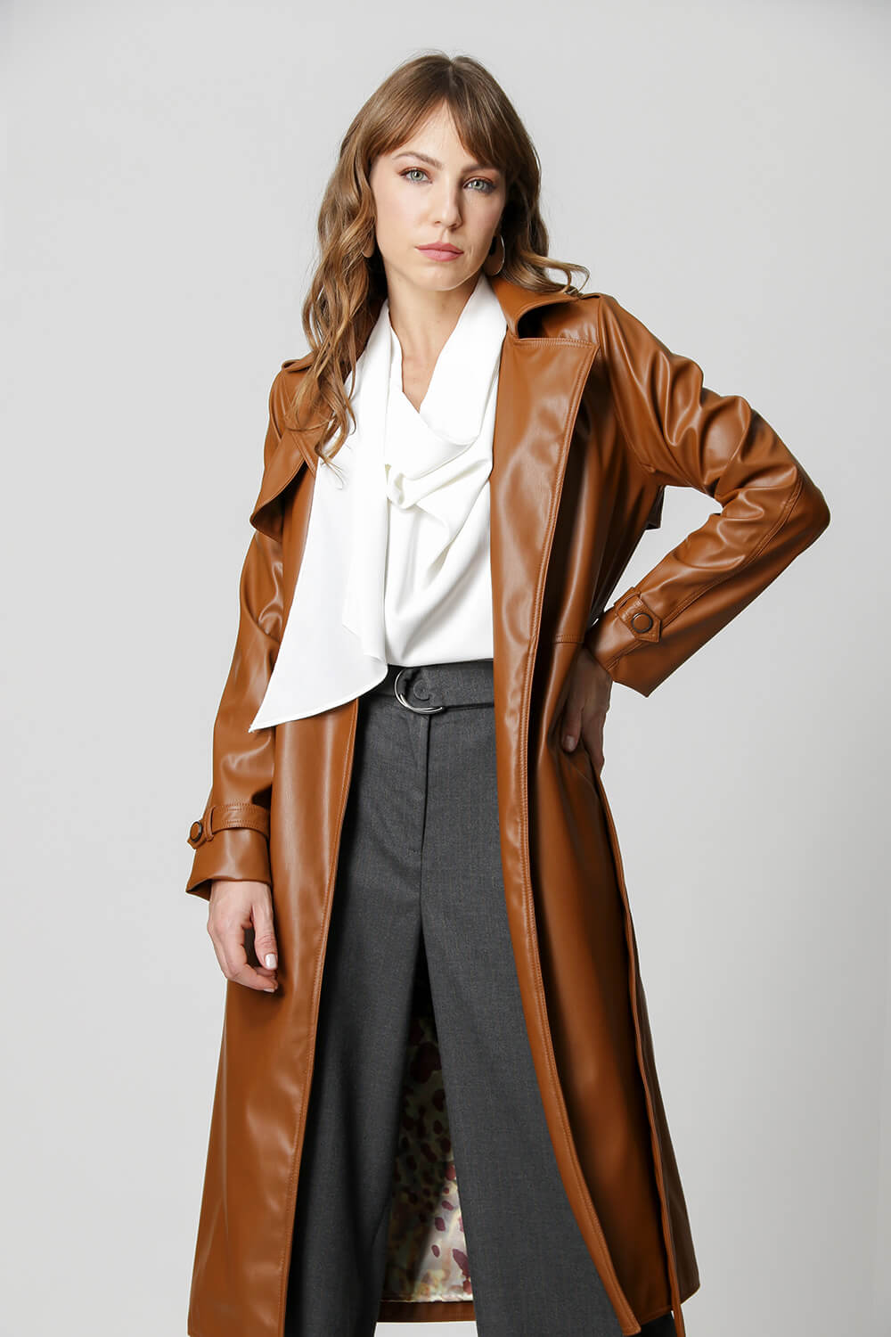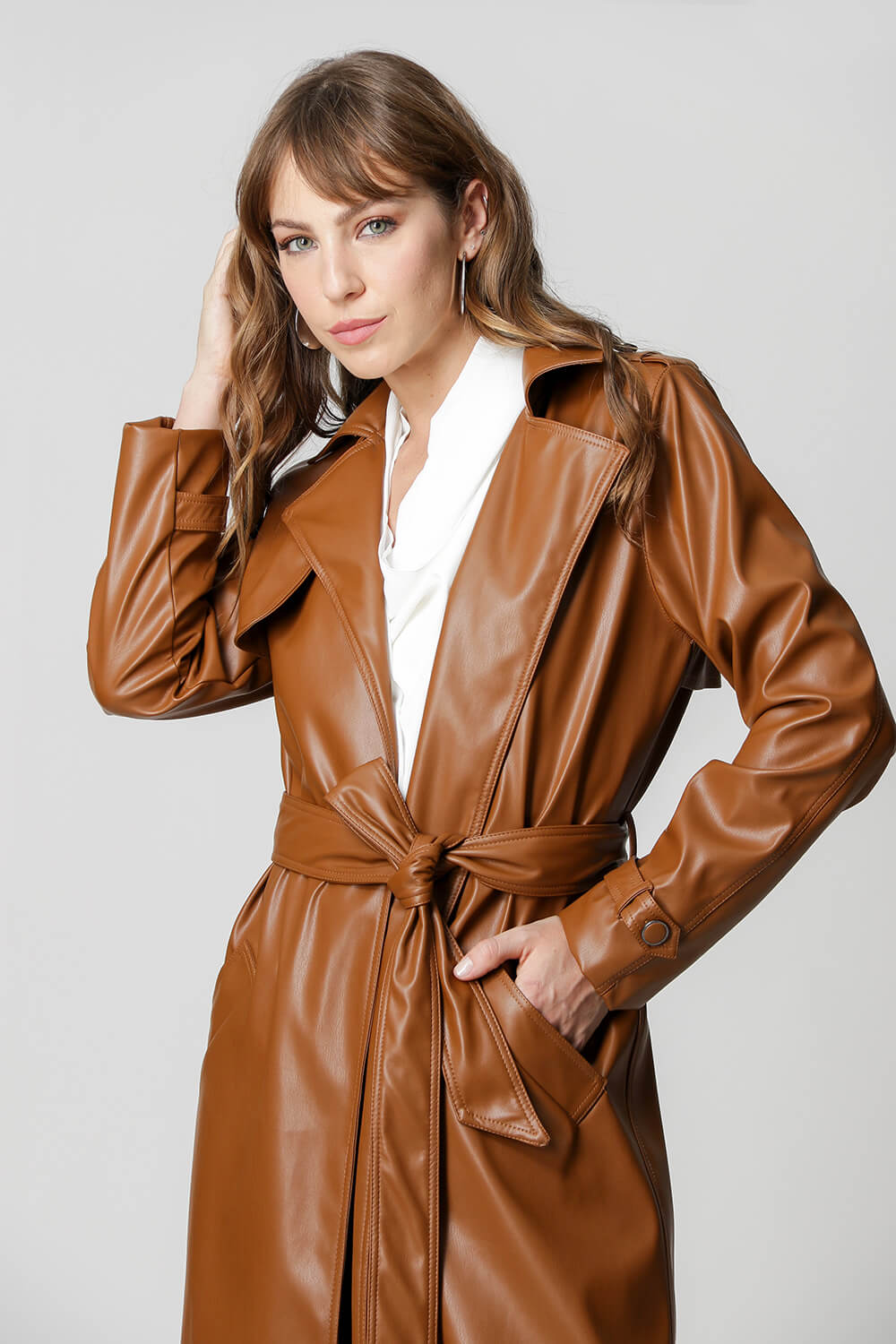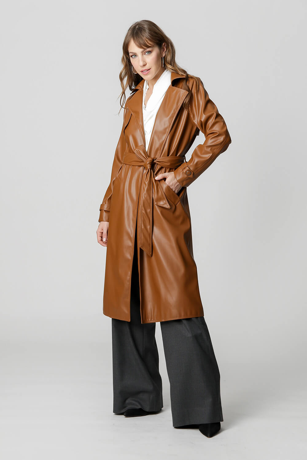 Trench coat com botões forrado do próprio tecido com bolso,faixa para prender na cintura.Um modelo confeccionado em tecido couro sintético.Uma peça classica e necessária em qualquer guarda-roupa para compor diversos looks.