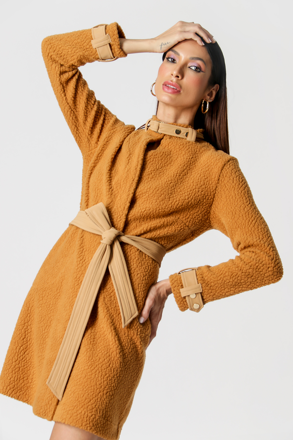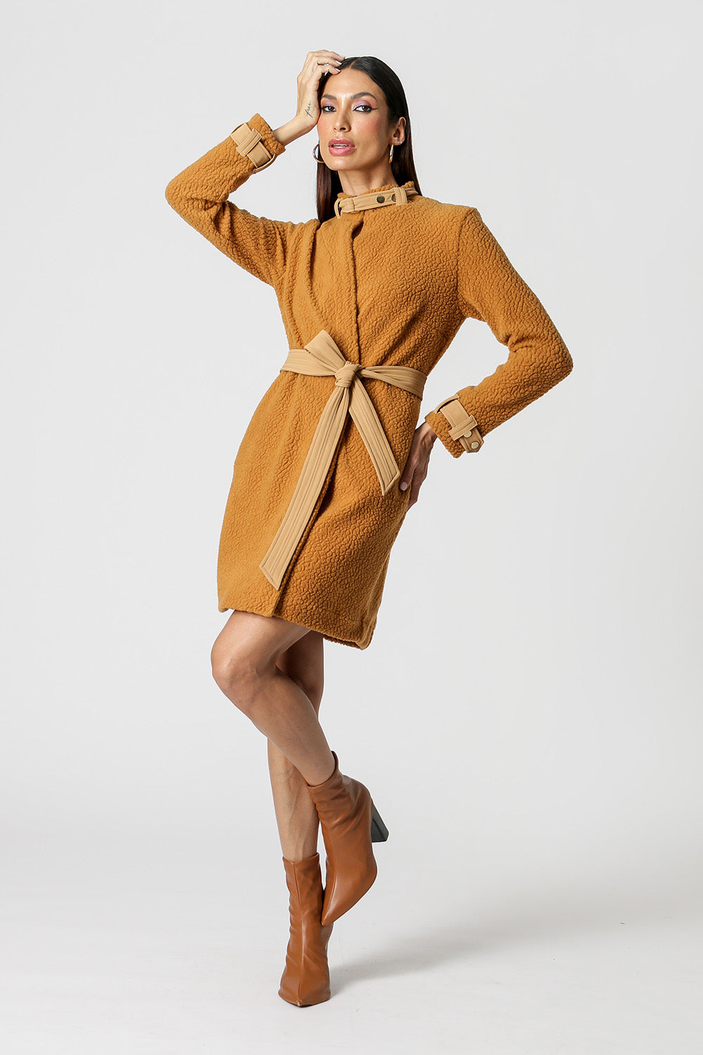 Trench coat com detalhes de fivelas e botões no martingale em couro pu. Peça confeccionada em tecido camel fur, super confortável e trendy no inverno.