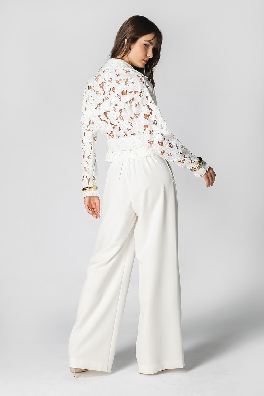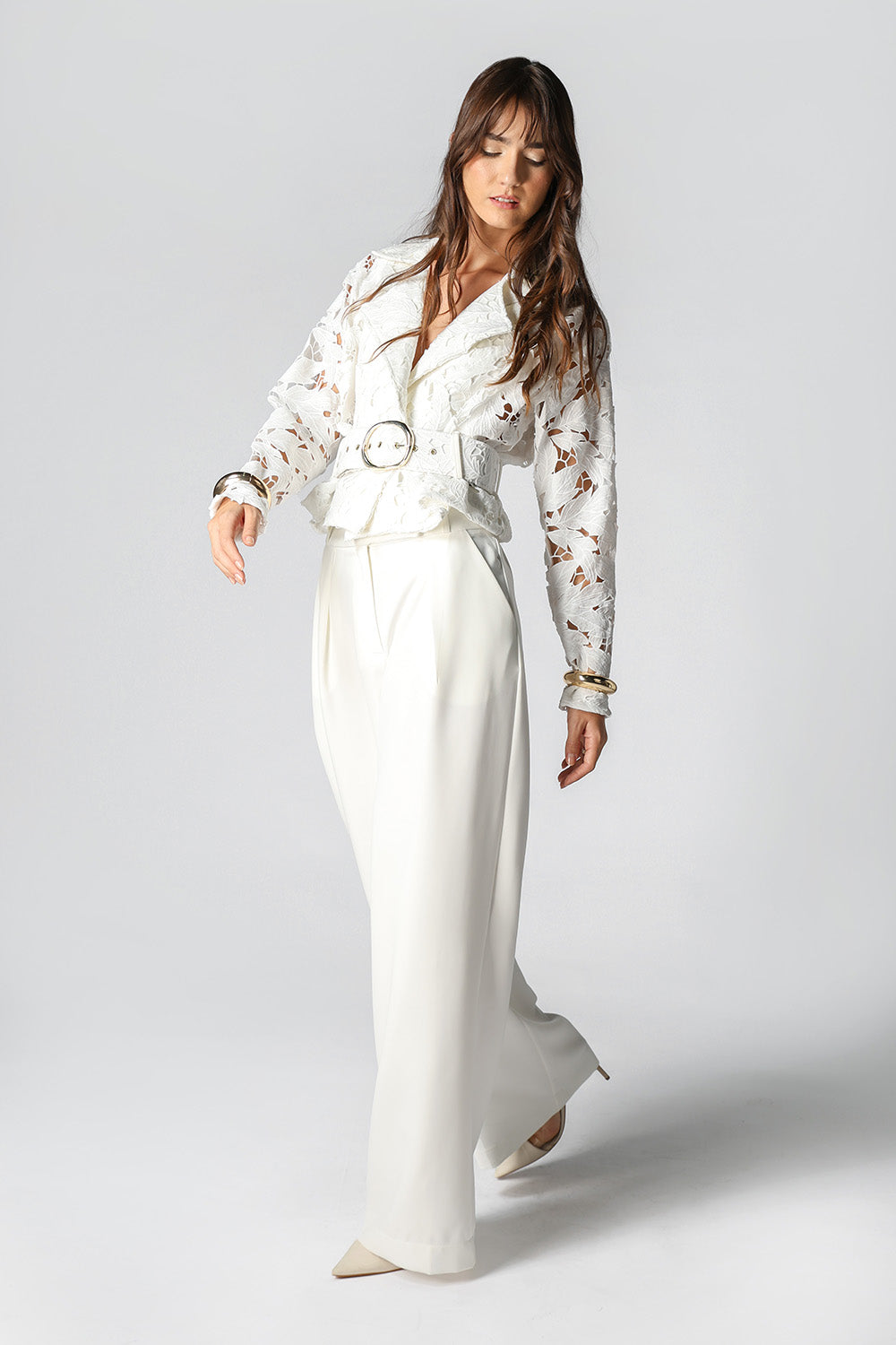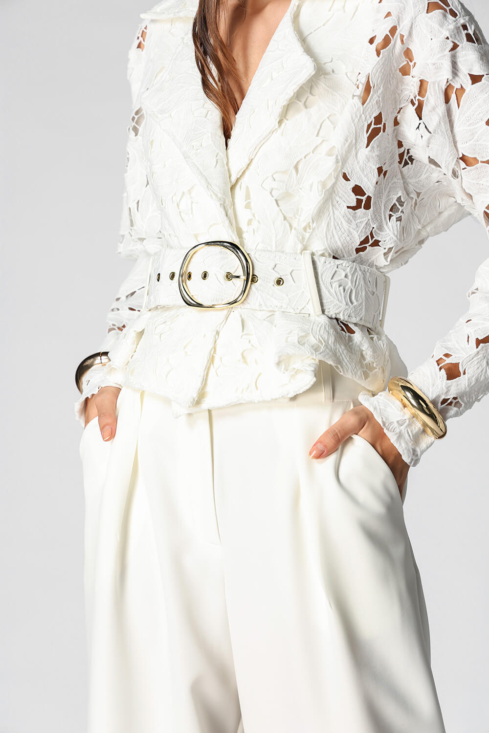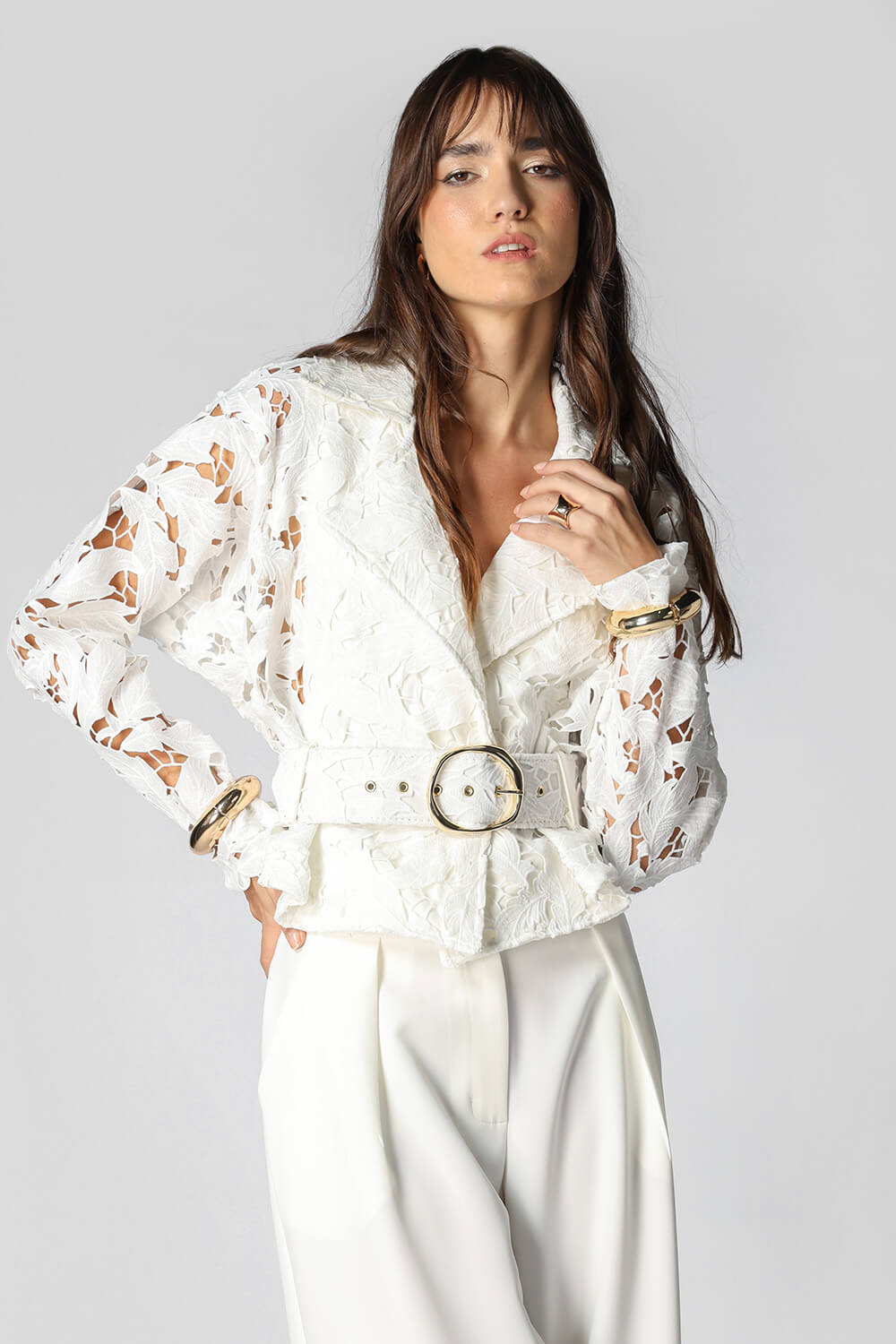 Trench cropped de renda com cinto do próprio tecido e fivela dourada, que combina delicadeza e sofisticação. Perfeito para um look refinado e versátil, adicionando elegância a qualquer ocasião.