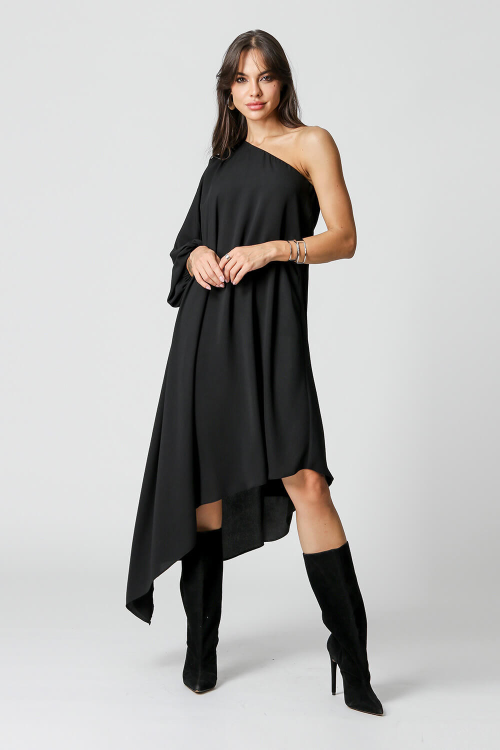 Vestido assimétrico com detalhe de capa, mangas com leve bufante e como complemento um cinto com fivelas de metais. Modelo confeccionado em tecido crepe com leve textura. É uma peça bem elagante, moderna e que para momentos casual ele é perfeito, aposte nessa peça.