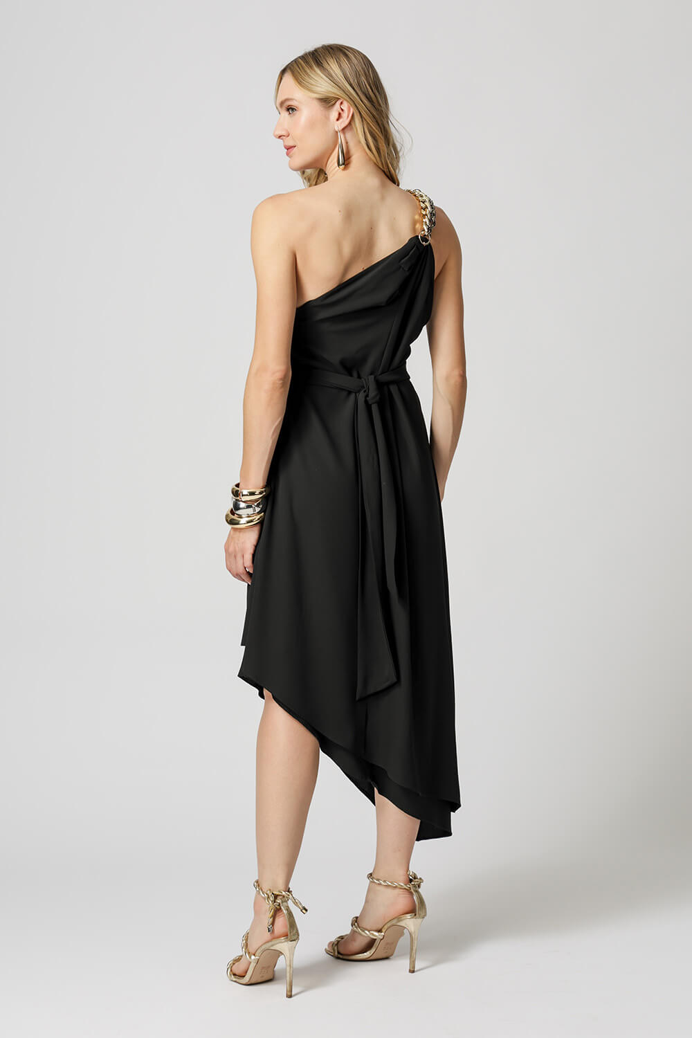 Elegante e moderno, este vestido com alça de corrente destaca o ombro único e barra assimétrica em um design sofisticado. Confeccionado em crepe fluido premium, oferece caimento leve e toque refinado para ocasiões especiais.