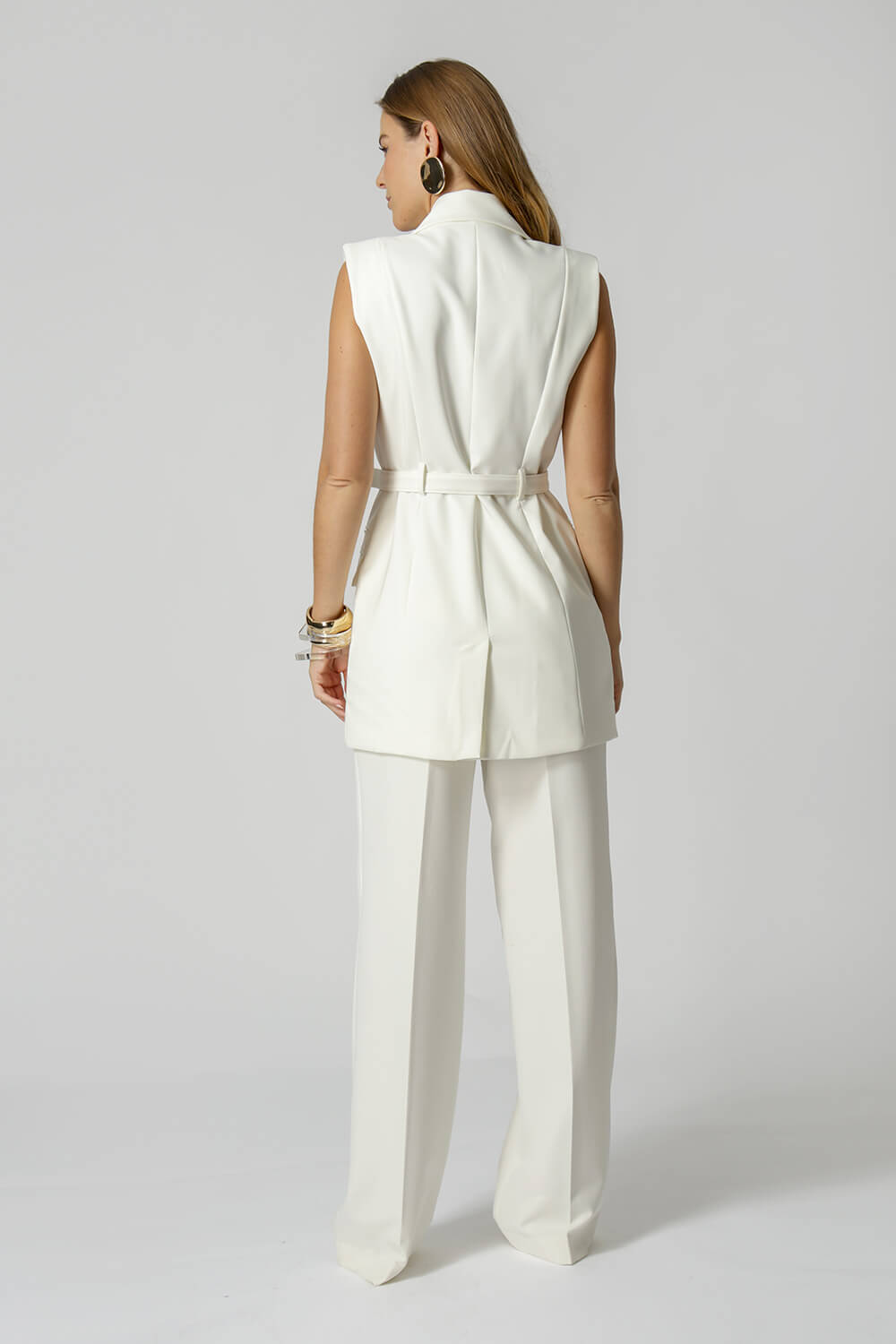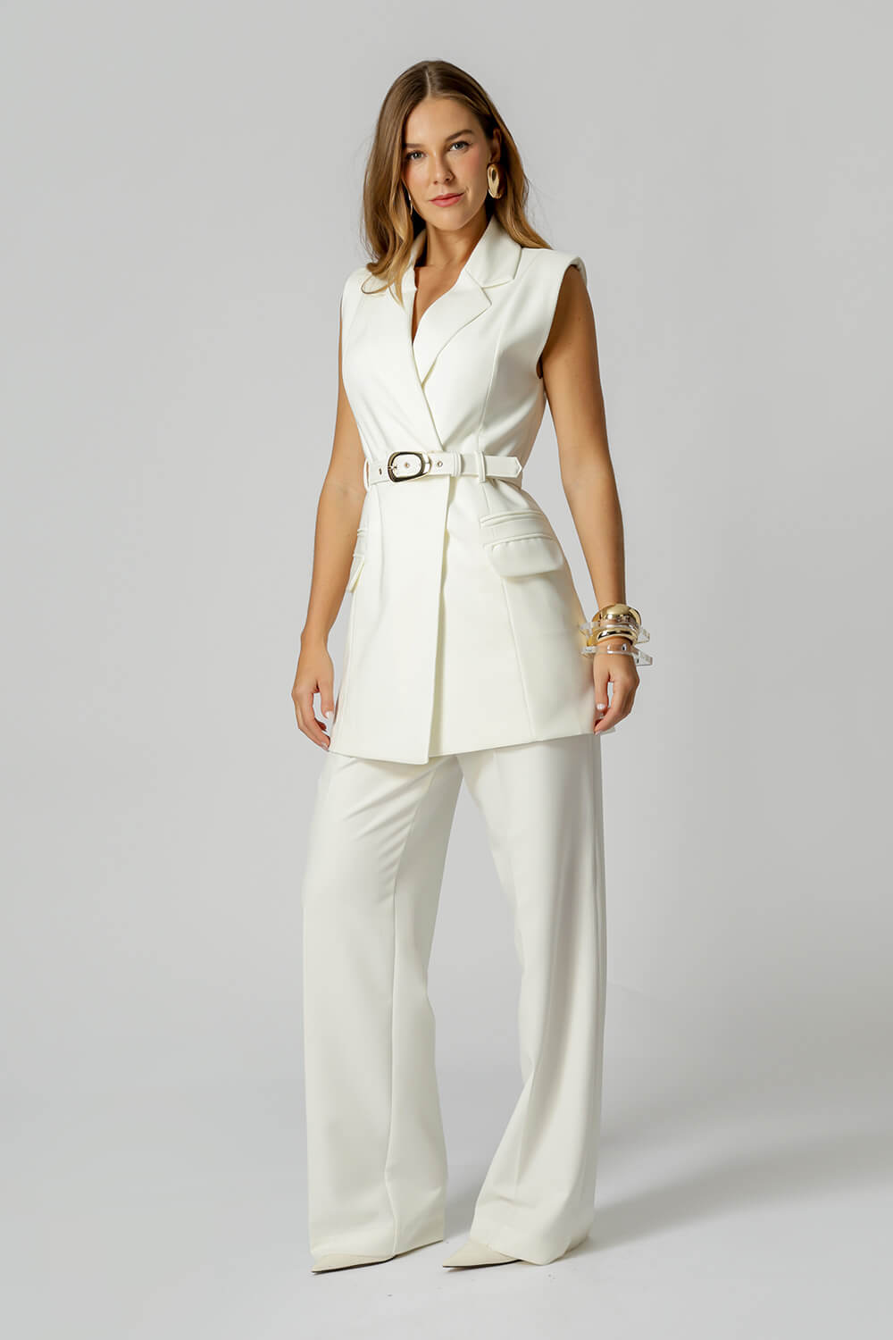 Vestido estilo colete em alfaiataria, com bolso funcional com lapela e cinto removível que define a silhueta. Peça versátil e elegante para diversas ocasiões.